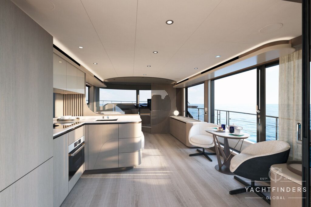Inside, the Navetta 50 introduces the new Absolute aesthetic, defined by light-toned woods. The interior starts with an open aft galley positioned to serve both the cockpit and saloon. Up two steps, the impressive saloon features full-height glazing, a three-sided sofa and a table to port, and a two-person sofa-cum-daybed to starboard, aft of the two-seat helm station with side door.