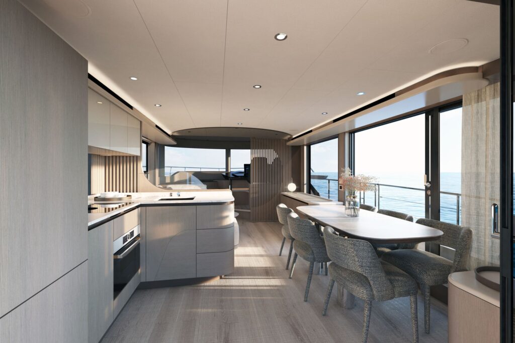 Based on a semi-displacement hull, the 58ft motoryacht’s most distinctive elements include the brand’s uniquely shaped ‘squircular’ bow windows, glazed cockpit gunwales to ensure unobstructed views, and reverse-angled aft hull sides to improve access to the water. In addition, integrated shading systems ensure privacy and comfort while at anchor.