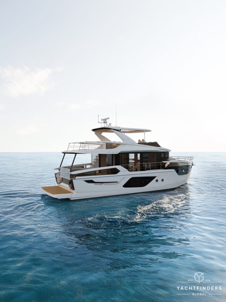 Based on a semi-displacement hull, the 58ft motoryacht’s most distinctive elements include the brand’s uniquely shaped ‘squircular’ bow windows, glazed cockpit gunwales to ensure unobstructed views, and reverse-angled aft hull sides to improve access to the water. In addition, integrated shading systems ensure privacy and comfort while at anchor.