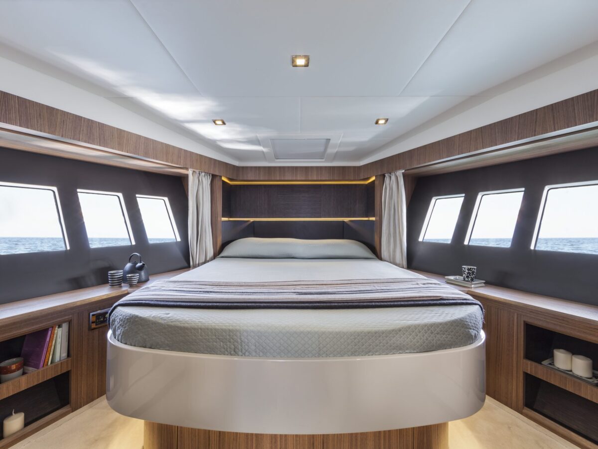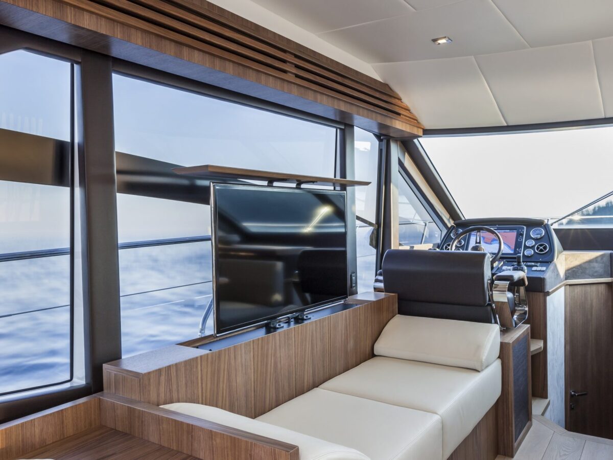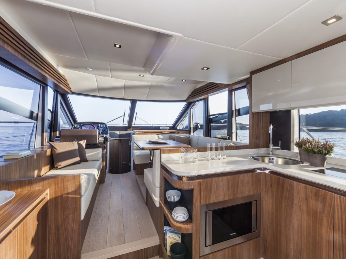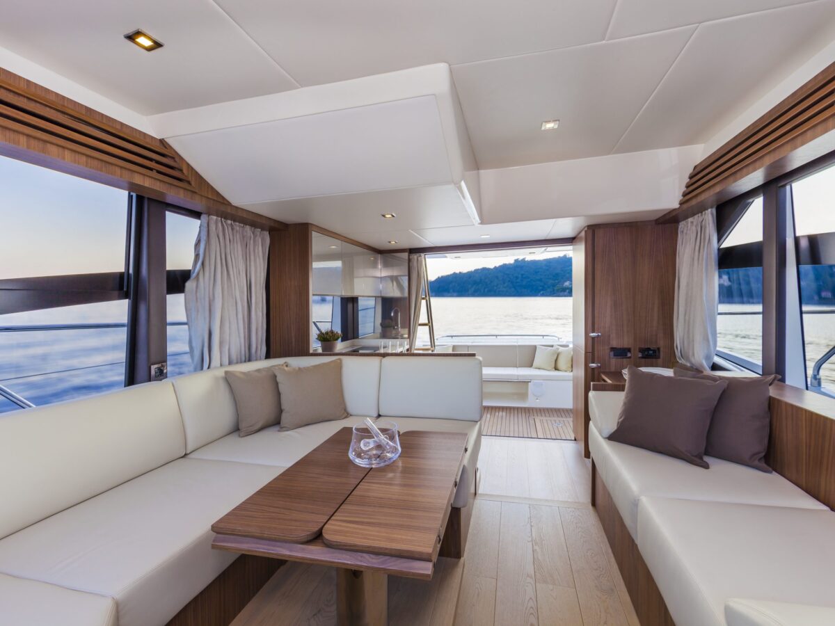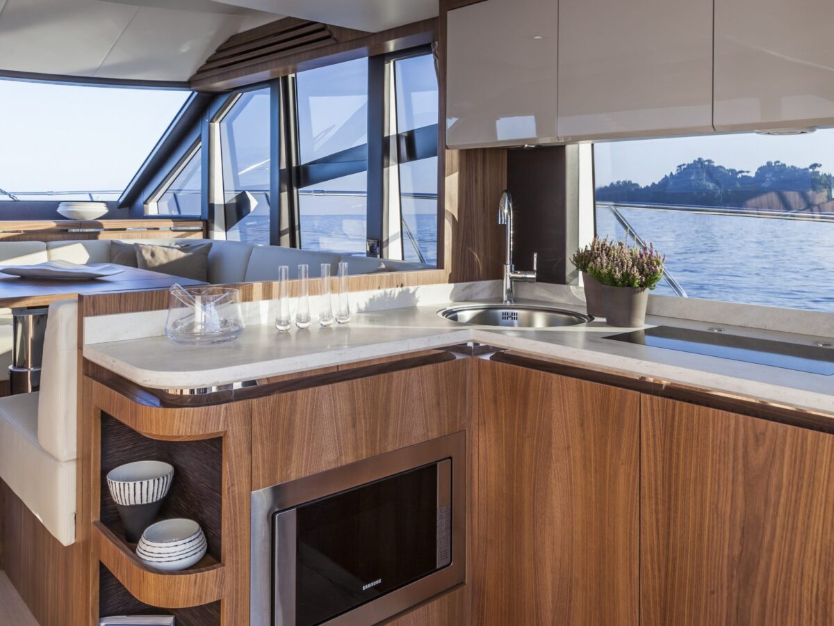 Moving from the cockpit to the interiors, you can appreciate the magnitude of the sliding door: its openness directly connects the interior living room and the galley with the outdoor cockpit sofa for maximum conviviality for everyone on board.