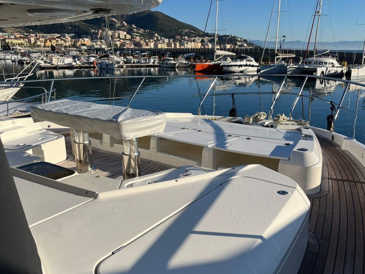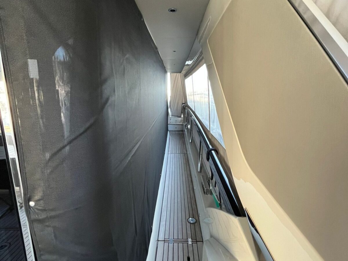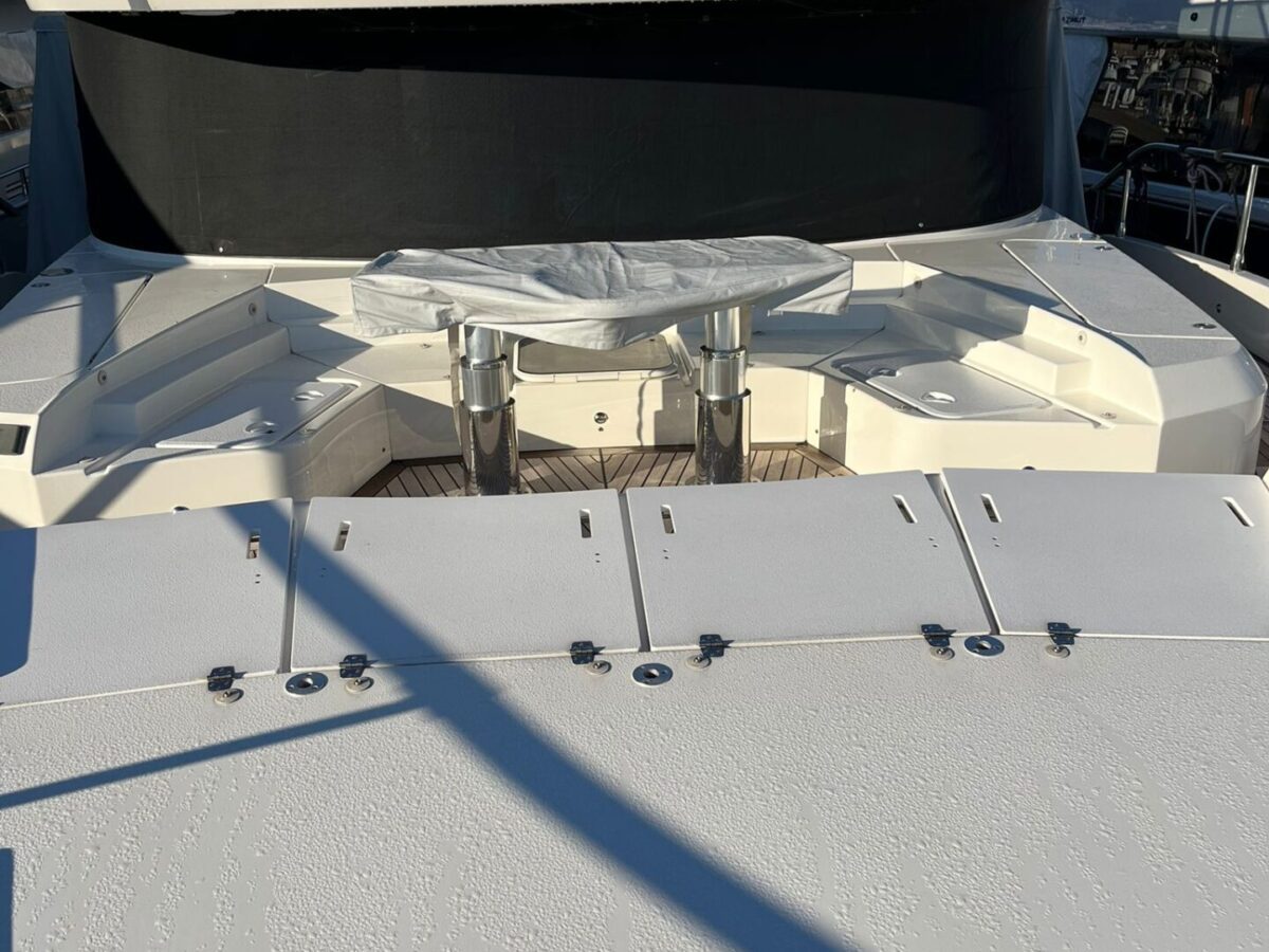 - Flybridge access stairs from the cockpit with solid teak steps, stainless steel handrail and courtesy lights.