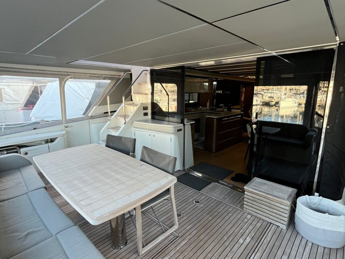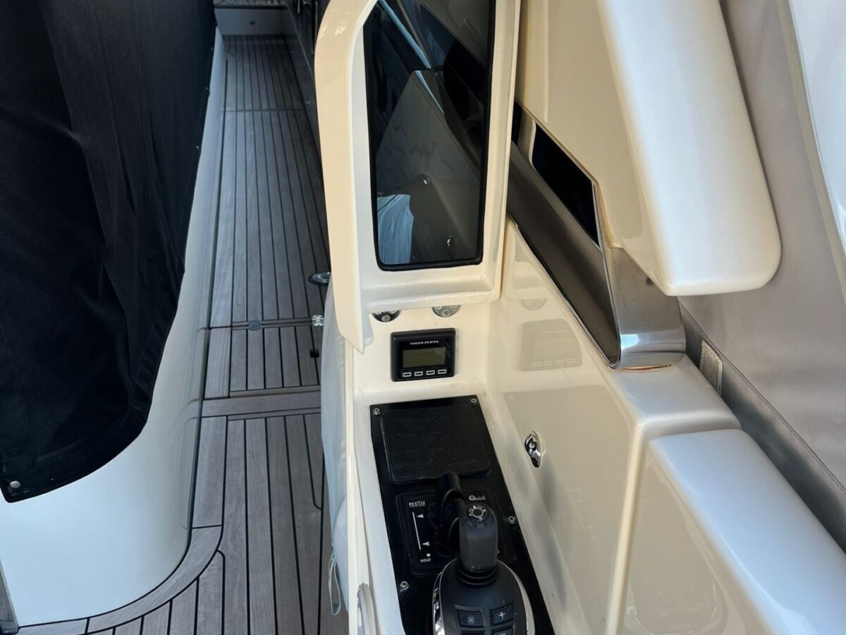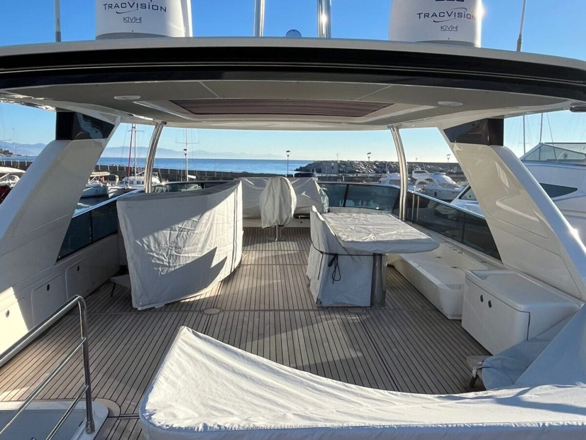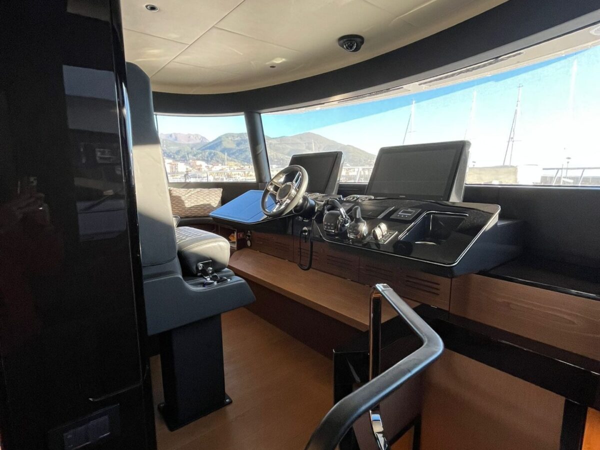 - Flybridge access stairs from the cockpit with solid teak steps, stainless steel handrail and courtesy lights.