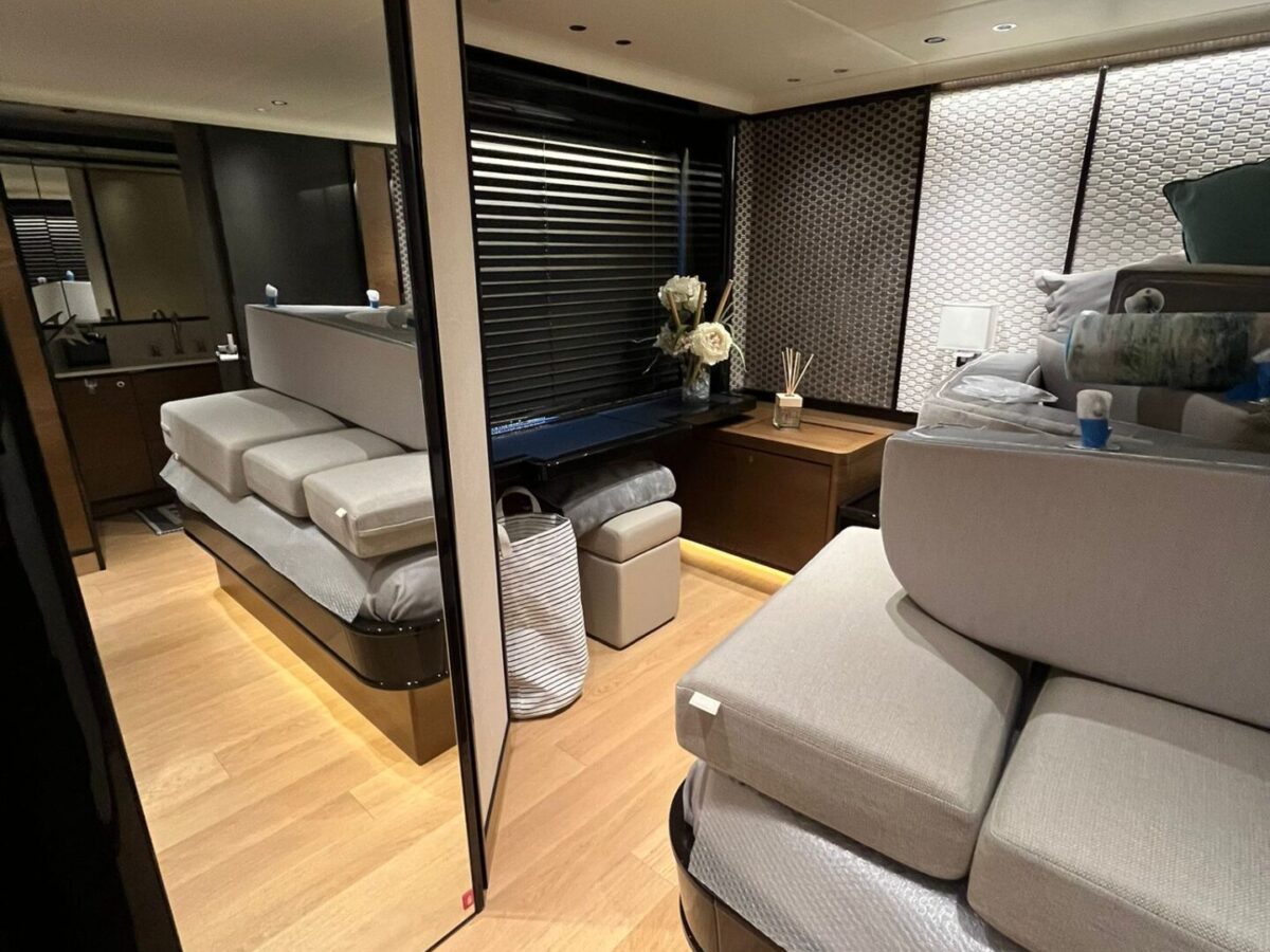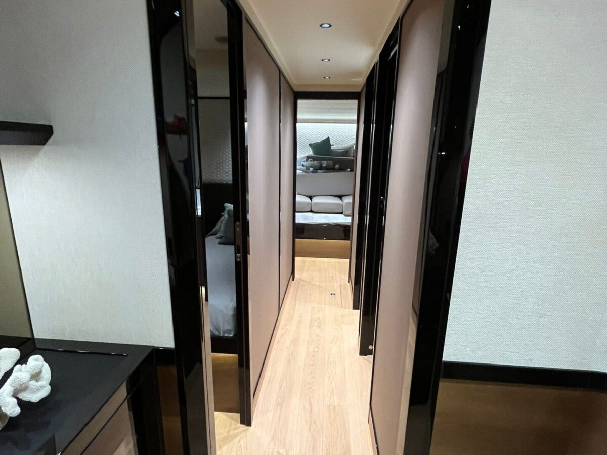 - Walls towards the bow coated with fluted elm with matt finishing and ivory colour straight velvet, with electrically openable section towards the wheelhouse.