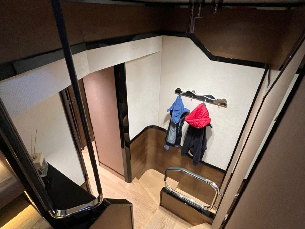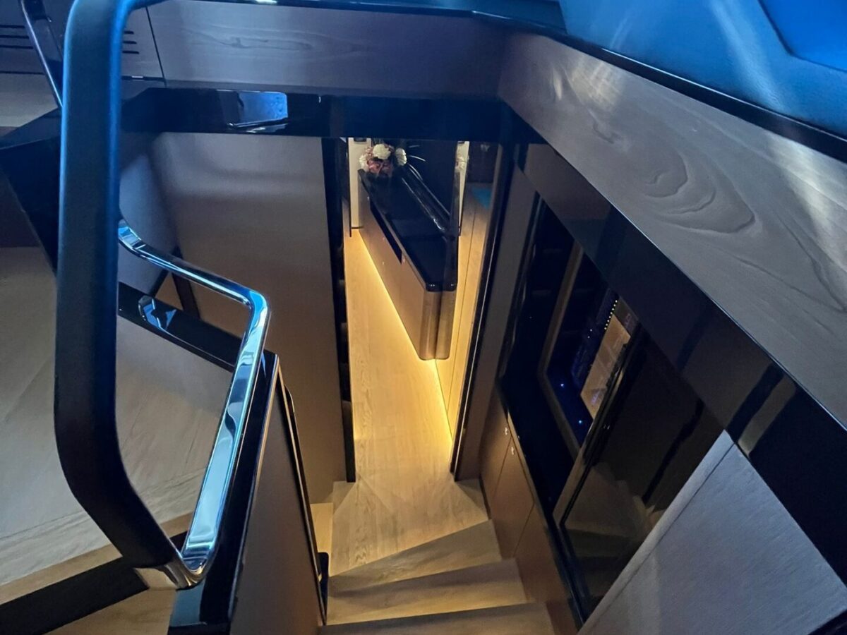 - Stairs to the lower deck, with leather covered stainless steel handrail.