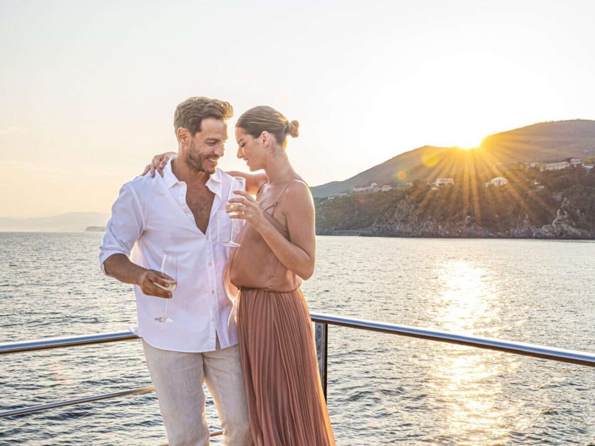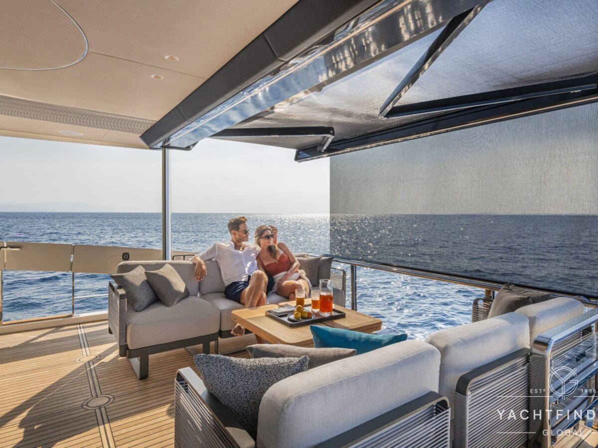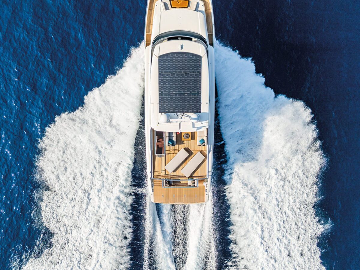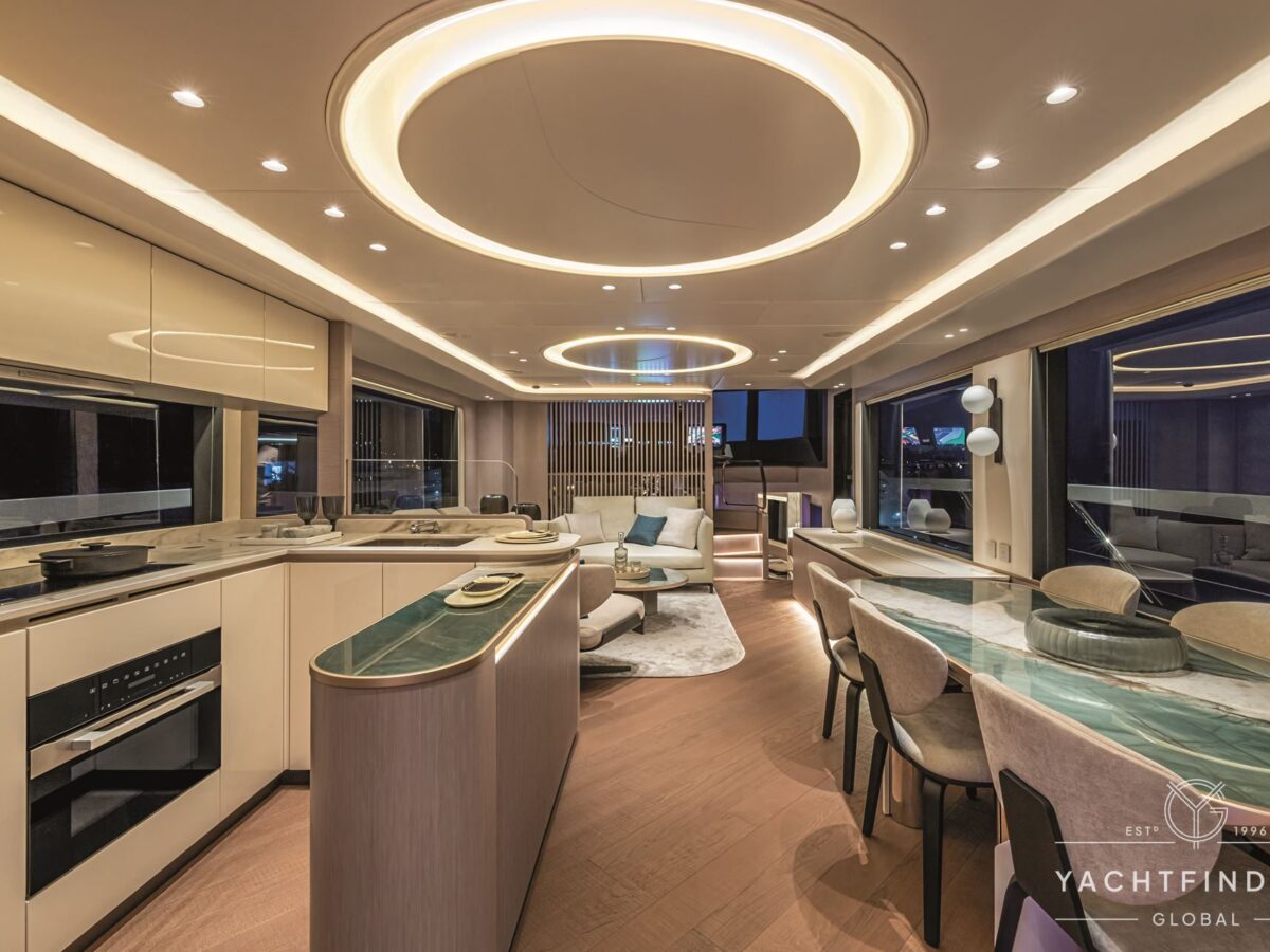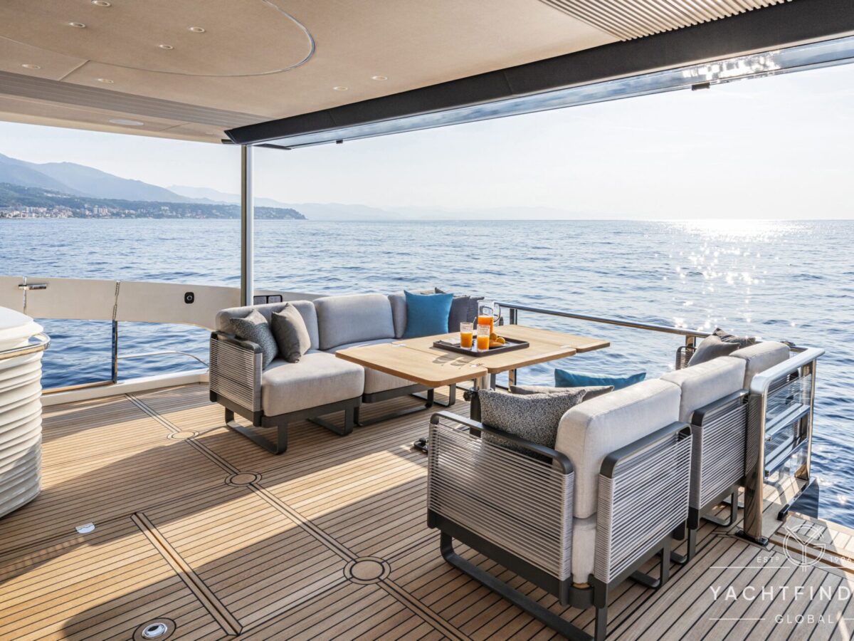 canopy, to the leisure area astern with designer furniture that can be rearranged to suit the occasion, whether aperitifs in the warm light of the setting sun, or a platform for late-night dancing. The same sense of generous space can be found on the cockpit terrace and the saloon with its free-standing table and large galley, enhanced by the use of stylish colours and the exquisite crafts skill of Italy’s finest artisans.