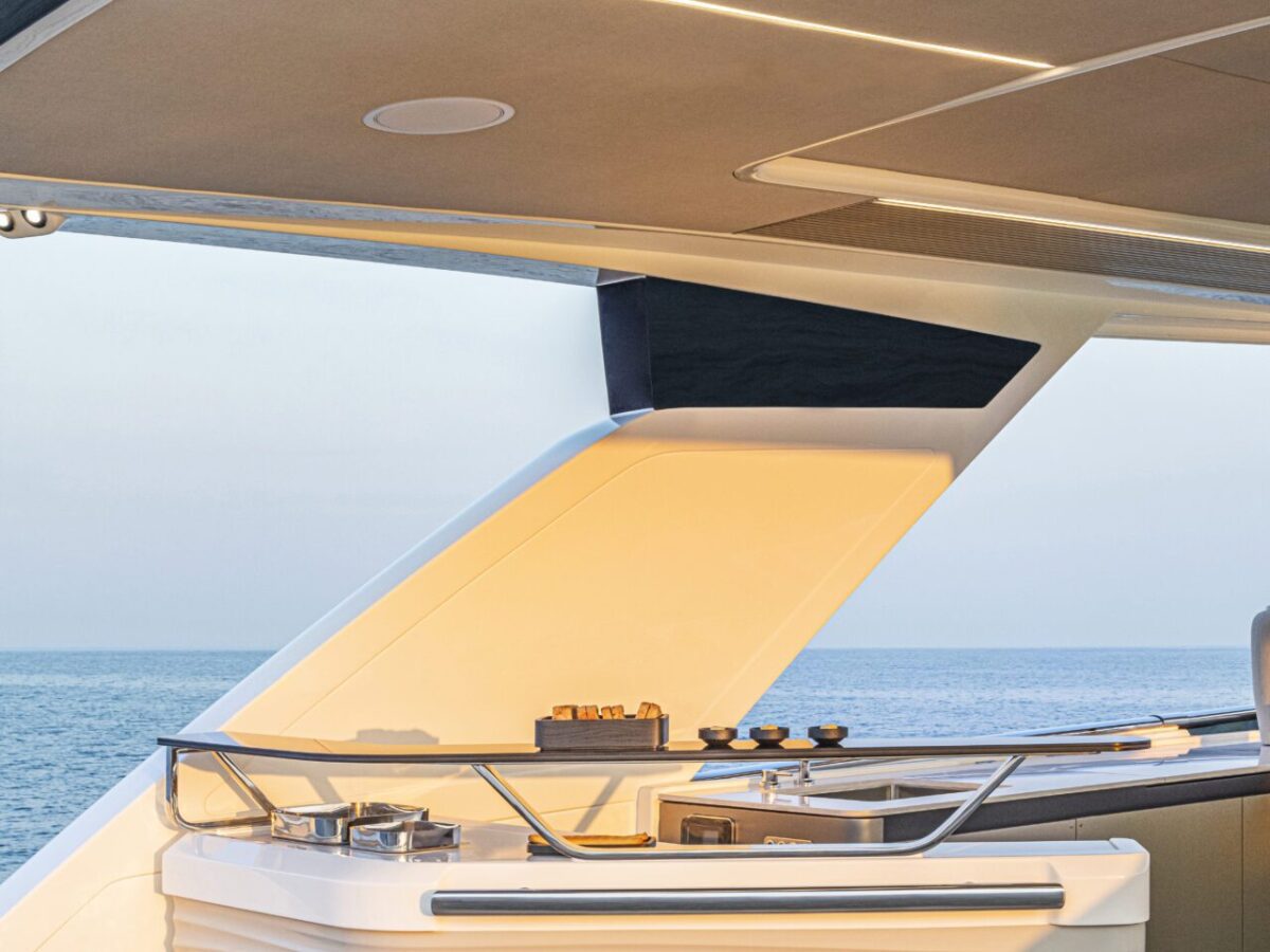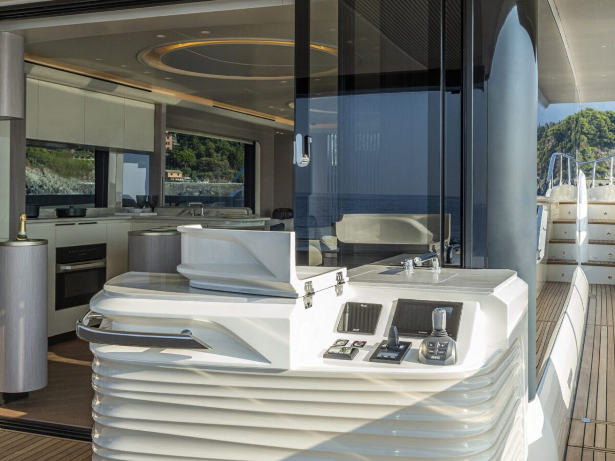 The flybridge of the new Navetta 70 offers a privileged setting, in two different versions A and B, from which to enjoy the infinite spectacle of the sea. It feels like part of a far larger yacht, with its progression of seamlessly integrated areas, from the forward helm station to a wet bar, outdoor galley and dining table for 6-8 guests in the shade offered by a retractable