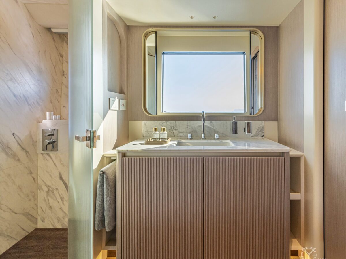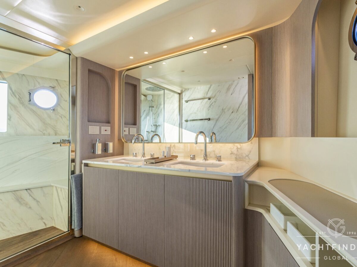 The Navetta 70 is a new design that represents a radical departure for the brand and the entire sector. Its interiors are supremely sensual and seductive, with bleached wood, tones of white, grey and black, rounded corners on the furnishing accessories, and bronze detailing expressing a sleek and glamorous look. Freedom of movement is ensured by floor levels with a minimal use of steps, high ceilings throughout, and space-saving sliding doors. A sense of continuity is provided by the circular motif used for ceiling decor and light fittings.