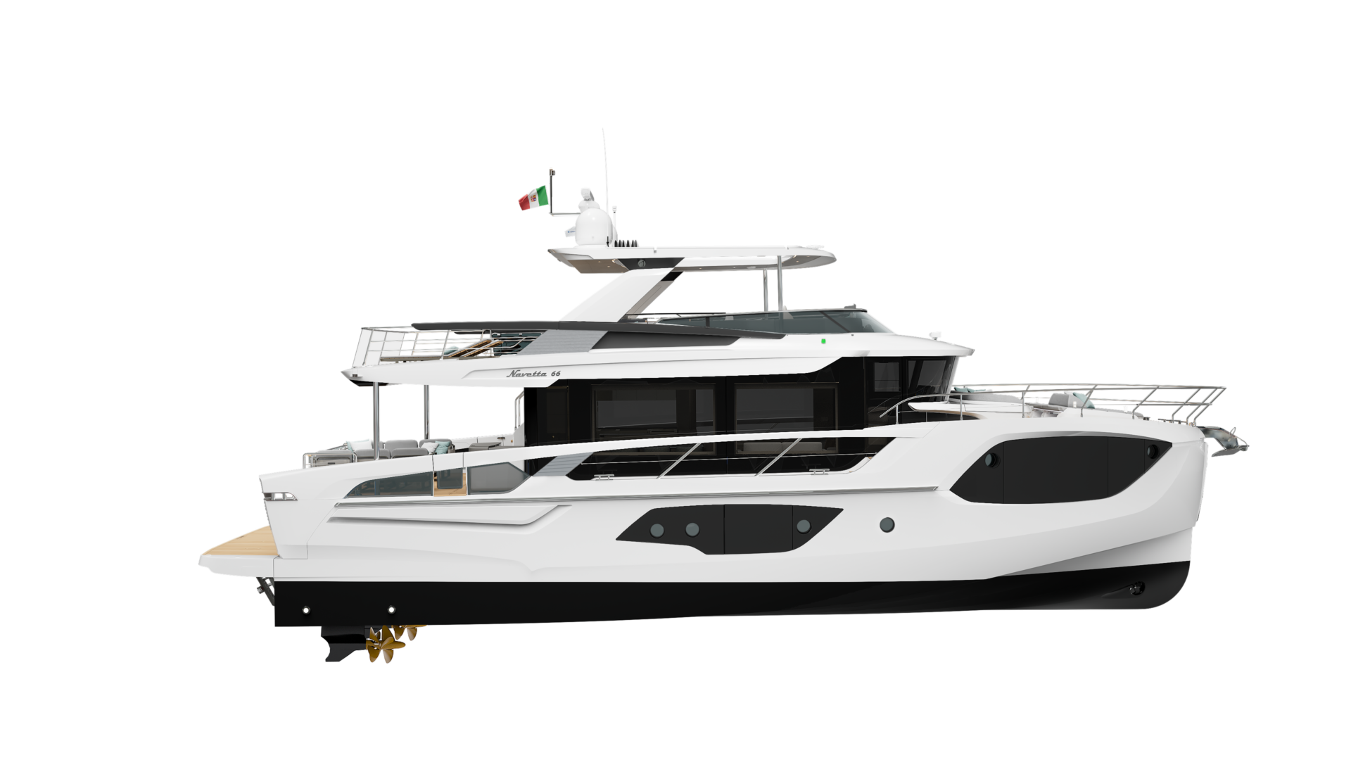 From the dynamic exterior looks of eye-catching glamour, the flybridge and cockpit terrace far larger than other comparable yachts, right through to the superb design of the interiors in a contemporary style featuring light colours and natural materials, every detail of the Absolute Navetta 70 expresses the allure of an entirely new model. Its vocation for luxury is heralded by its unmistakable looks, with Absolute’s hallmarks such as the iconic open lateral parapets with sloping columns, but much more besides: the architecture and design of a genuine trend icon.