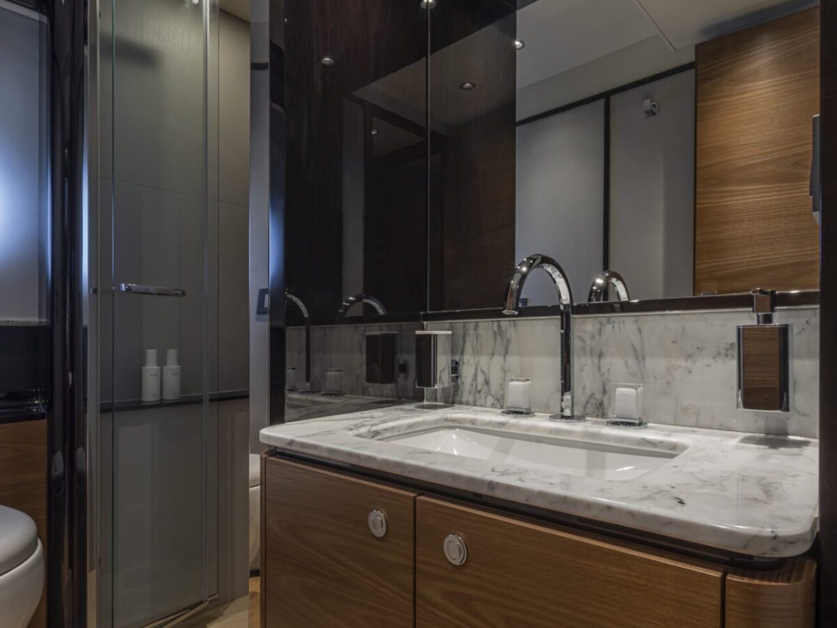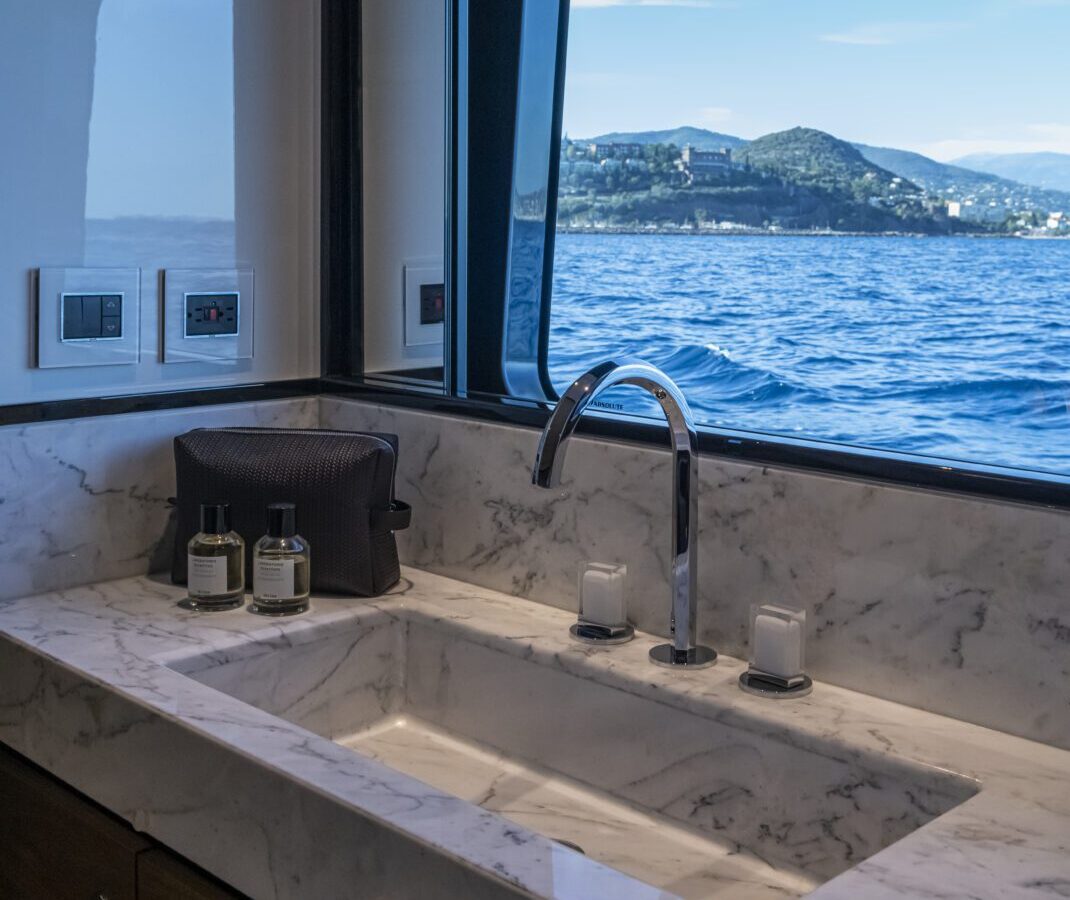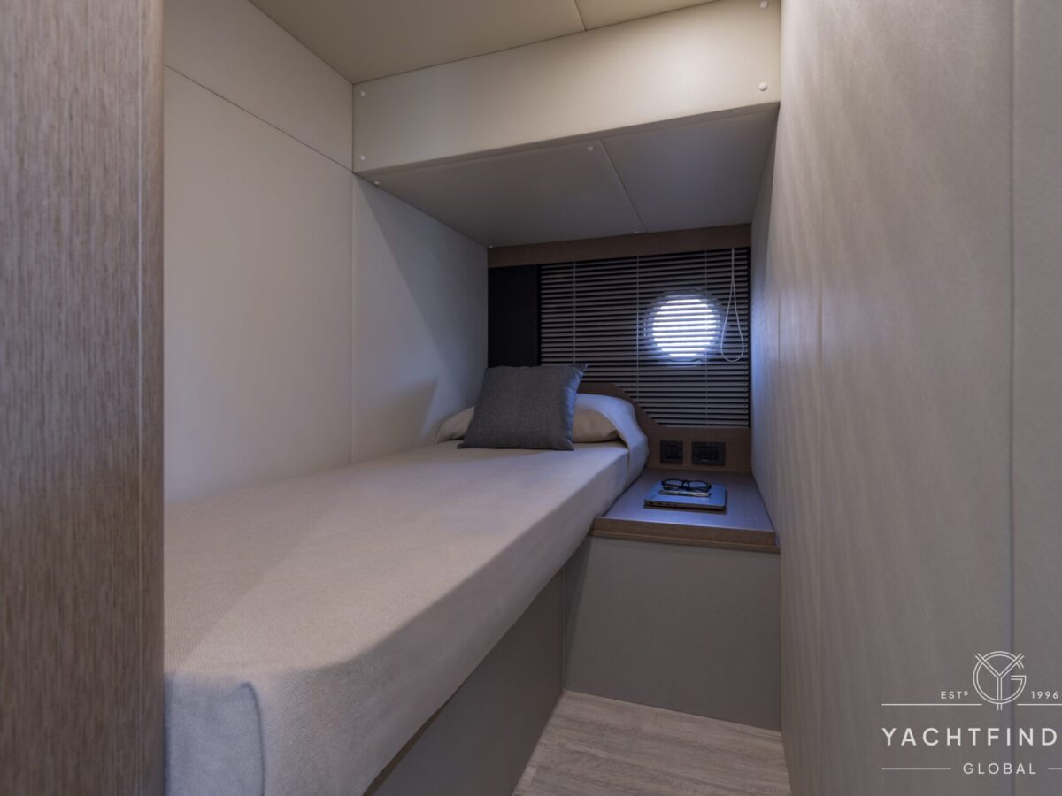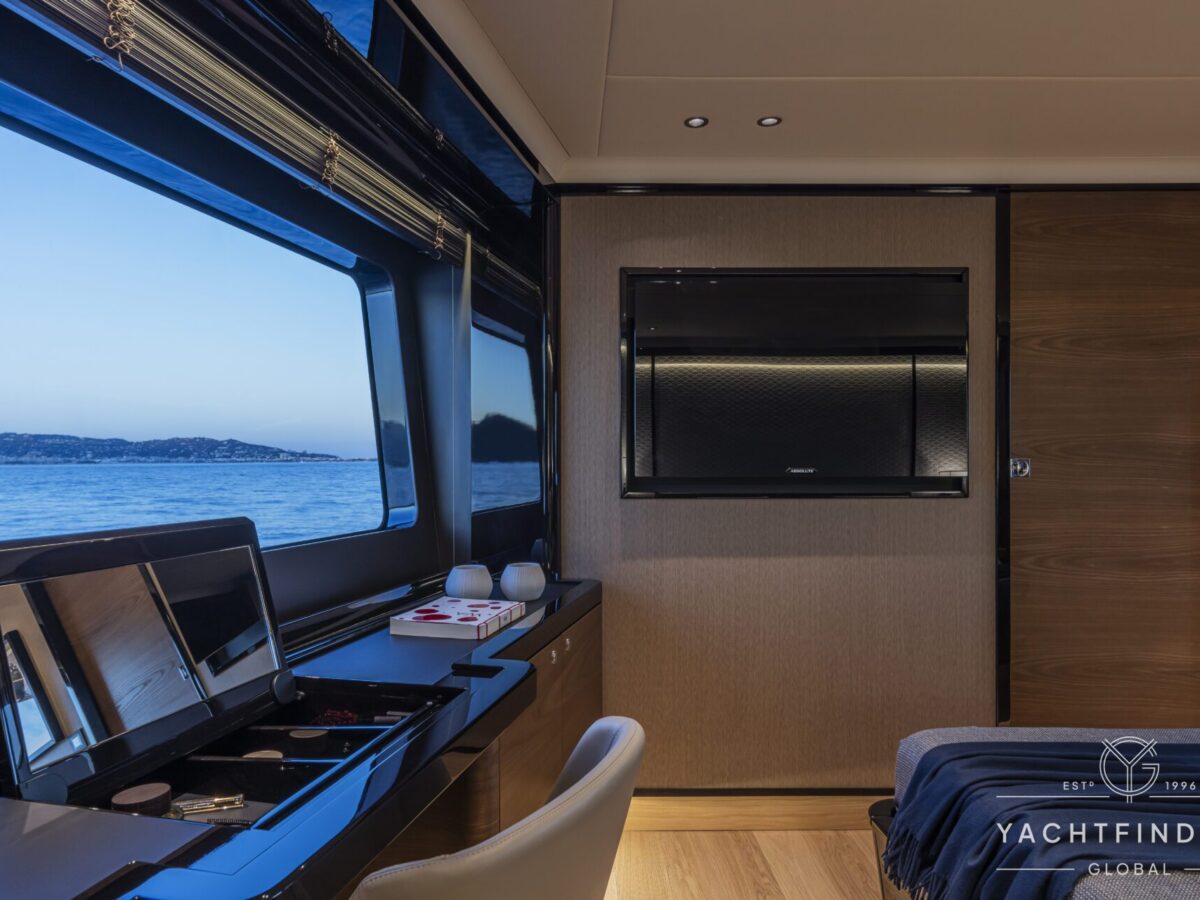 In line with the new Fly range concept introduced by the 60 FLY, the Absolute Prisma Navetta 75 brings on board a terrace cockpit and the owner’s cabin at the bow. The new flagship includes more of the shipyard’s iconic elements, including large windows, high ceilings and spaces designed on a single level, both on the main and lower decks. Another Absolute signature feature of Navetta 75 is the presence of side decks covered and accessible from the inside, both from the galley and the helm station, placed in a raised position for unparalleled maneuverability. Third and fourth mooring stations are strategically positioned for easy maneuvering to enhance the two steering consoles. Navetta 75 comes with two other highlights of the shipyard’s style: easy movement on board and ultimate privacy for the owners, their guests and crew. Indeed, from the main deck, you can easily access the flybridge from the aft and bow, thanks to two separate stairs. A dedicated crew area can be easily accessed from the cockpit without interrupting the owners and guests. In the stern, the captain’s and crew quarters are versatile and functional, accommodating up to three beds, a bathroom and a private galley.