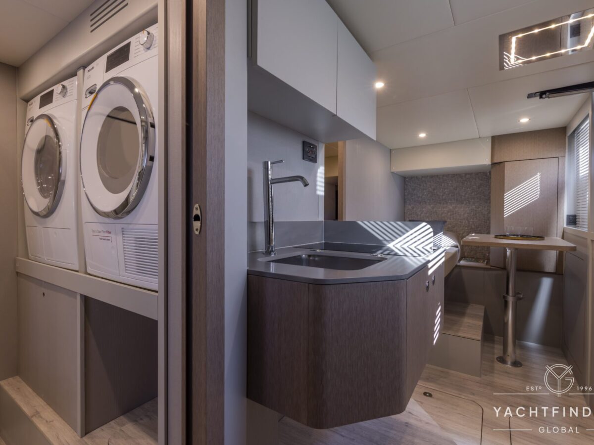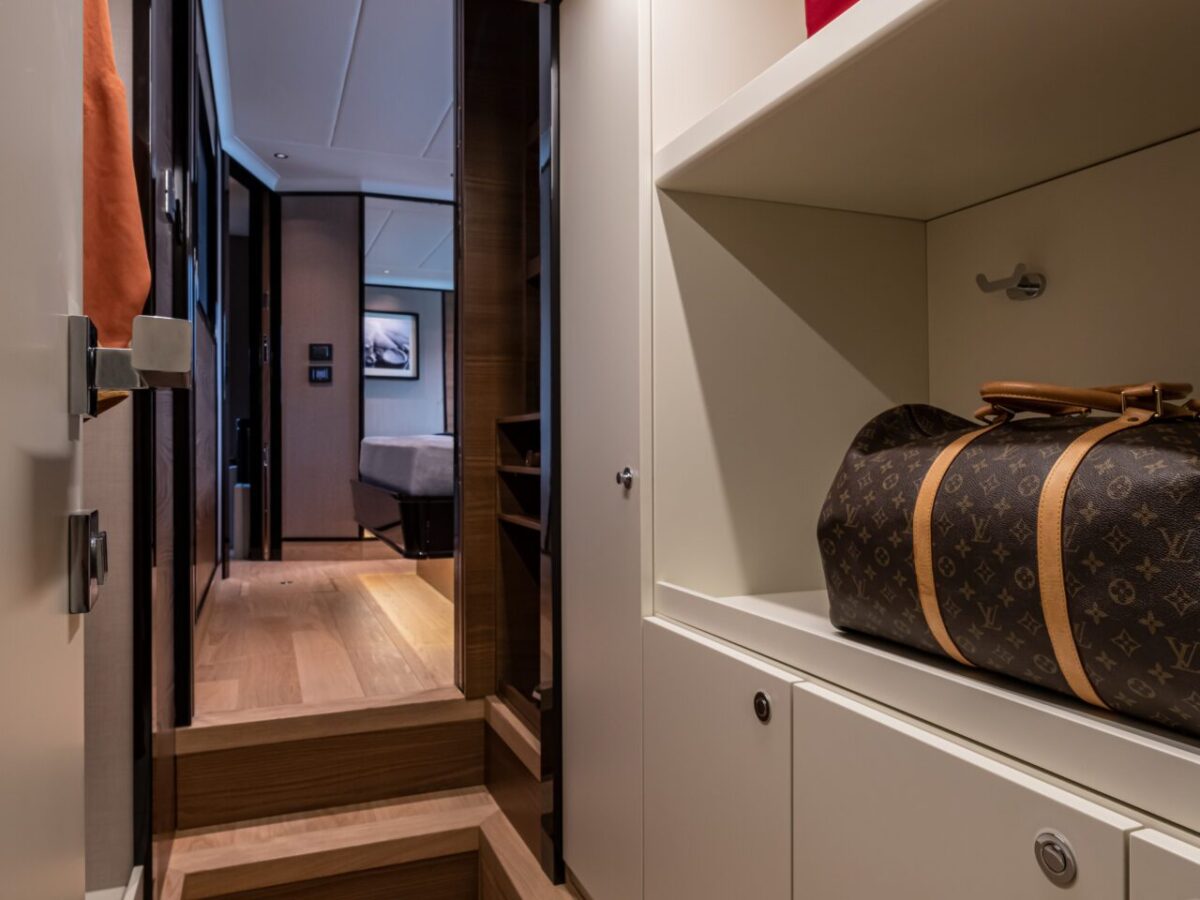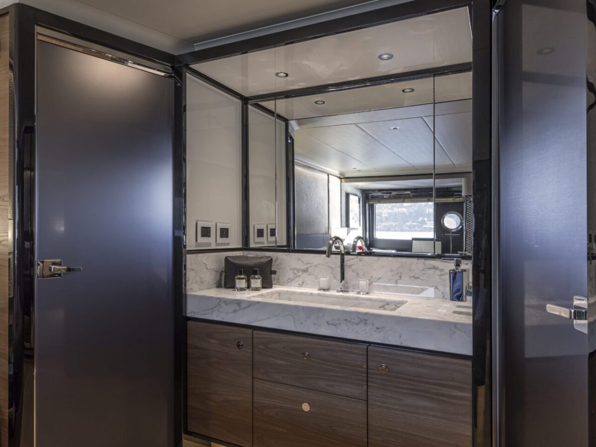 In line with the new Fly range concept introduced by the 60 FLY, the Absolute Prisma Navetta 75 brings on board a terrace cockpit and the owner’s cabin at the bow. The new flagship includes more of the shipyard’s iconic elements, including large windows, high ceilings and spaces designed on a single level, both on the main and lower decks. Another Absolute signature feature of Navetta 75 is the presence of side decks covered and accessible from the inside, both from the galley and the helm station, placed in a raised position for unparalleled maneuverability. Third and fourth mooring stations are strategically positioned for easy maneuvering to enhance the two steering consoles. Navetta 75 comes with two other highlights of the shipyard’s style: easy movement on board and ultimate privacy for the owners, their guests and crew. Indeed, from the main deck, you can easily access the flybridge from the aft and bow, thanks to two separate stairs. A dedicated crew area can be easily accessed from the cockpit without interrupting the owners and guests. In the stern, the captain’s and crew quarters are versatile and functional, accommodating up to three beds, a bathroom and a private galley.