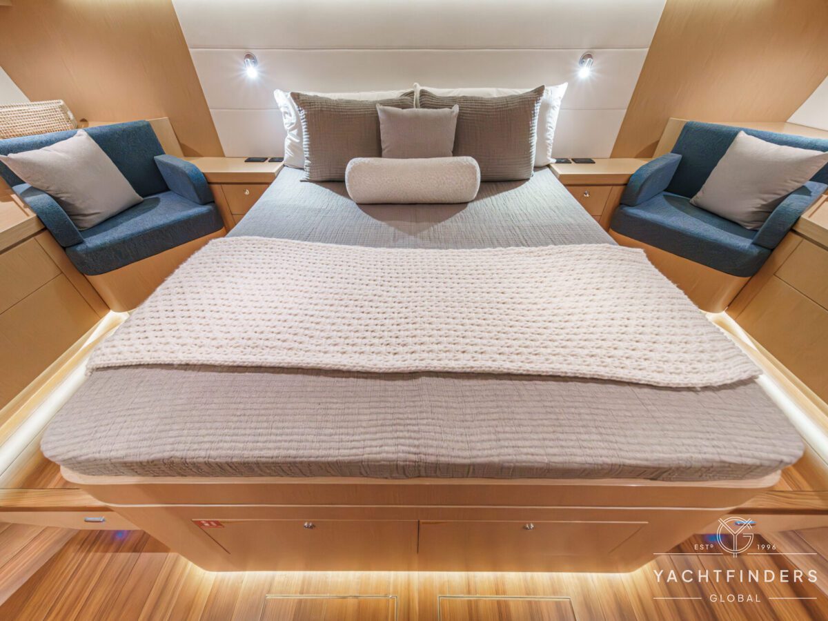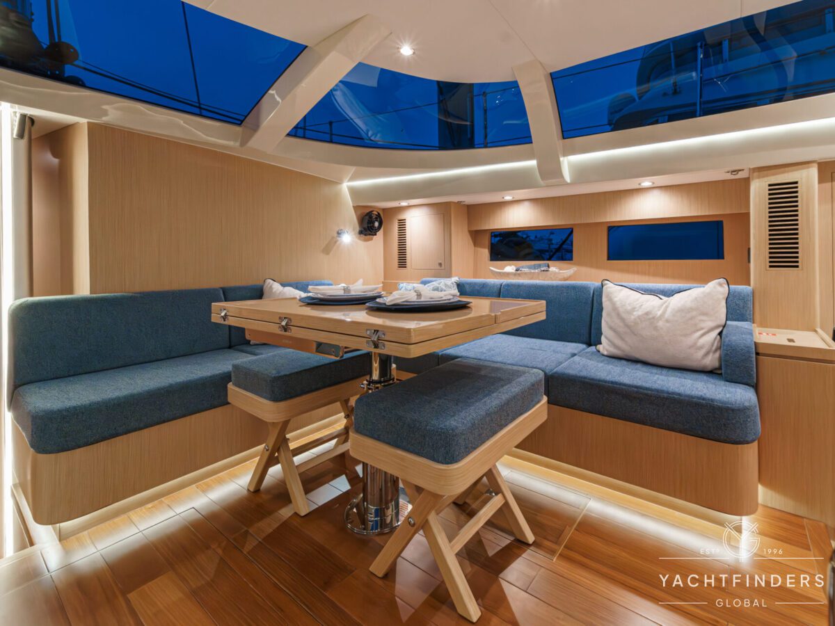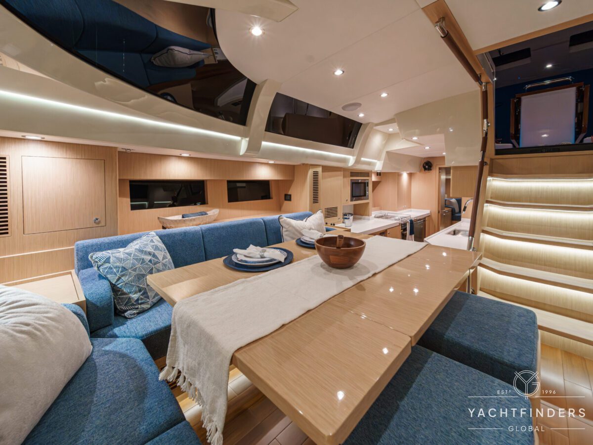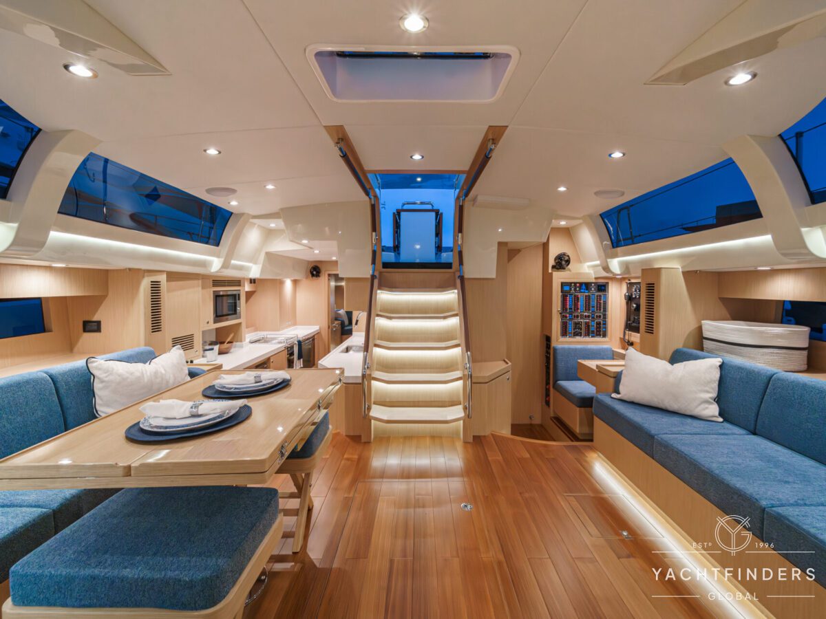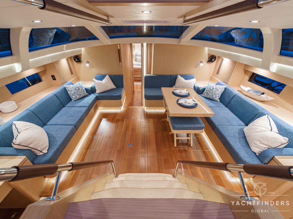 Below decks, the bright and voluminous three-cabin interior is warm and welcoming. Natural light abounds, and the layout is configured for luxurious comfort and an enjoyable living experience underway, while providing a true sense of home when settled at your destination. No horizon is too distant for this award-winning performance cruiser.