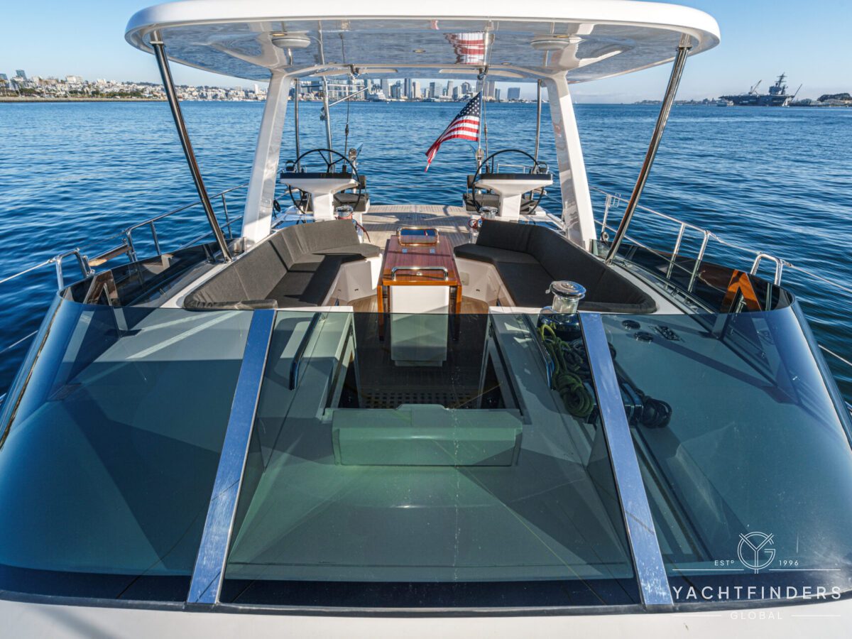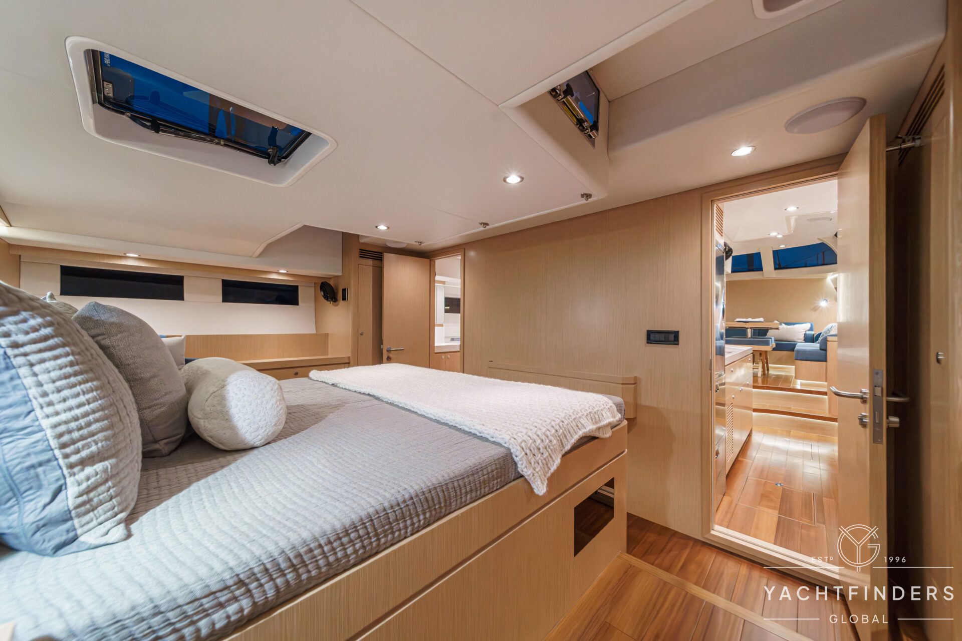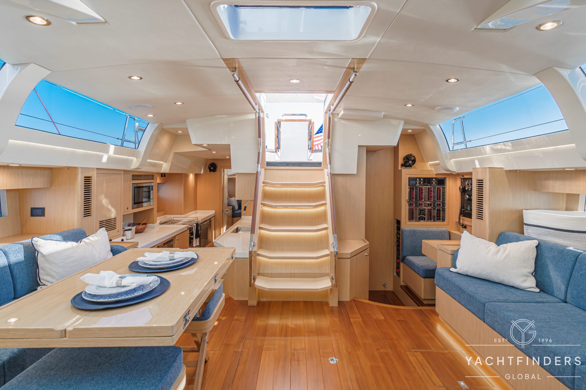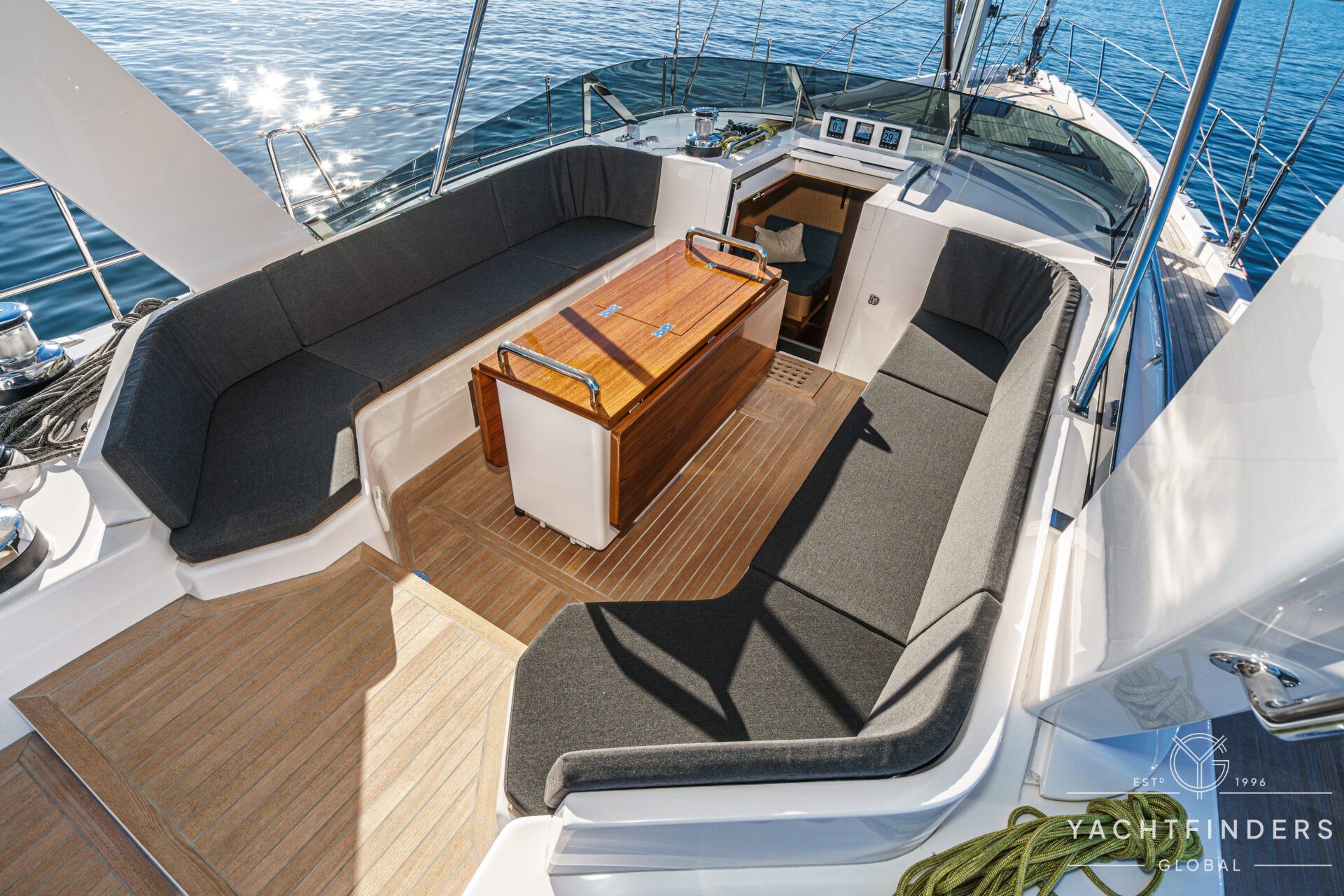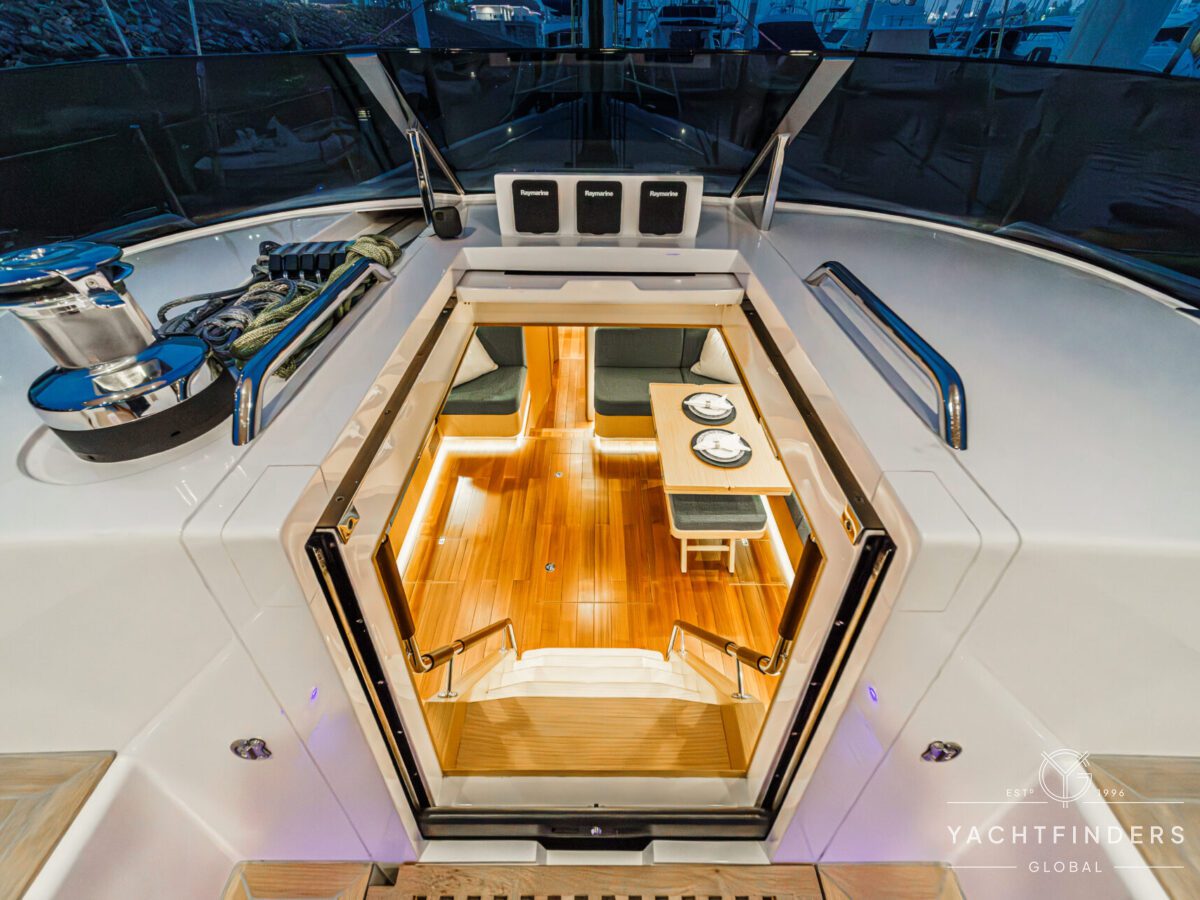 Below decks, the bright and voluminous three-cabin interior is warm and welcoming. Natural light abounds, and the layout is configured for luxurious comfort and an enjoyable living experience underway, while providing a true sense of home when settled at your destination. No horizon is too distant for this award-winning performance cruiser.