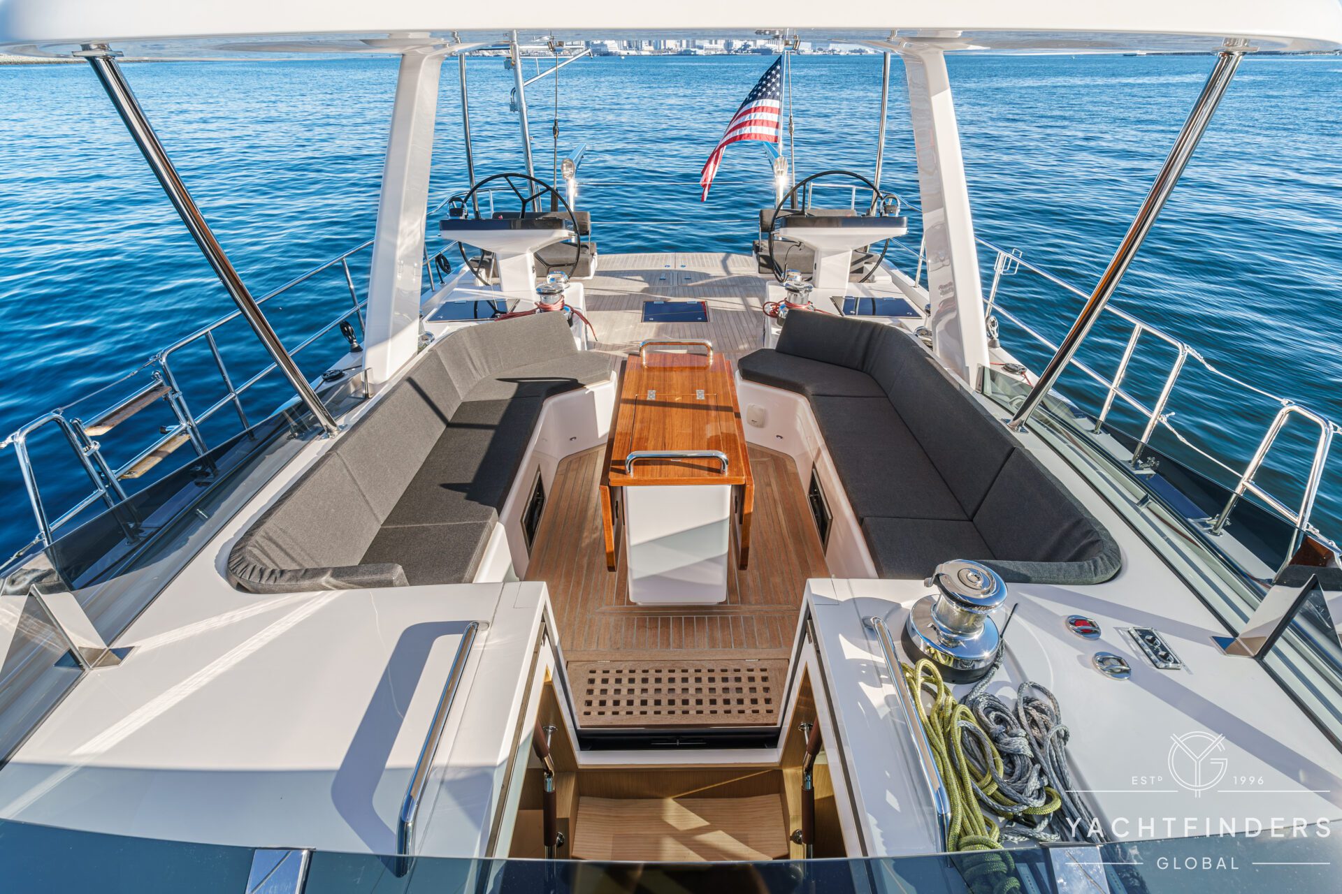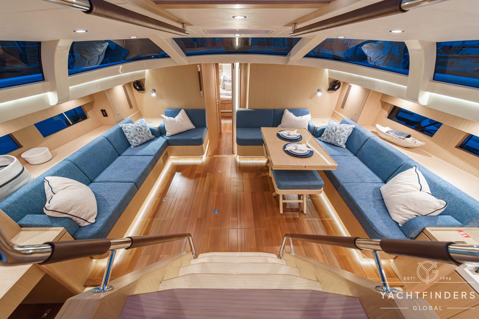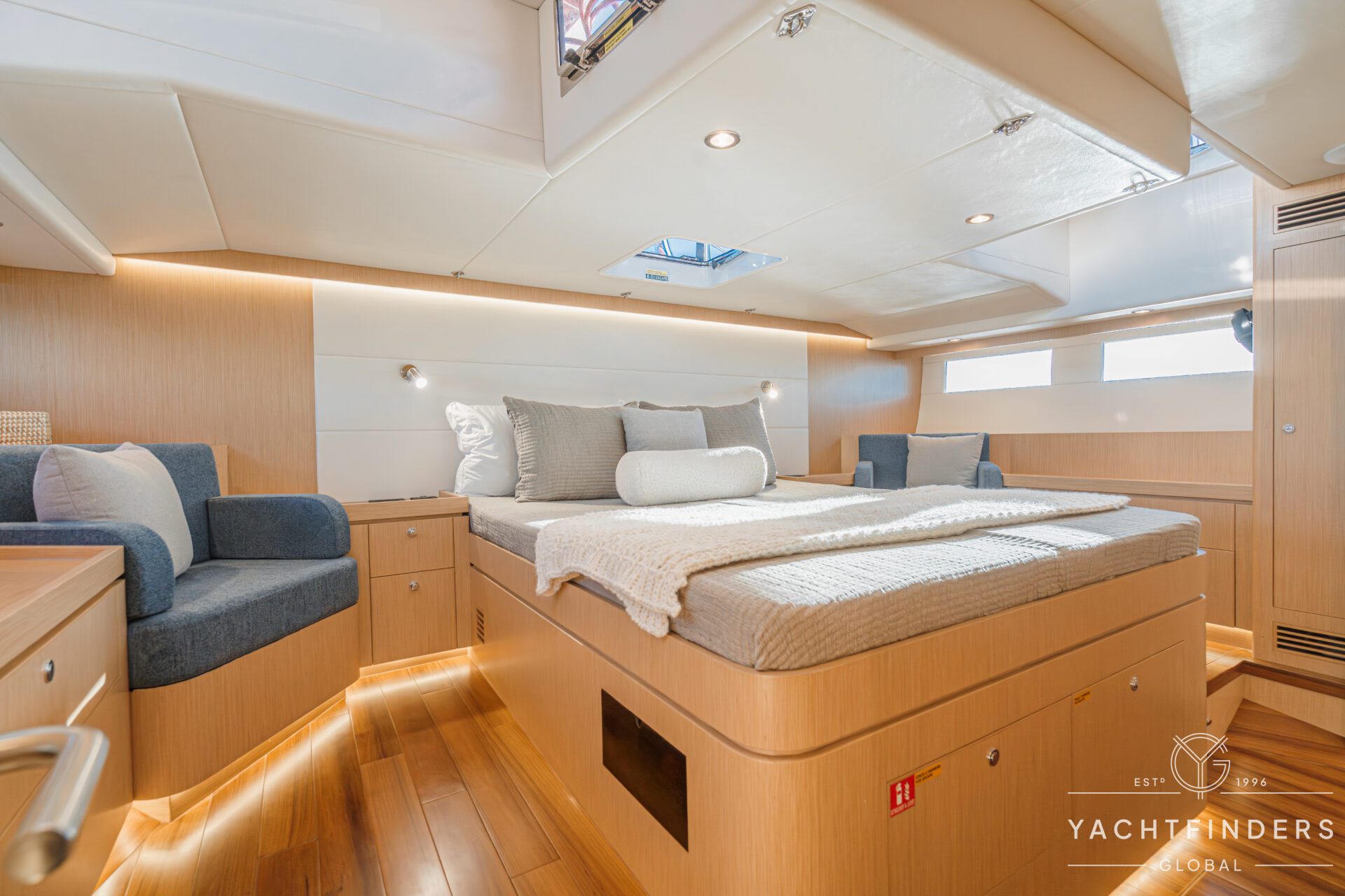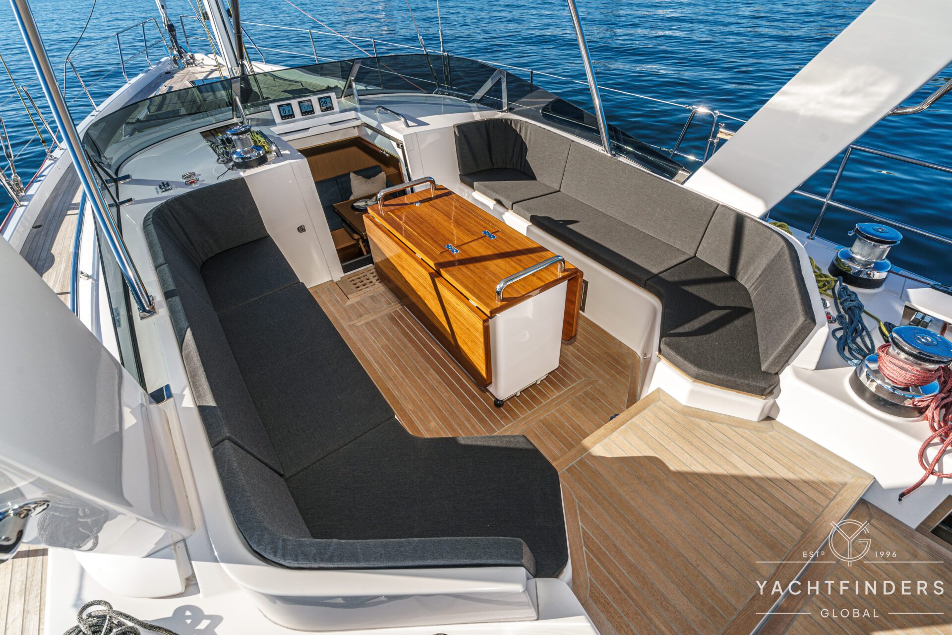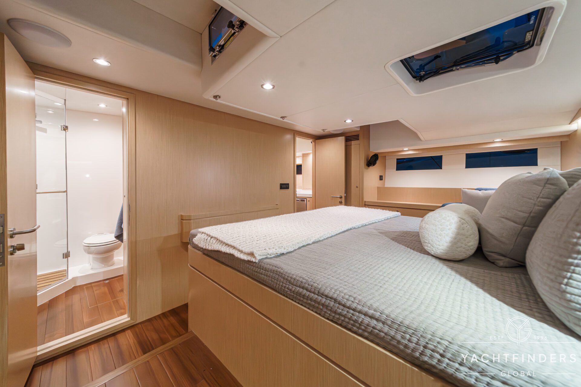 Below decks, the bright and voluminous three-cabin interior is warm and welcoming. Natural light abounds, and the layout is configured for luxurious comfort and an enjoyable living experience underway, while providing a true sense of home when settled at your destination. No horizon is too distant for this award-winning performance cruiser.