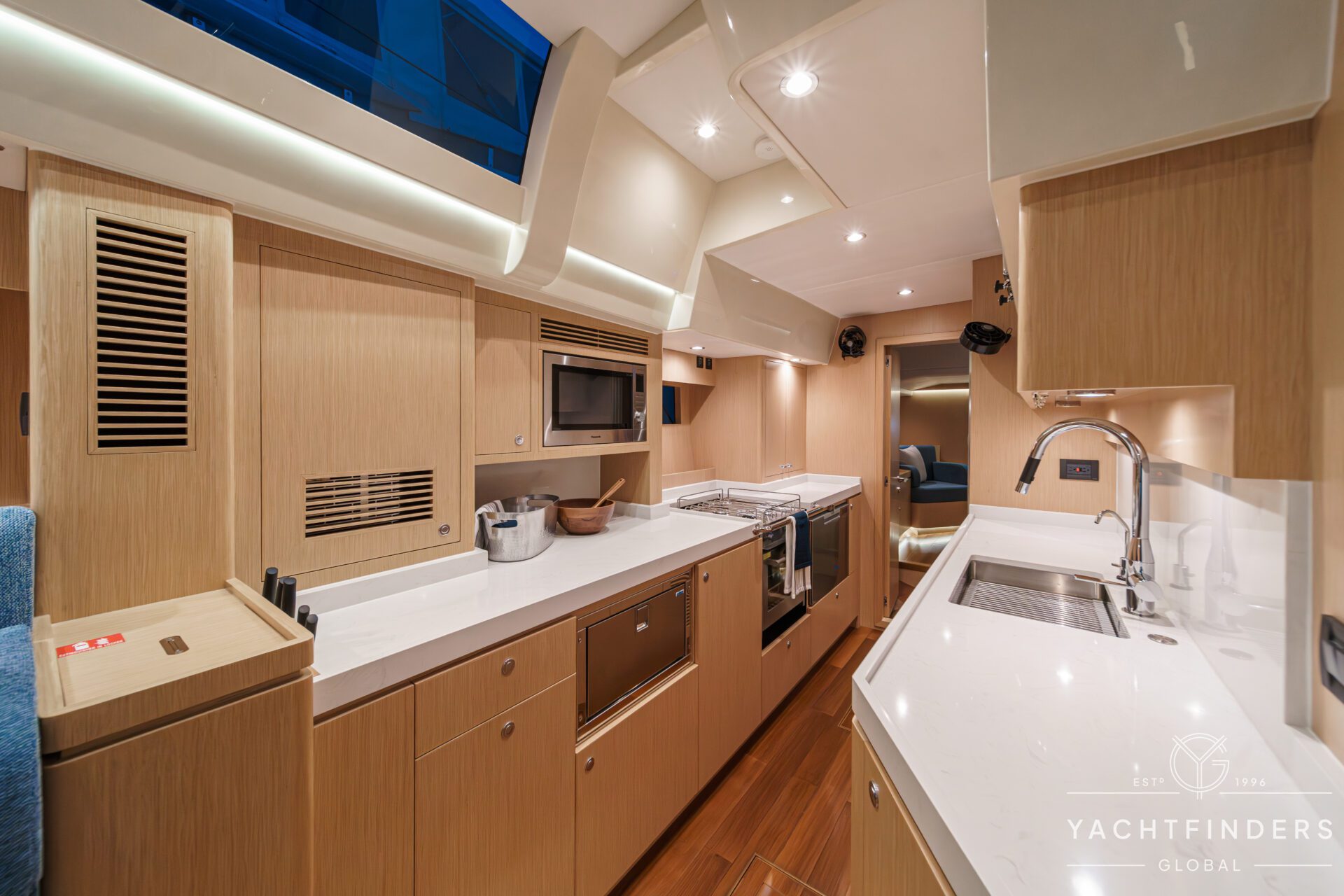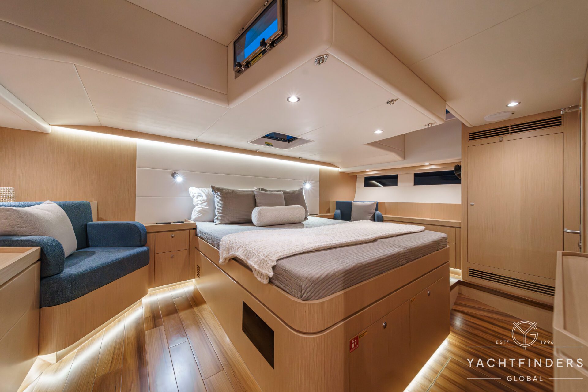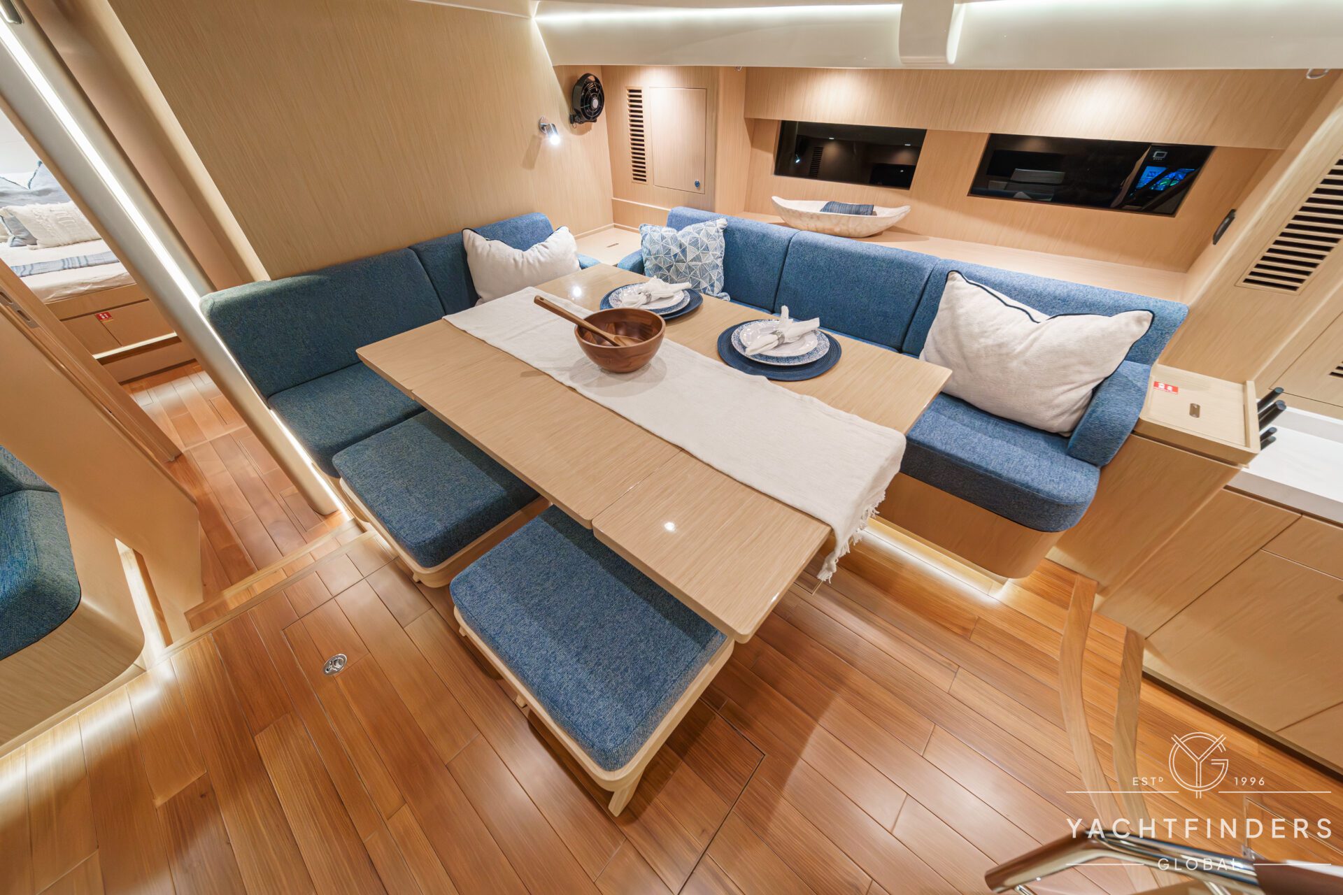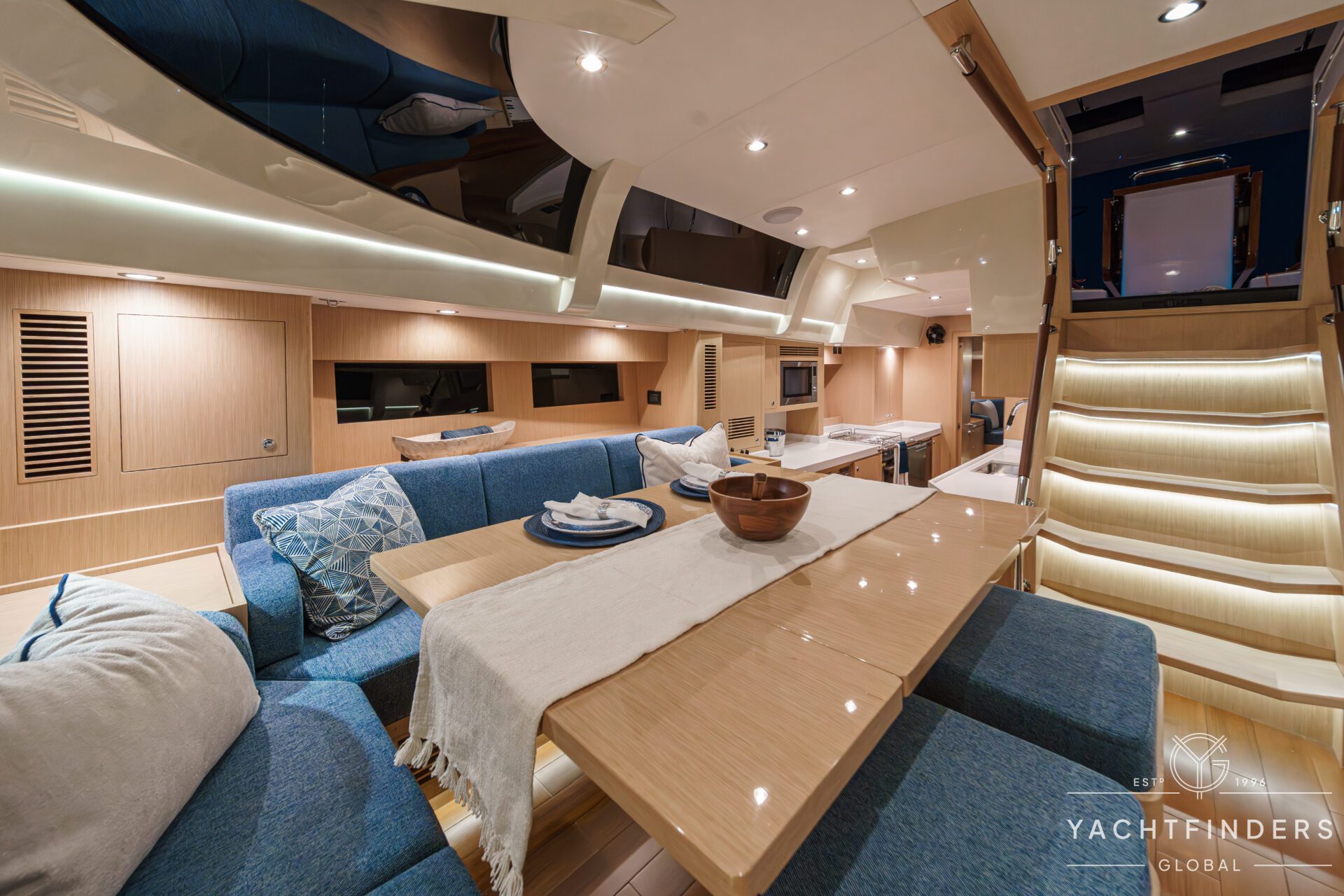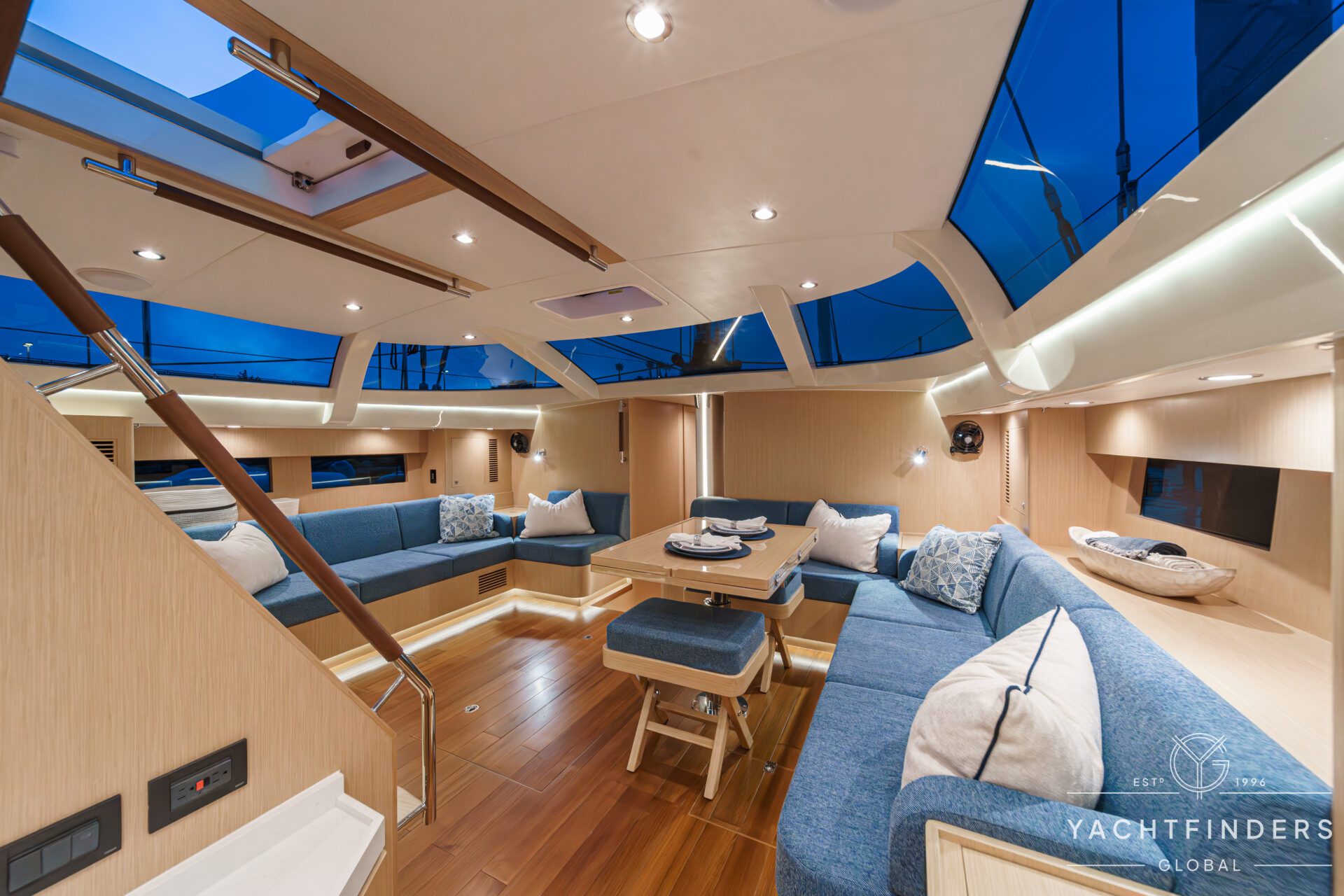 Below decks, the bright and voluminous three-cabin interior is warm and welcoming. Natural light abounds, and the layout is configured for luxurious comfort and an enjoyable living experience underway, while providing a true sense of home when settled at your destination. No horizon is too distant for this award-winning performance cruiser.