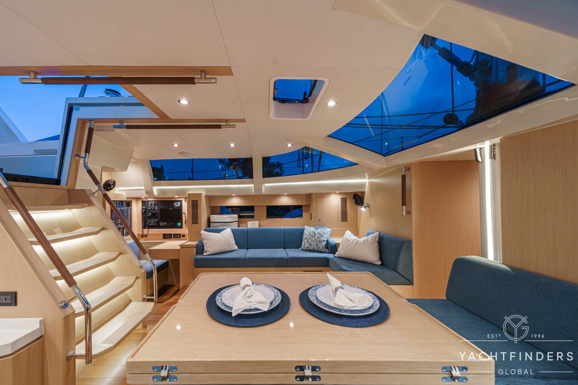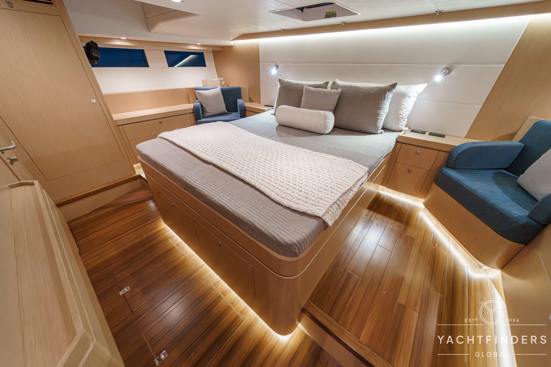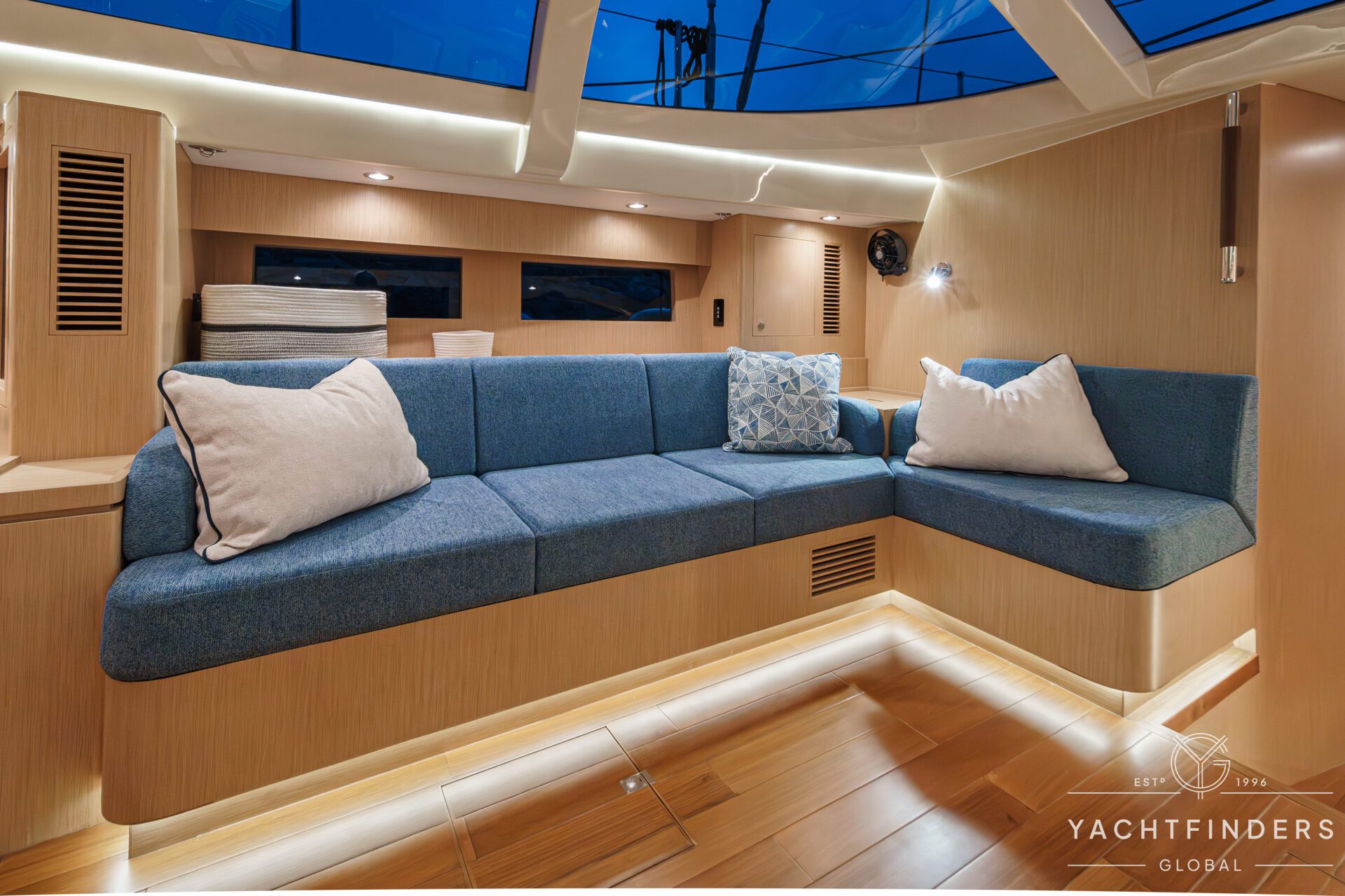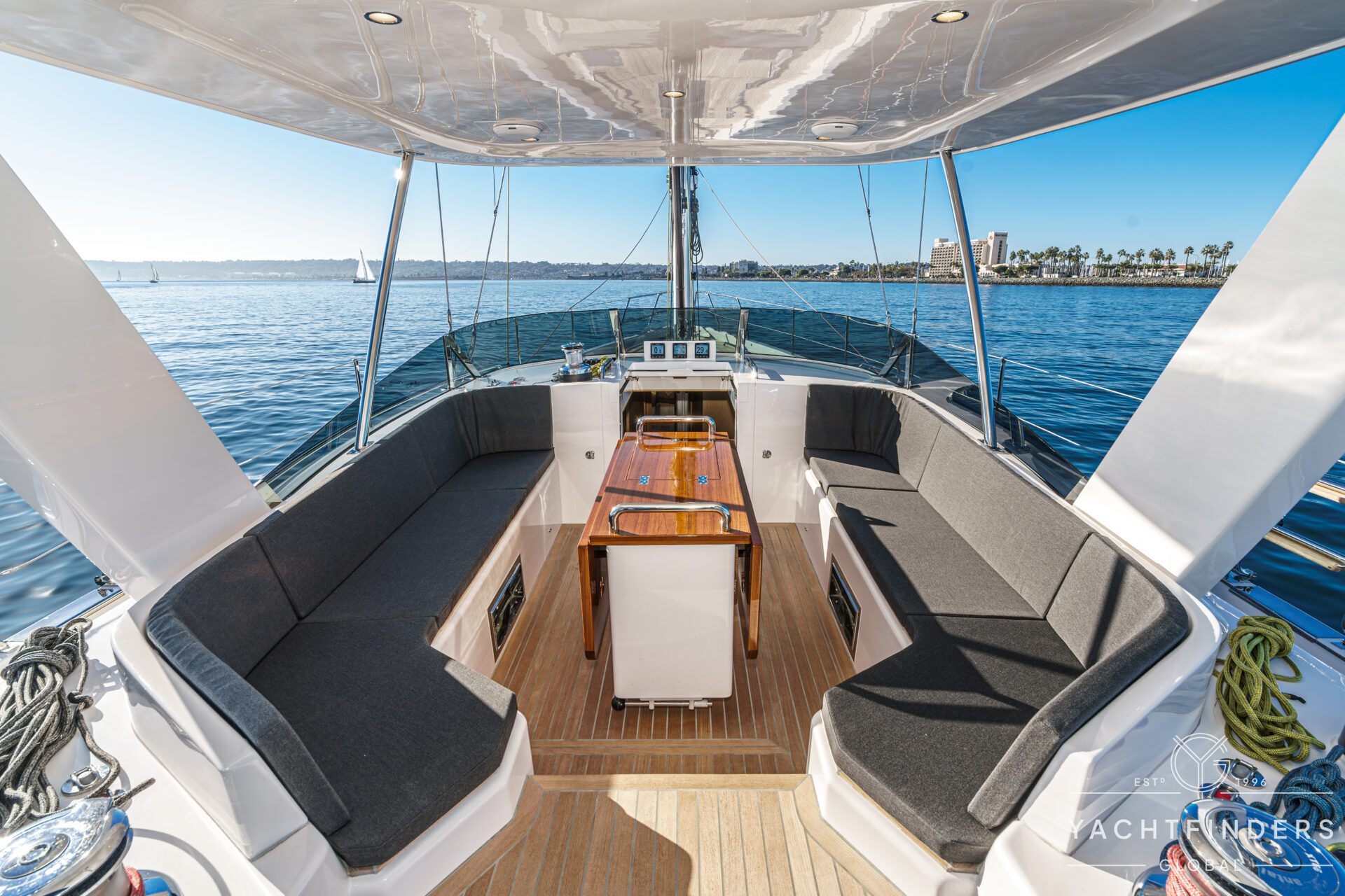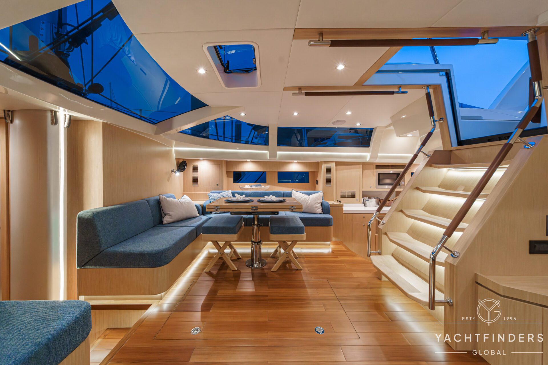 Below decks, the bright and voluminous three-cabin interior is warm and welcoming. Natural light abounds, and the layout is configured for luxurious comfort and an enjoyable living experience underway, while providing a true sense of home when settled at your destination. No horizon is too distant for this award-winning performance cruiser.