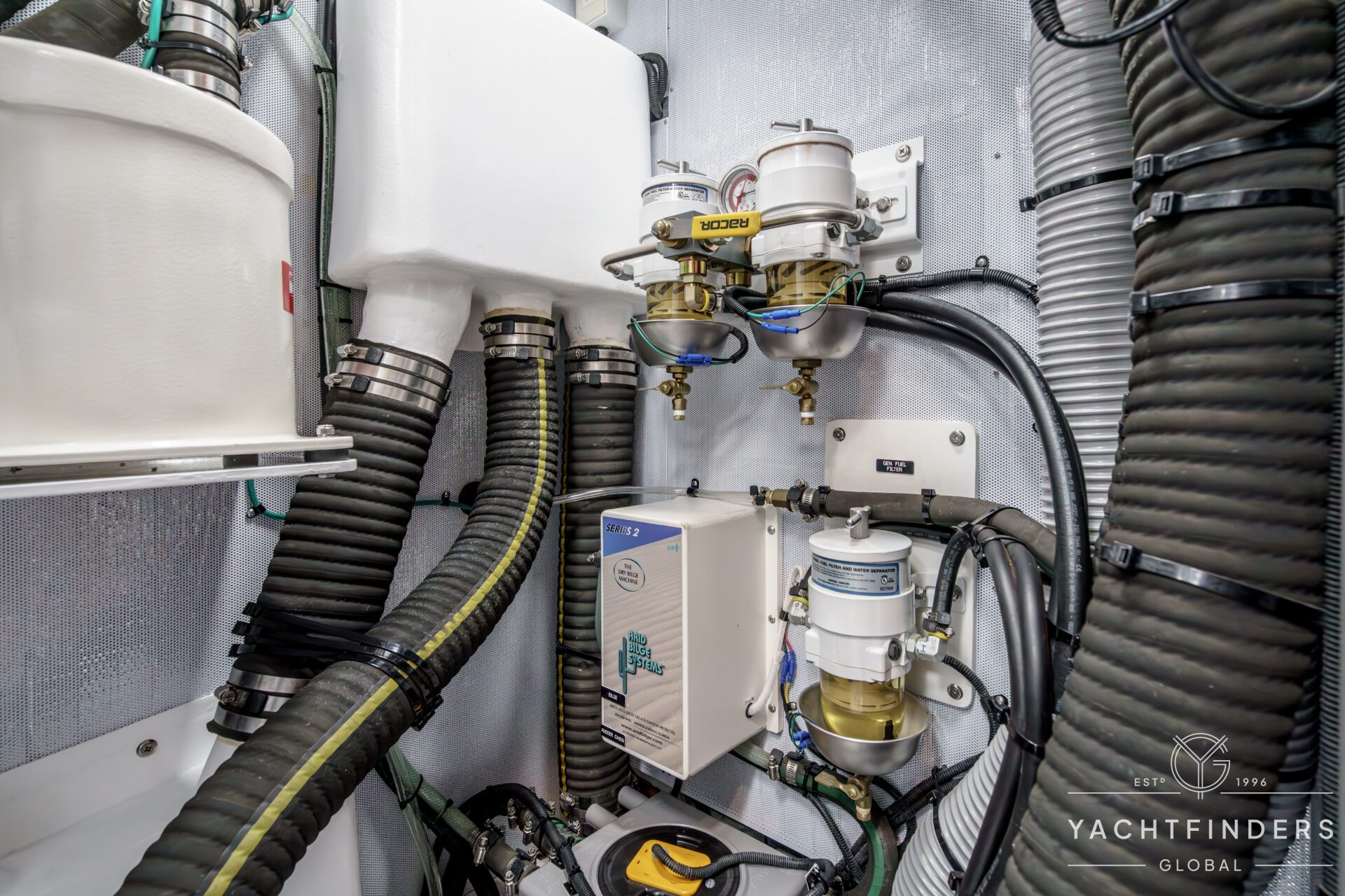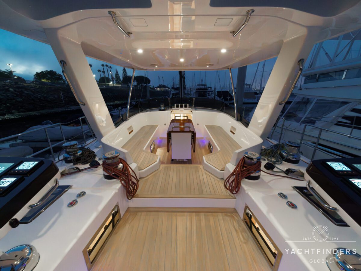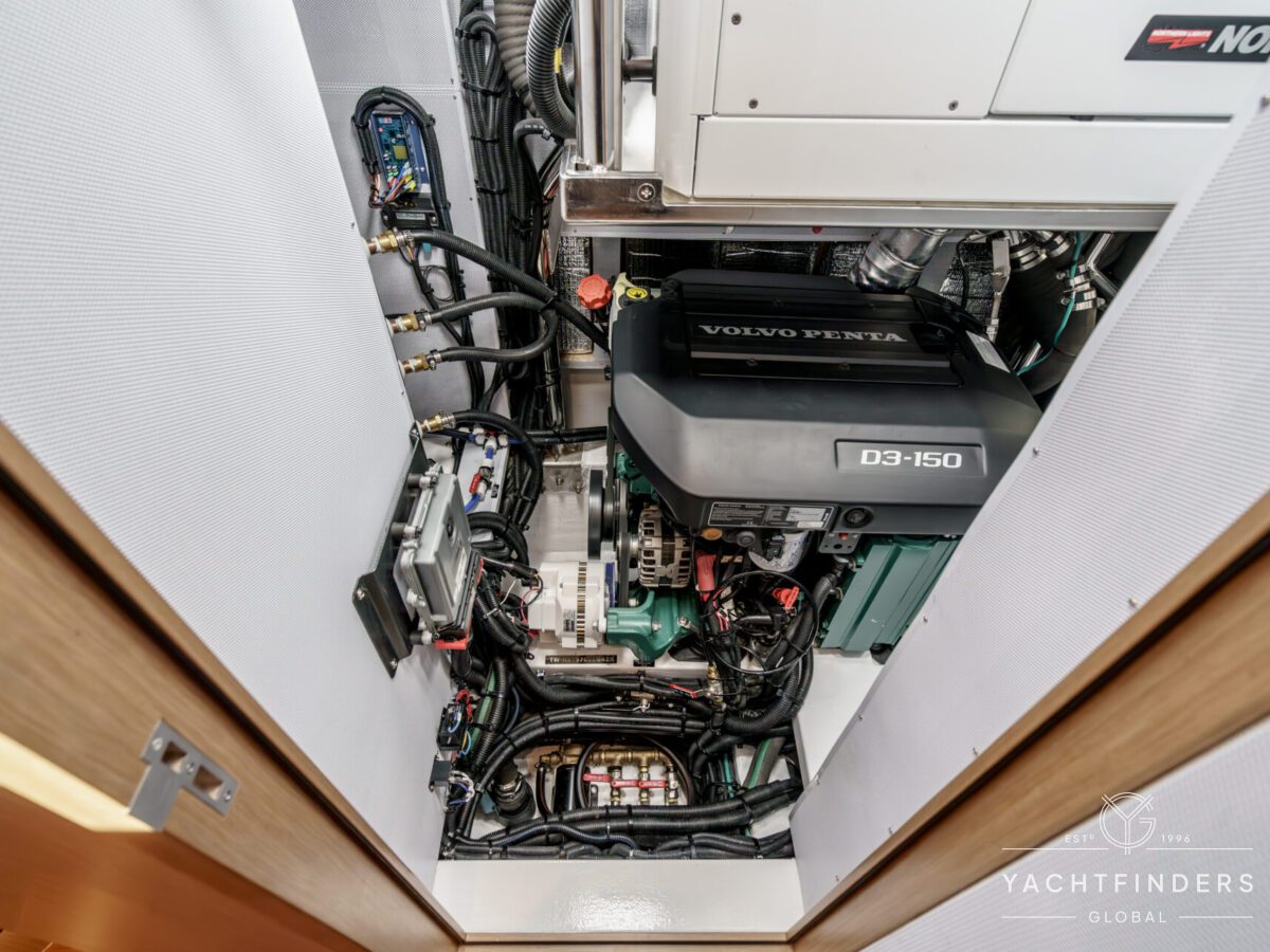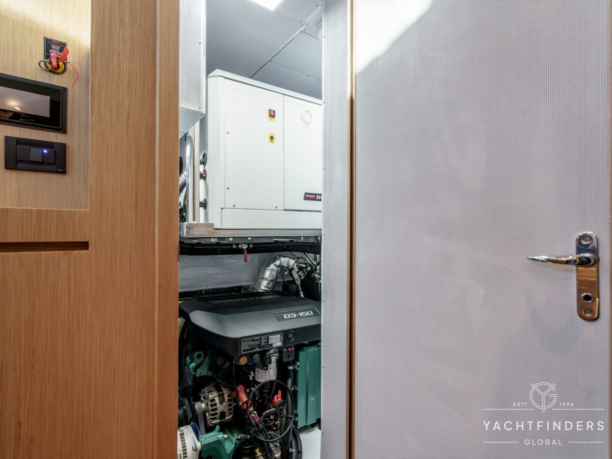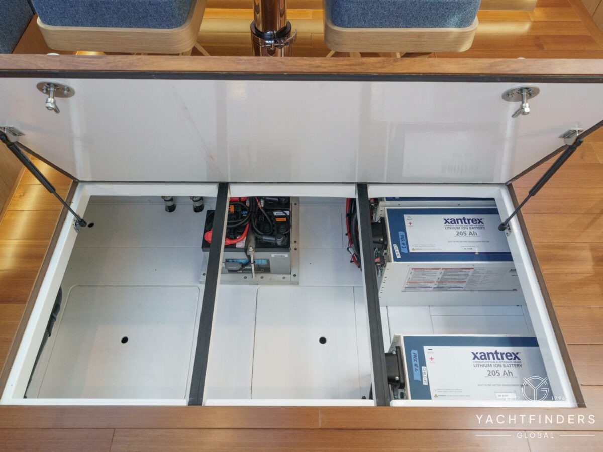 There are 3 cabins, including an Aft Master Stateroom with a centerline queen berth, plenty of natural light and storage and a private head with secondary access to the engine compartment. The primary access to the engine compartment is through the spacious Navigation station, which is in proximity to the companionway. The VIP cabin is forward and also features a centerline berth, plenty of storage, natural light, and en-suite access to the forward head. Under the forward bunk is the Water-Maker with remotely plumbed filtration for easy maintenance. Additionally, there is a second guest cabin forward with a single berth that also functions as a utility cabin with a work bench and a combined Washer/Dryer.