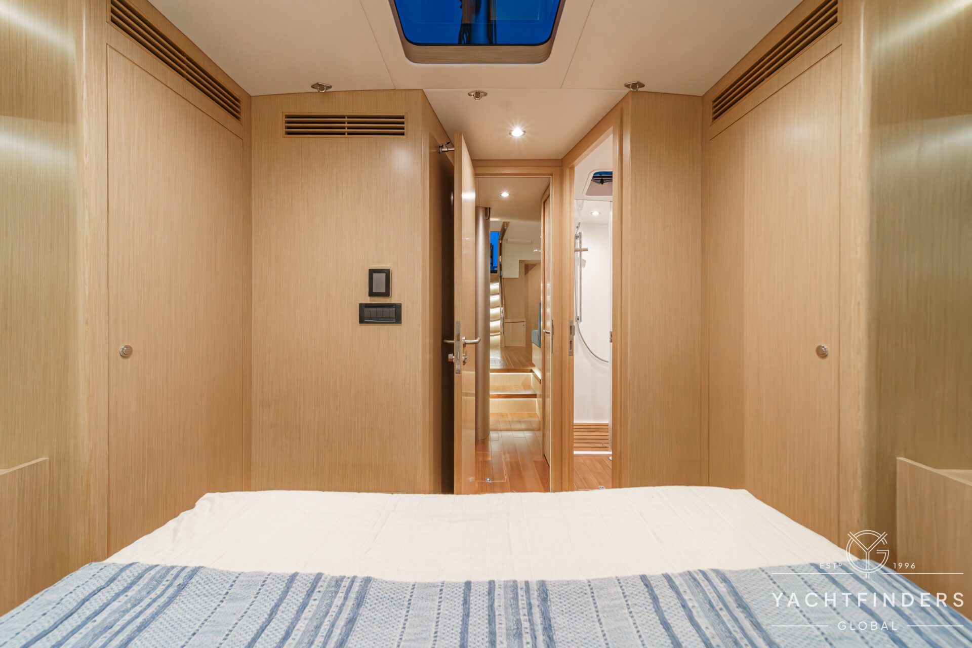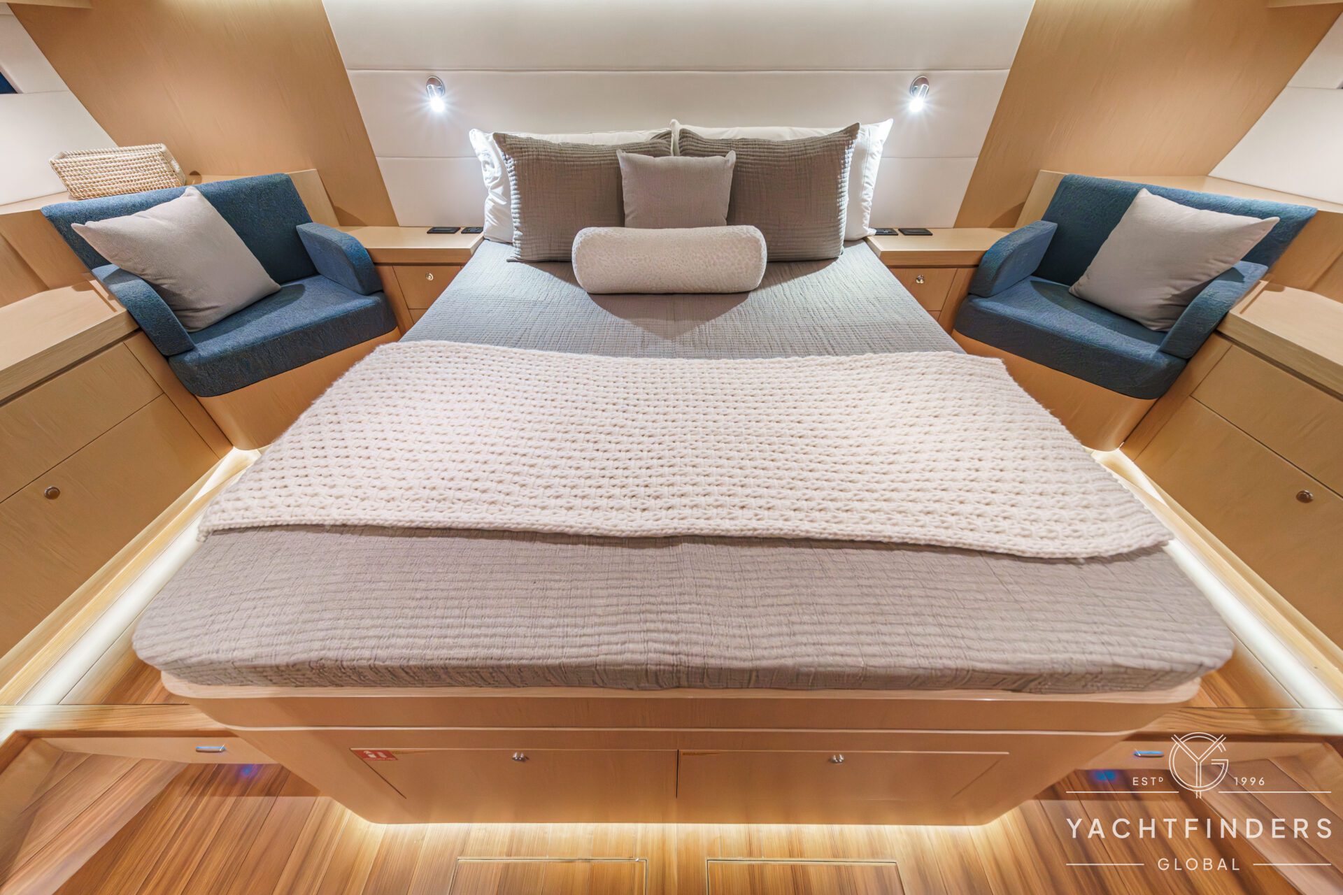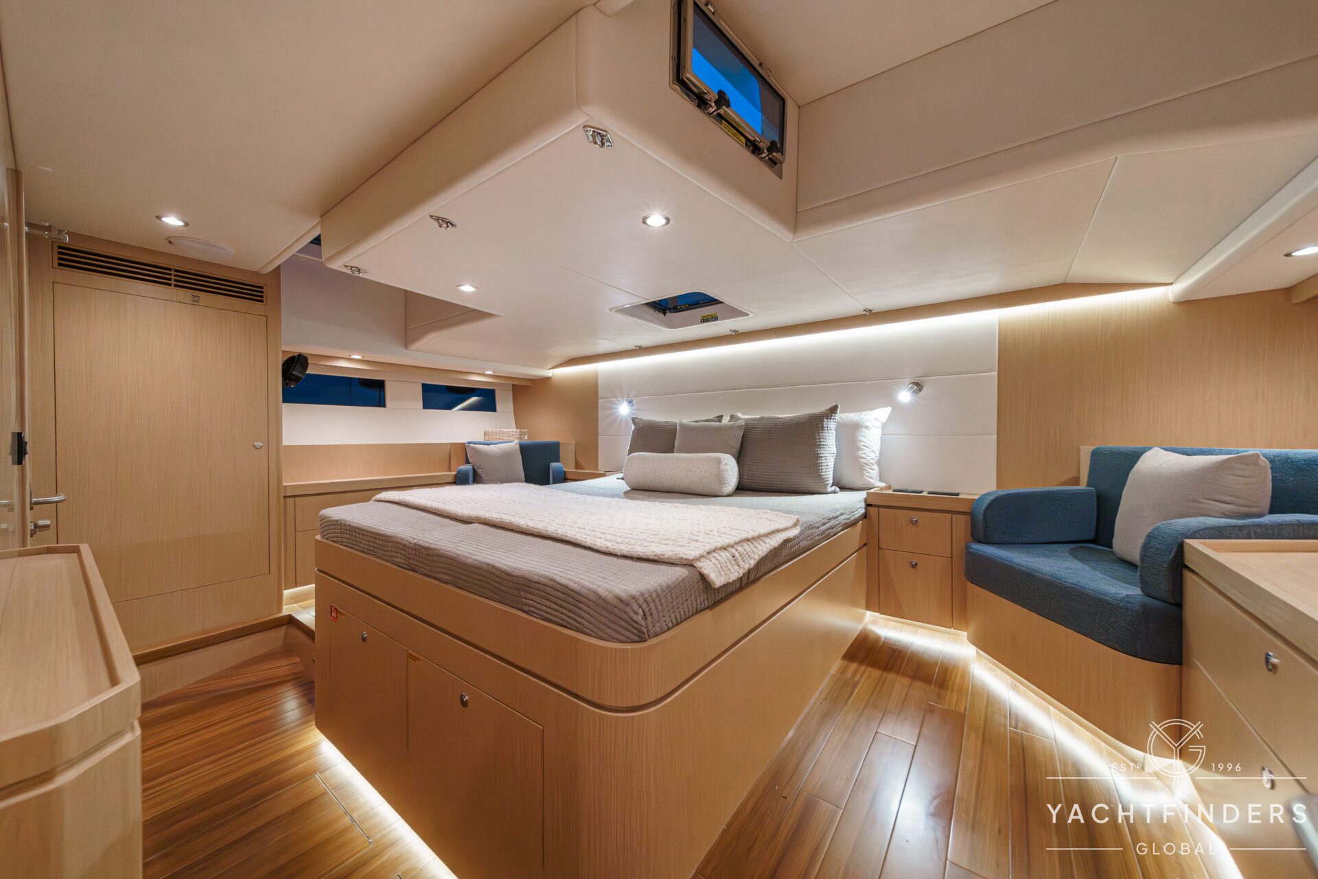 The master stateroom is aft, offering the most comfort underway, in addition to the space and versatility that allow for an ensuite bath with a separate shower stall, plenty of storage space, settees, work stations, and AV systems. The galley is large enough to accommodate every appliance, and the forward guest quarters would be the envy of any host wanting to bring comfort and luxury to friends and family.