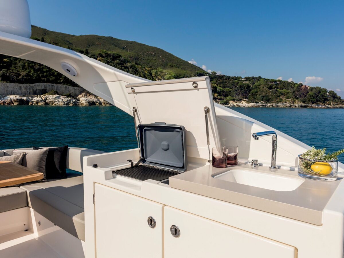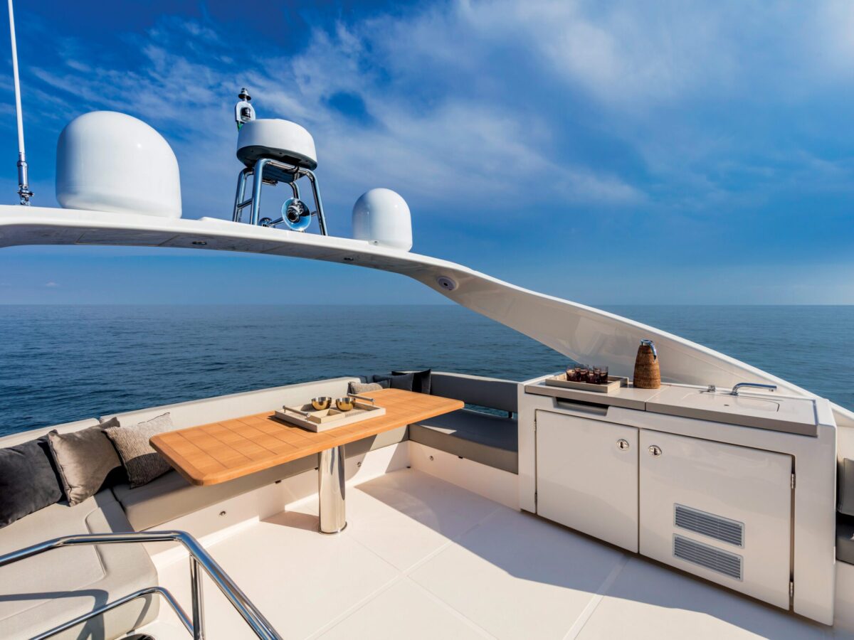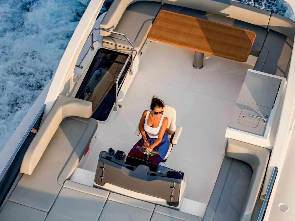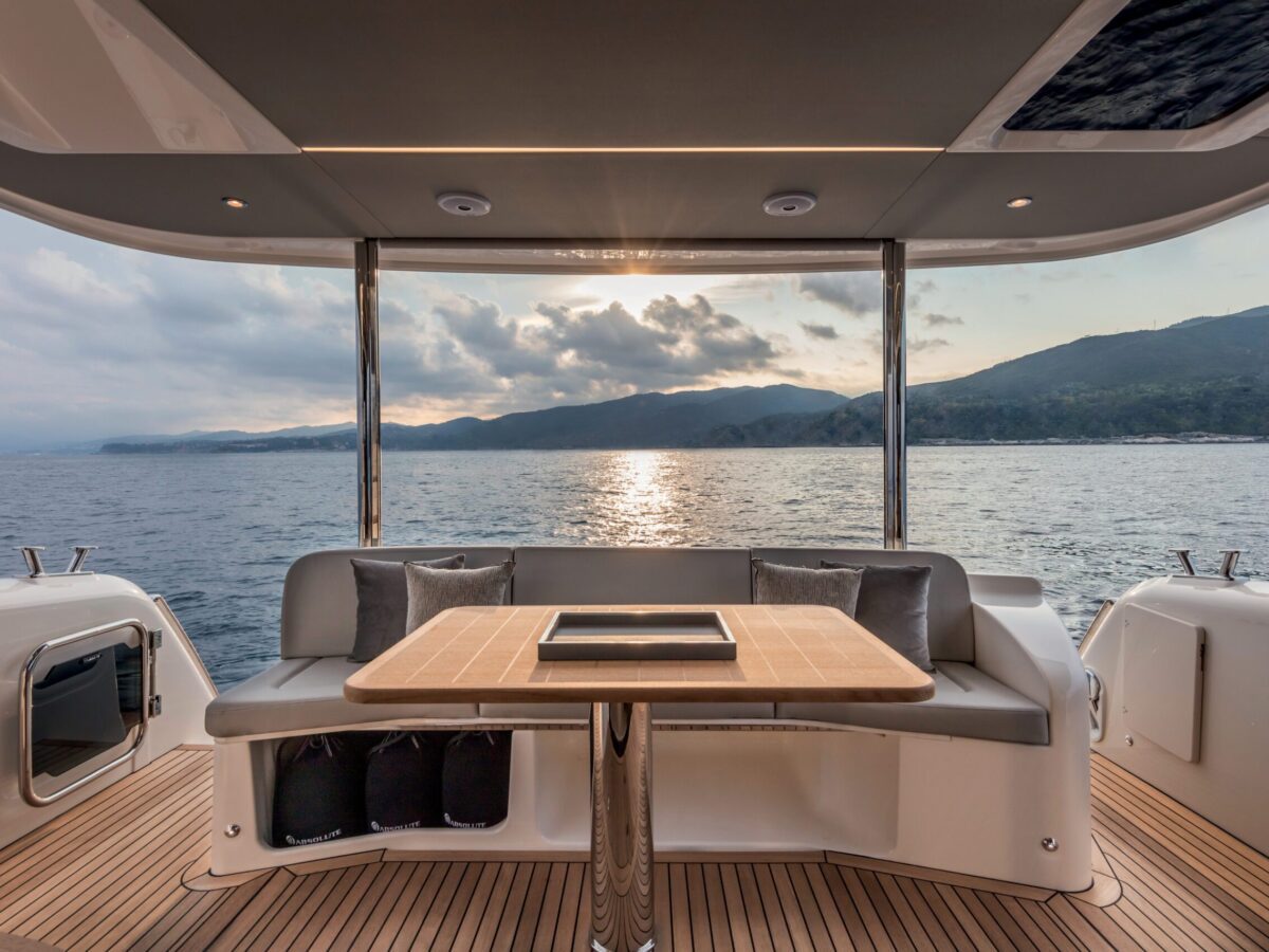 - The outdoor space is unparalleled compared to similar boats in this segment. The flybridge has no steps from front to aft, and the centrally placed dashboard allows for a sun lounger accommodating up to five people.