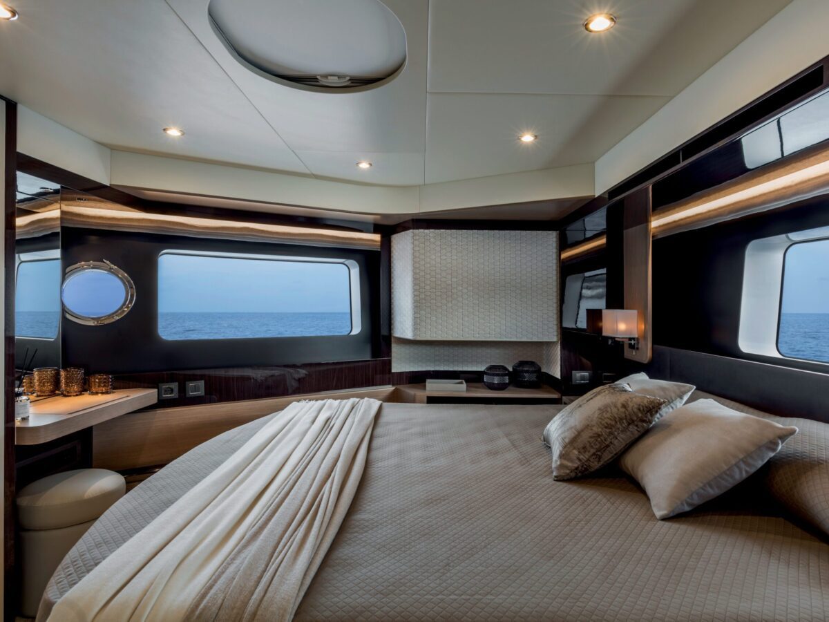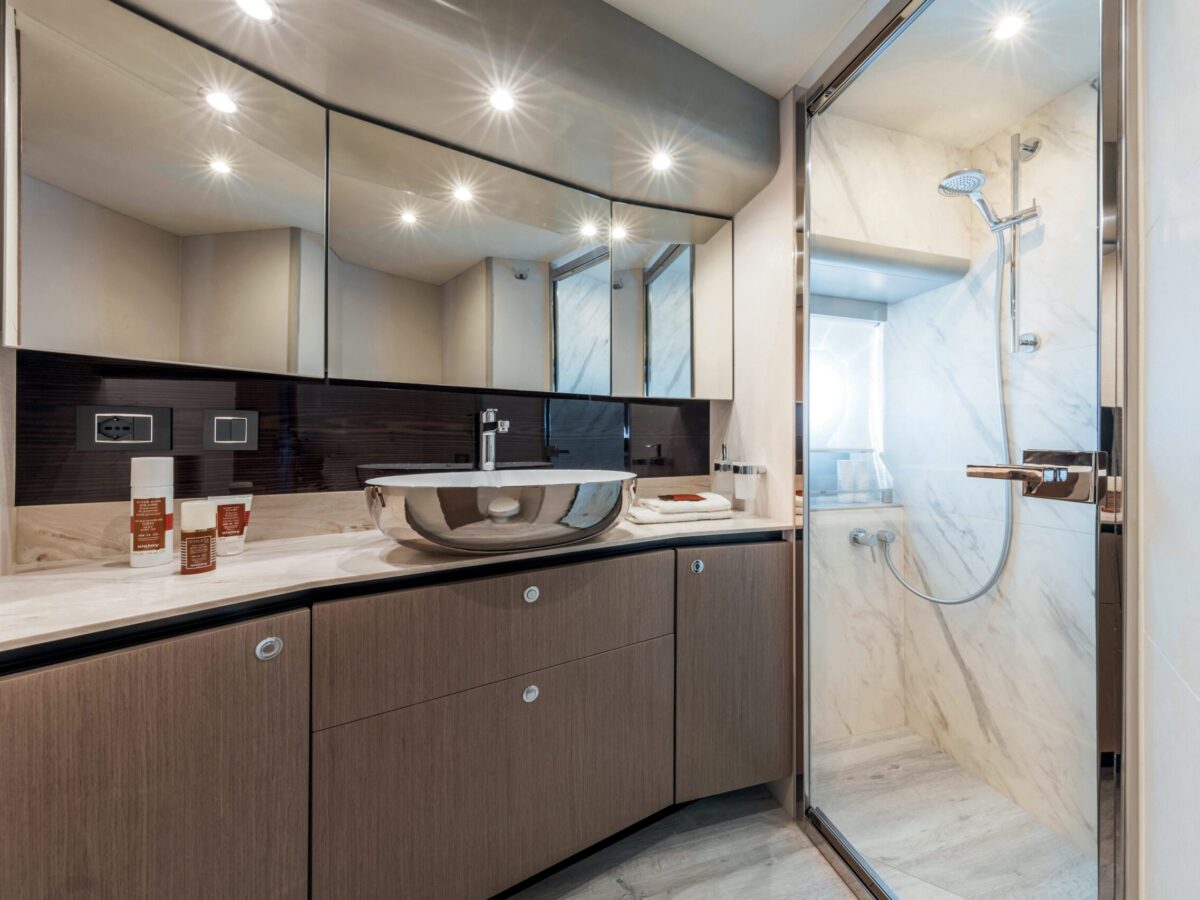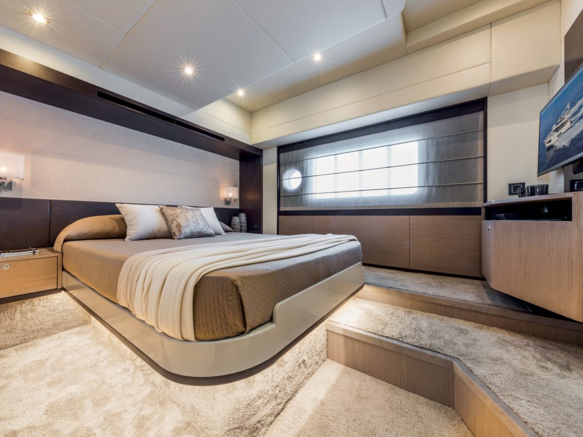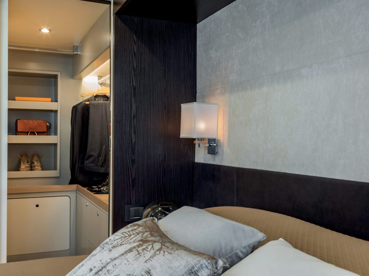 - The master cabin, raised and placed transversely to the bow, offers a remarkable surface for a yacht of this size. It includes a large double bed, high ceilings, a large closet, and an en-suite head with a separate full shower.
