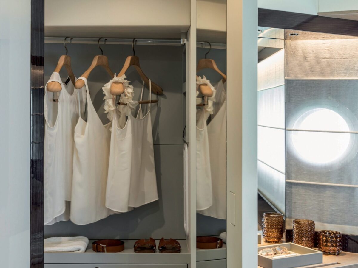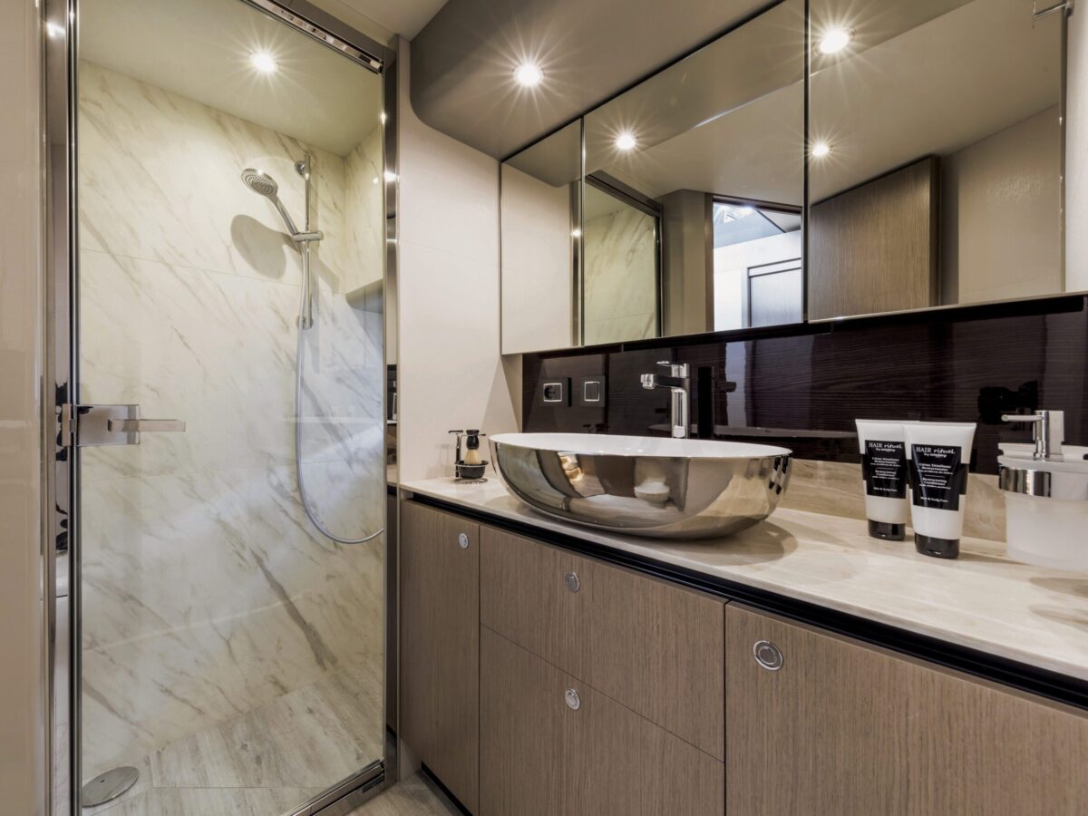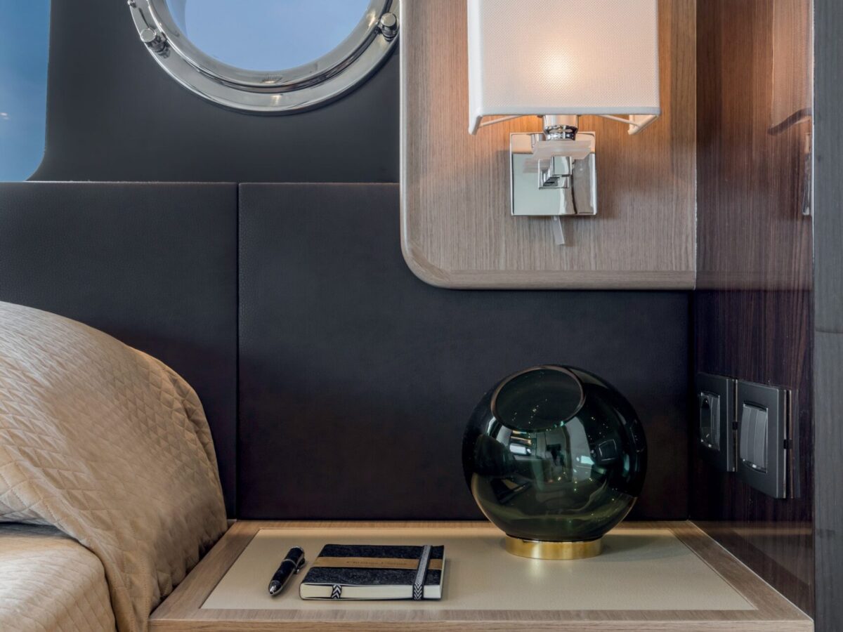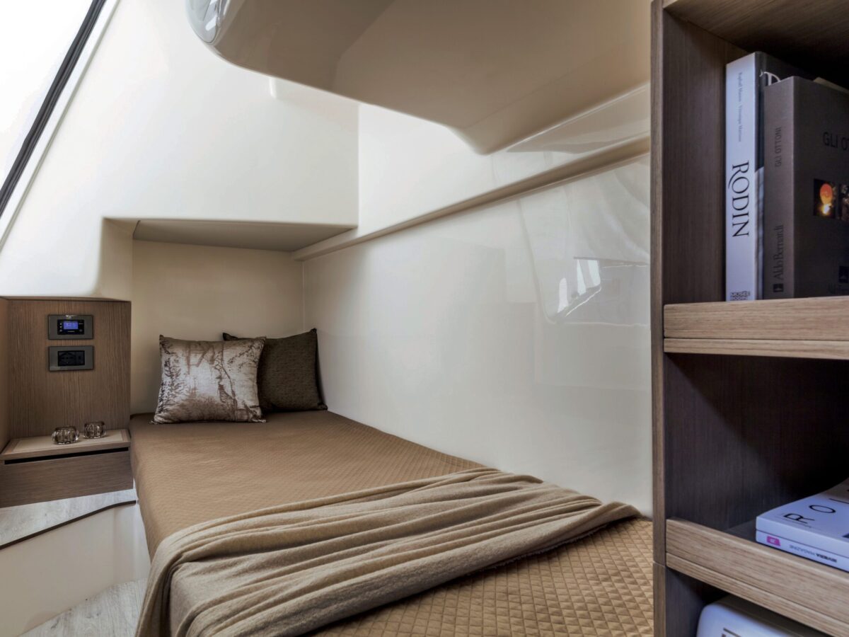 - The master cabin, raised and placed transversely to the bow, offers a remarkable surface for a yacht of this size. It includes a large double bed, high ceilings, a large closet, and an en-suite head with a separate full shower.
