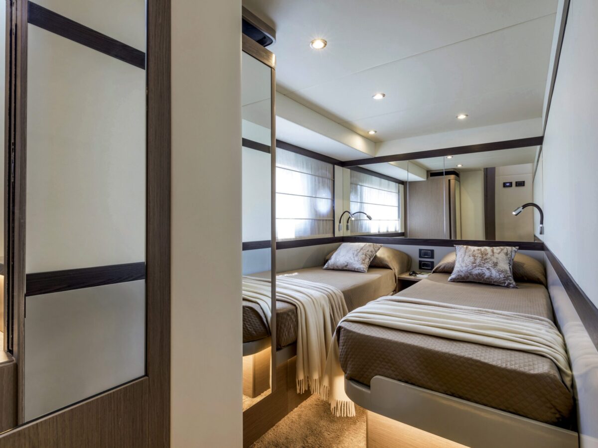 - The half-beam VIP cabin mirrors the main suite, while the third guest double cabin has separate berths. An additional cabin placed aft can accommodate an extra guest or crew1.