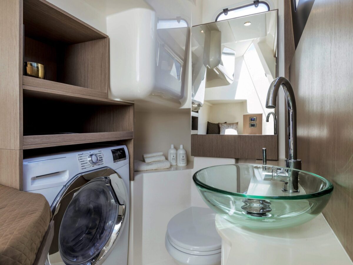 - The galley is roomy and fully equipped, easily connected to the cockpit for outdoor lunches and dinners.