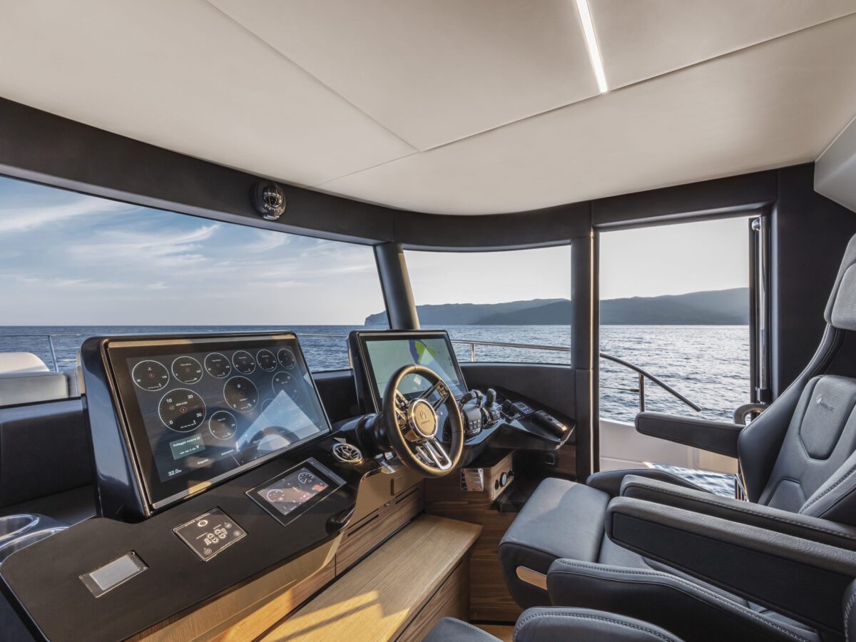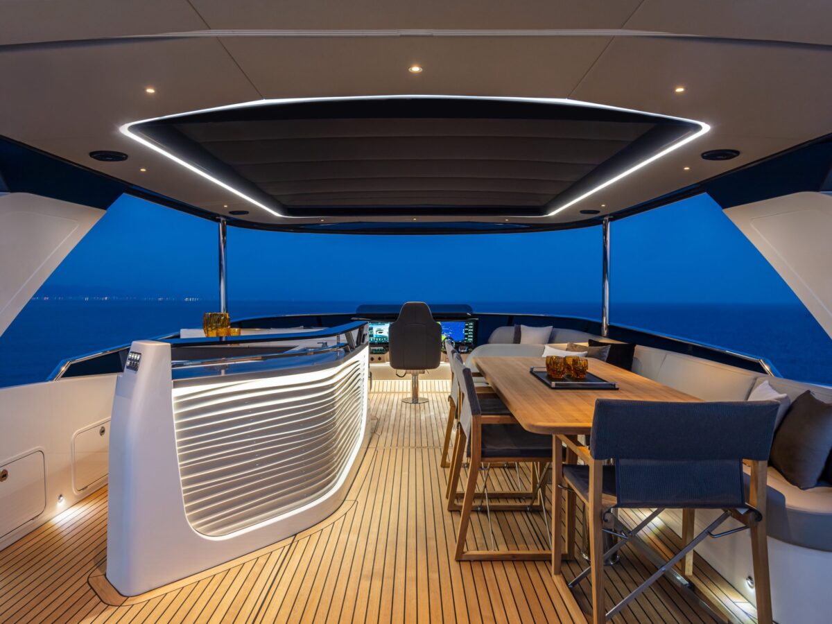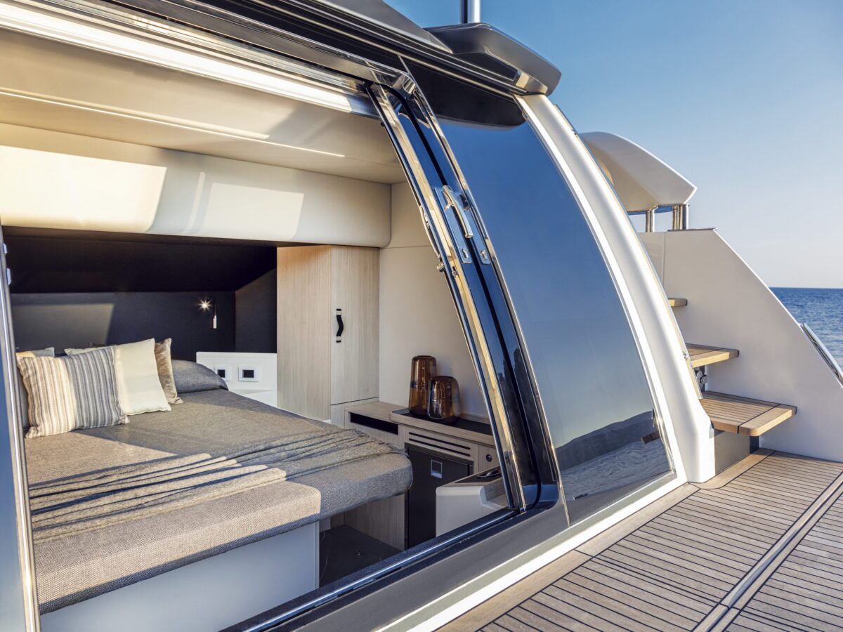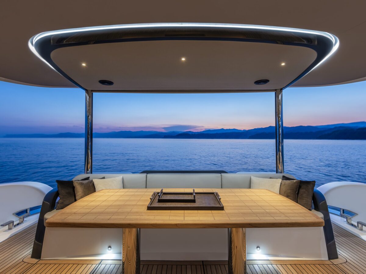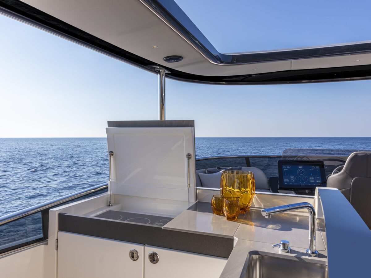 Also unique to this new model on the flybridge is a “perimeter guide”, an optional transparent cover that allows you to close off the forward part of the flybridge during inclement weather. This is an exceptional option for boaters who spend time in more extraordinary locations. Additionally, on the flybridge is a sunroof in the hardtop that can be opened.