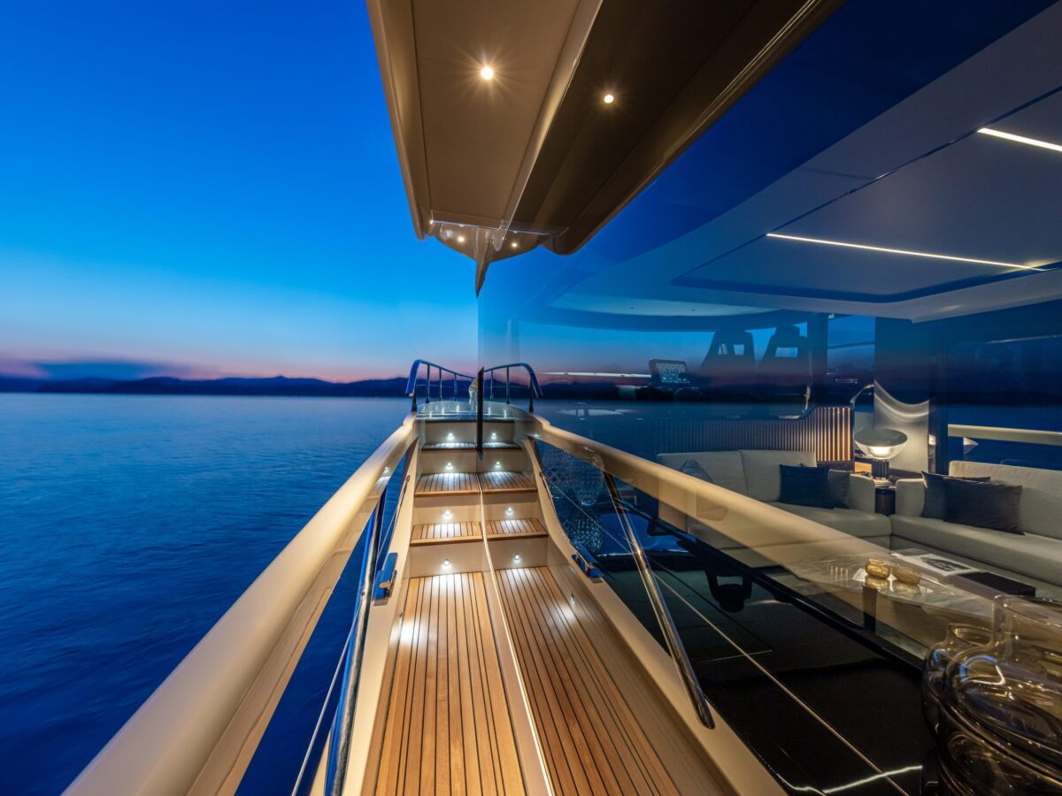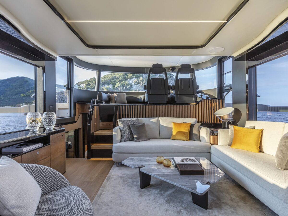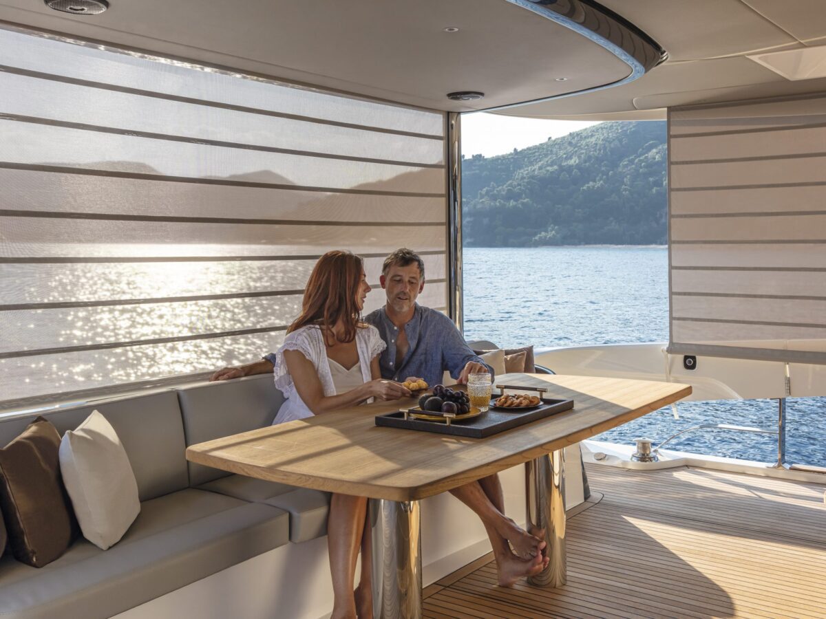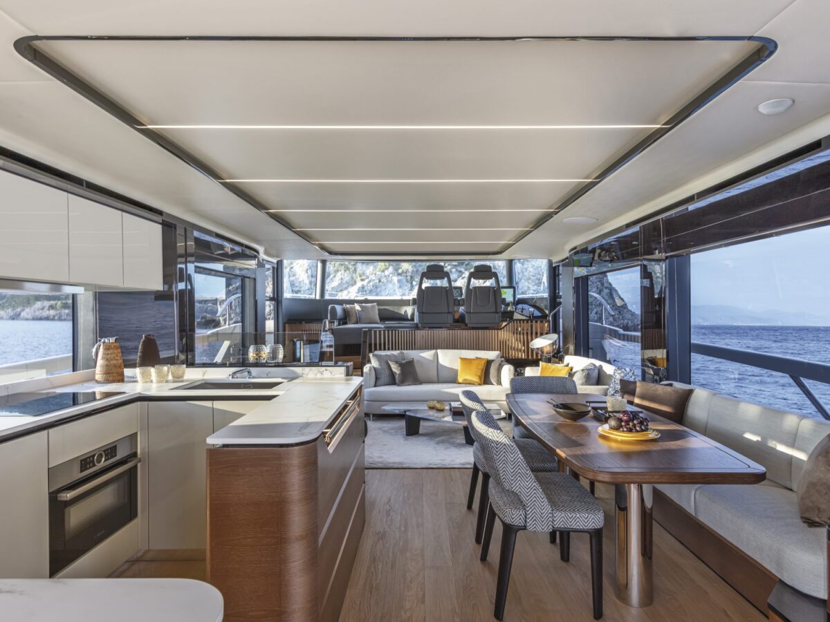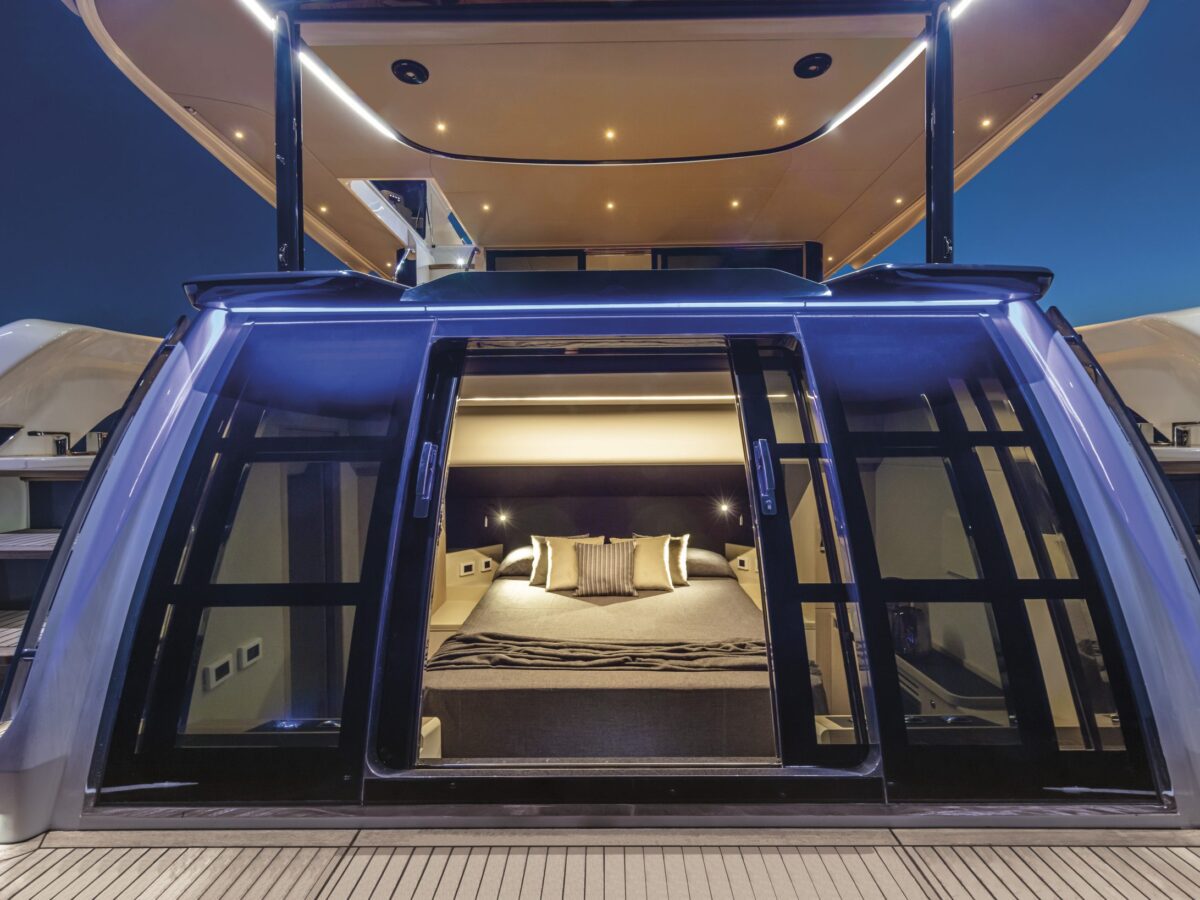Also unique to this new model on the flybridge is a “perimeter guide”, an optional transparent cover that allows you to close off the forward part of the flybridge during inclement weather. This is an exceptional option for boaters who spend time in more extraordinary locations. Additionally, on the flybridge is a sunroof in the hardtop that can be opened.