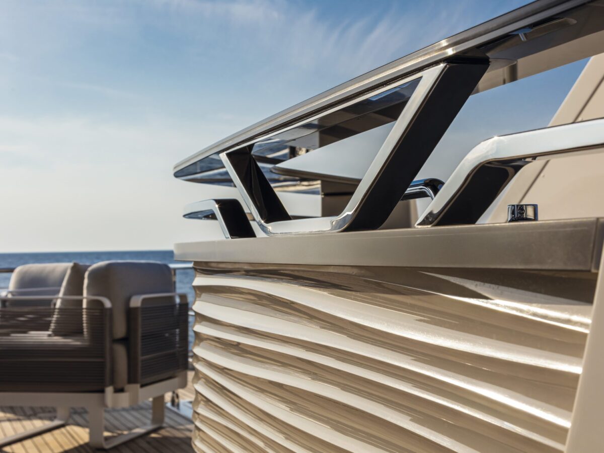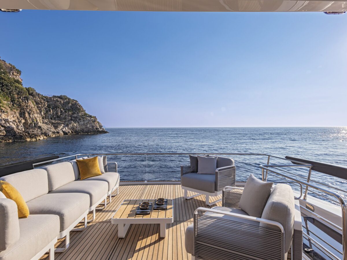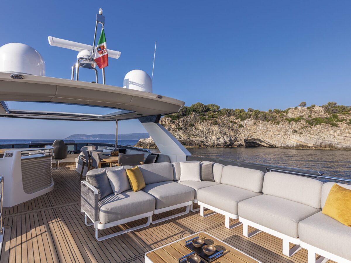 Aft on the flybridge is a sunbathing and entertainment terrace. Perfect for socializing or lounging in the sun’s rays, this space has an icemaker, BBQ, sink, cabinet storage for dishes, a large teak table for dining al fresco, and two L-shaped sofas. This is truly an outdoor galley and dining area with a view.