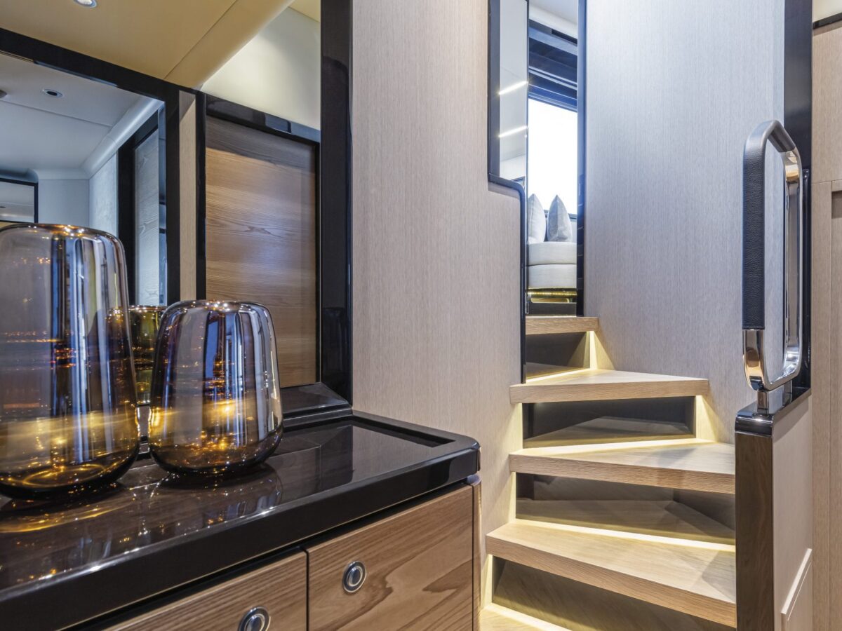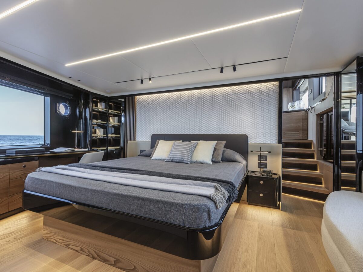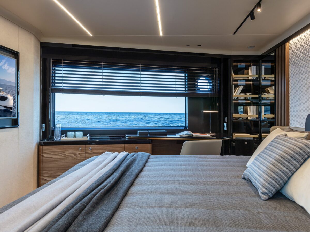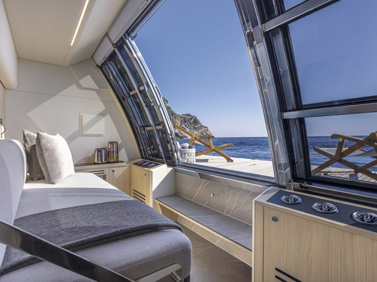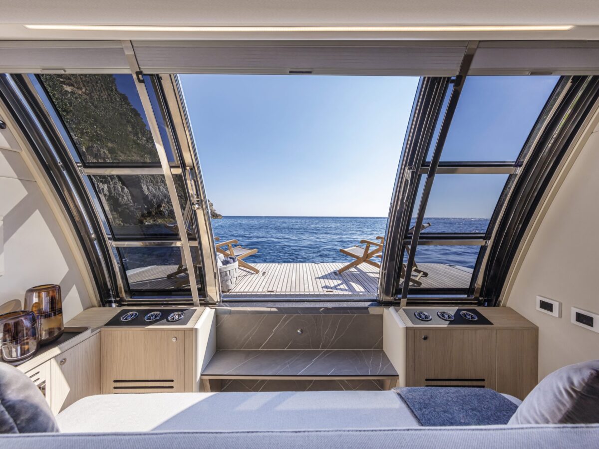 Navetta 64 – the Absolute Pathfinder – is immediately recognisable as an Absolute yacht. The exterior is hallmarked by the massive area of glazing enclosing the saloon and main helm, along with equally generous hull windows corresponding to the owner and VIP cabins and the elegant, dynamic motif formed by the side rail with its open gunwales and raked columns. The Navetta 64 has a unique piece of nautical design in the Beach Club, with a cabin looking onto the stern platform. Enclosed by glazing, this space can be used as a beach club lounge, with a generously sized sofa, or as an average double-bed stateroom. The berth is slightly lower than the stern platform, giving guests a superb view of the sea, reminiscent of an infinity pool.