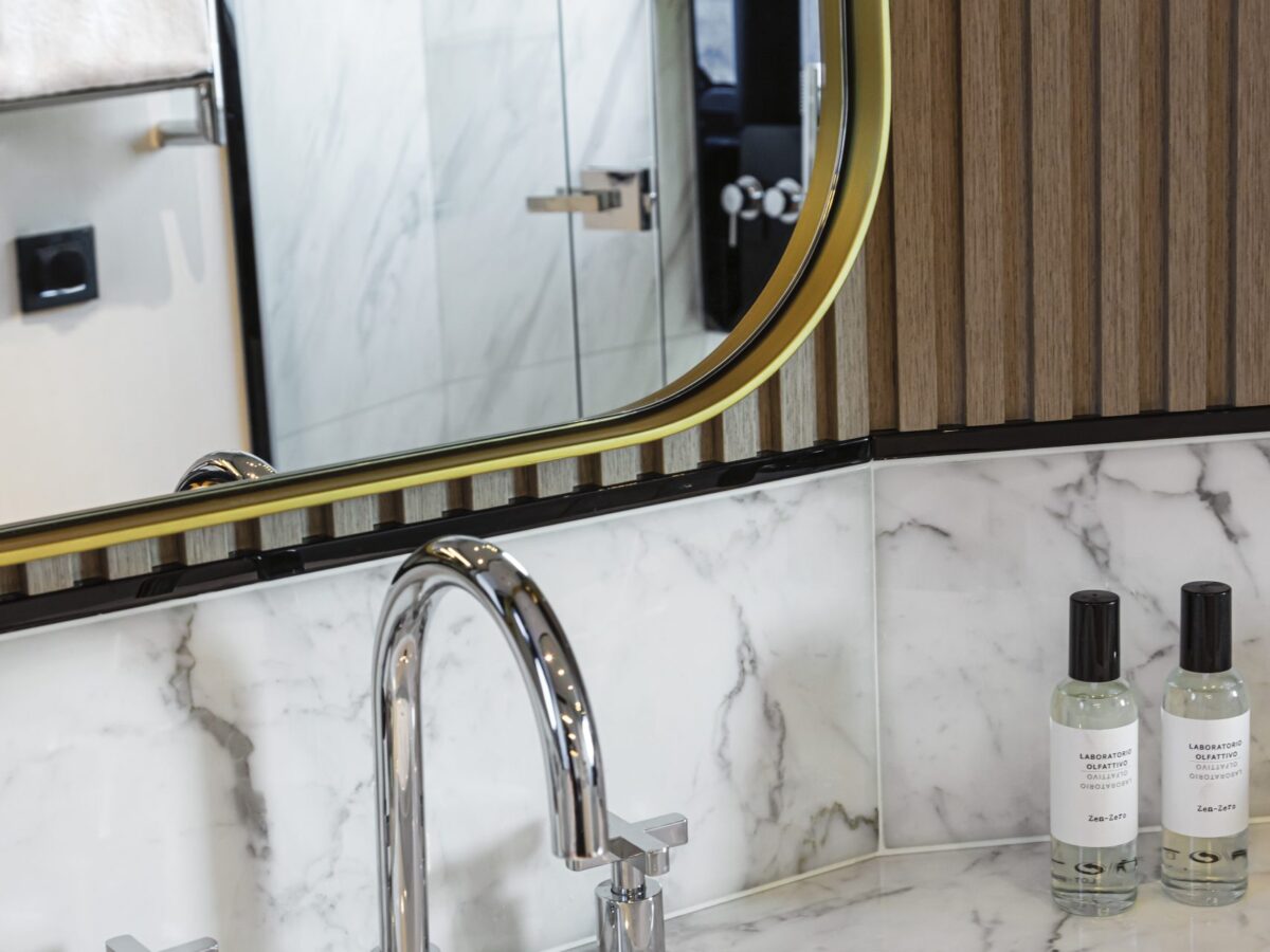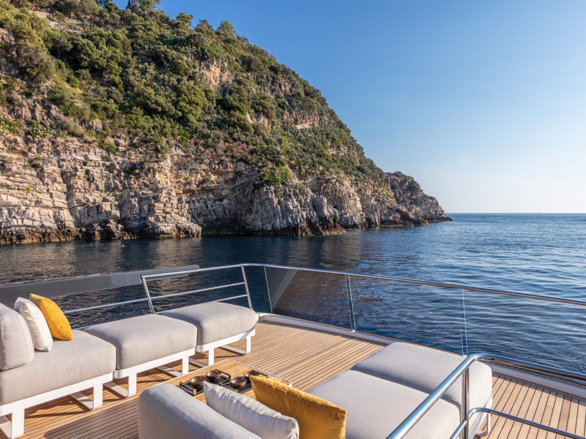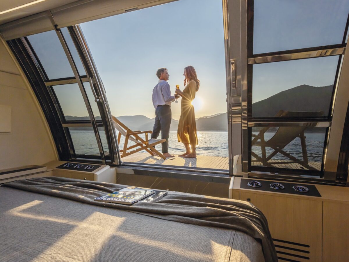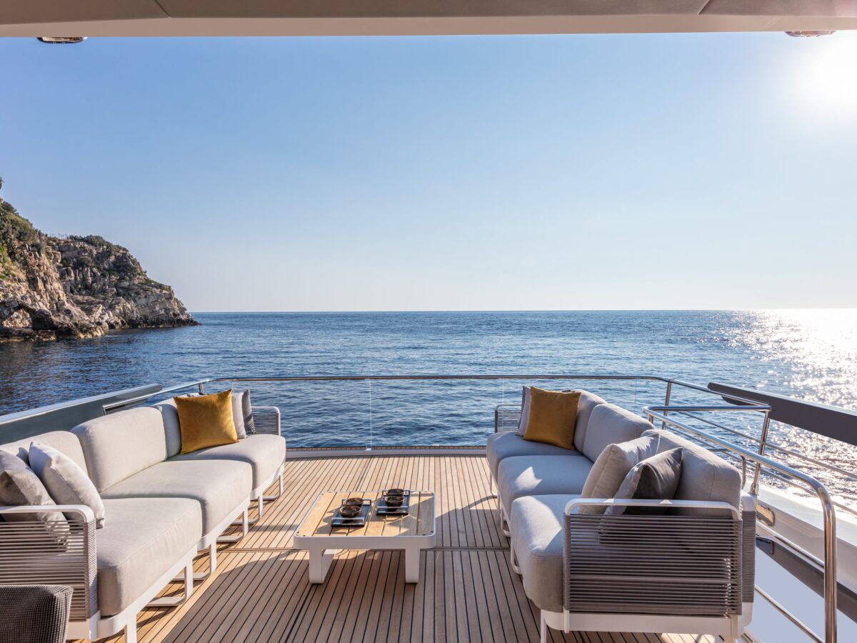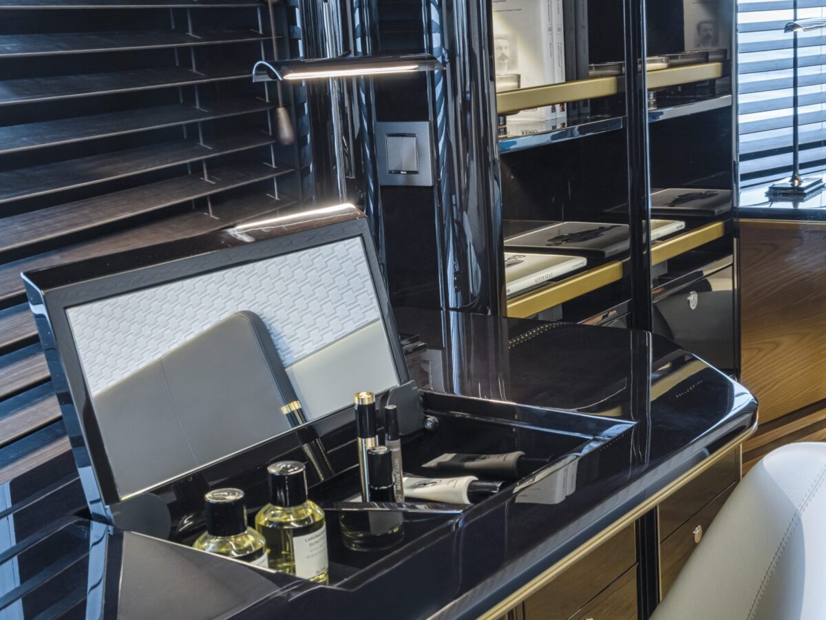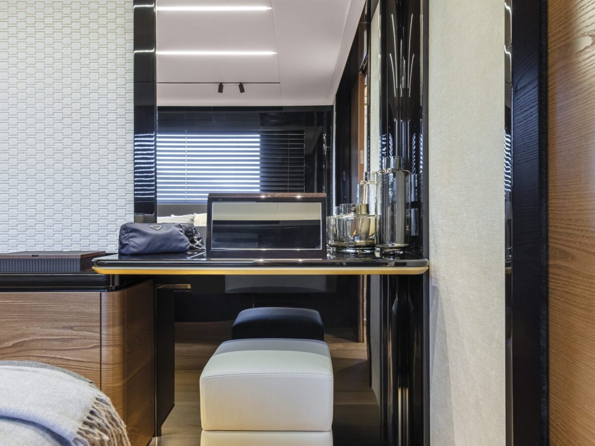 Navetta 64 – the Absolute Pathfinder – is immediately recognisable as an Absolute yacht. The exterior is hallmarked by the massive area of glazing enclosing the saloon and main helm, along with equally generous hull windows corresponding to the owner and VIP cabins and the elegant, dynamic motif formed by the side rail with its open gunwales and raked columns. The Navetta 64 has a unique piece of nautical design in the Beach Club, with a cabin looking onto the stern platform. Enclosed by glazing, this space can be used as a beach club lounge, with a generously sized sofa, or as an average double-bed stateroom. The berth is slightly lower than the stern platform, giving guests a superb view of the sea, reminiscent of an infinity pool.