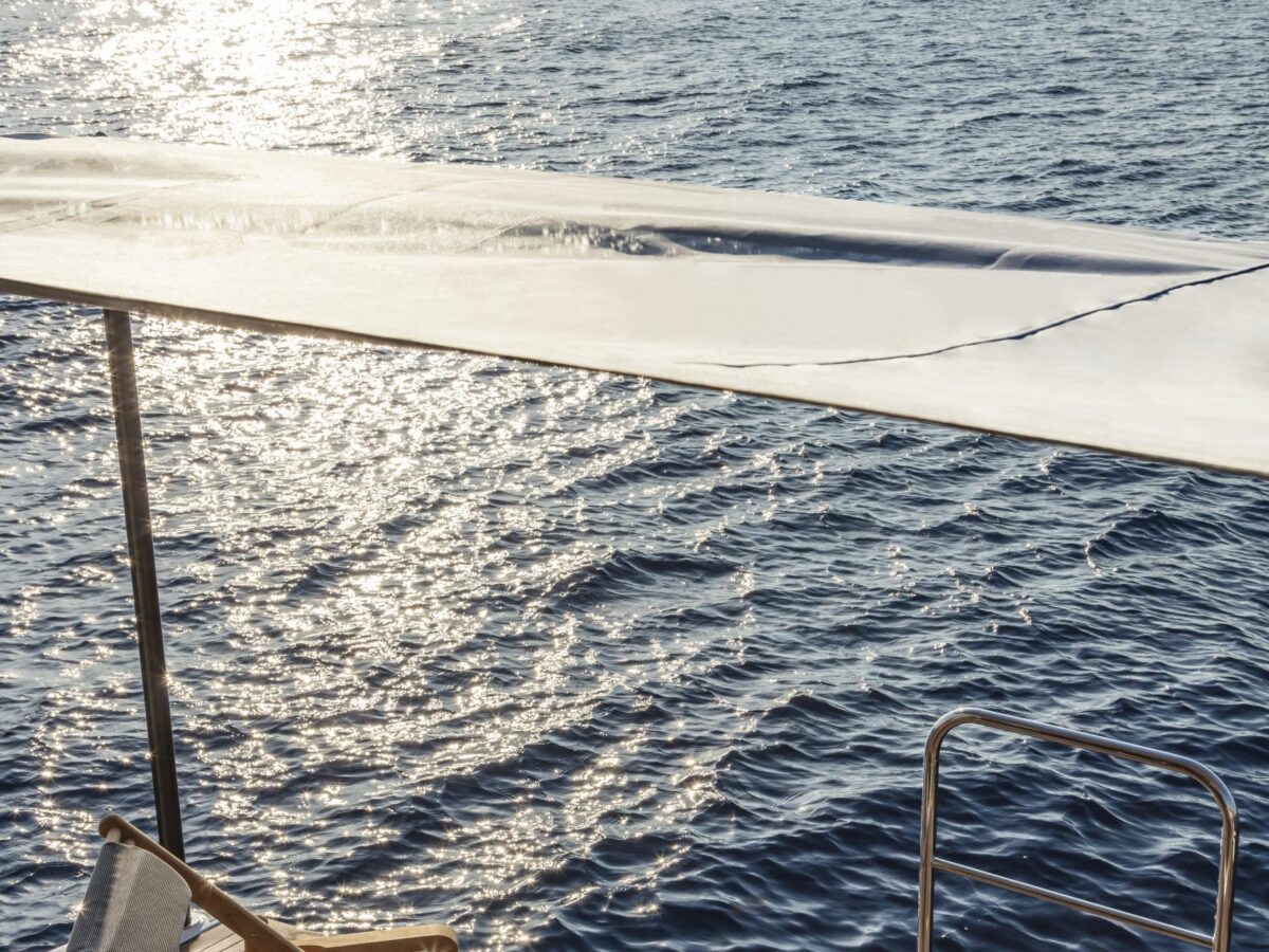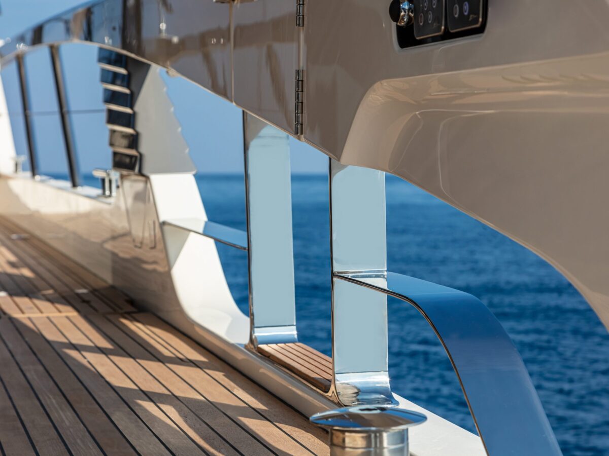 The transom also has a fascinating option. The standard Navetta 64 has a central door with two windows leading into the large storage area. As an option, though, the transom area can have two full-window doors that open to an ample living space complete with a convertible sofa/bed, two separate wardrobes, a separate air-conditioning system, TV, stereo, fridge, head, and shower. It can be an additional VIP cabin at the edge of the water. And there’s no need to worry about water leaking into space as Absolute has installed a pneumatic gasket that seals the door to be watertight.