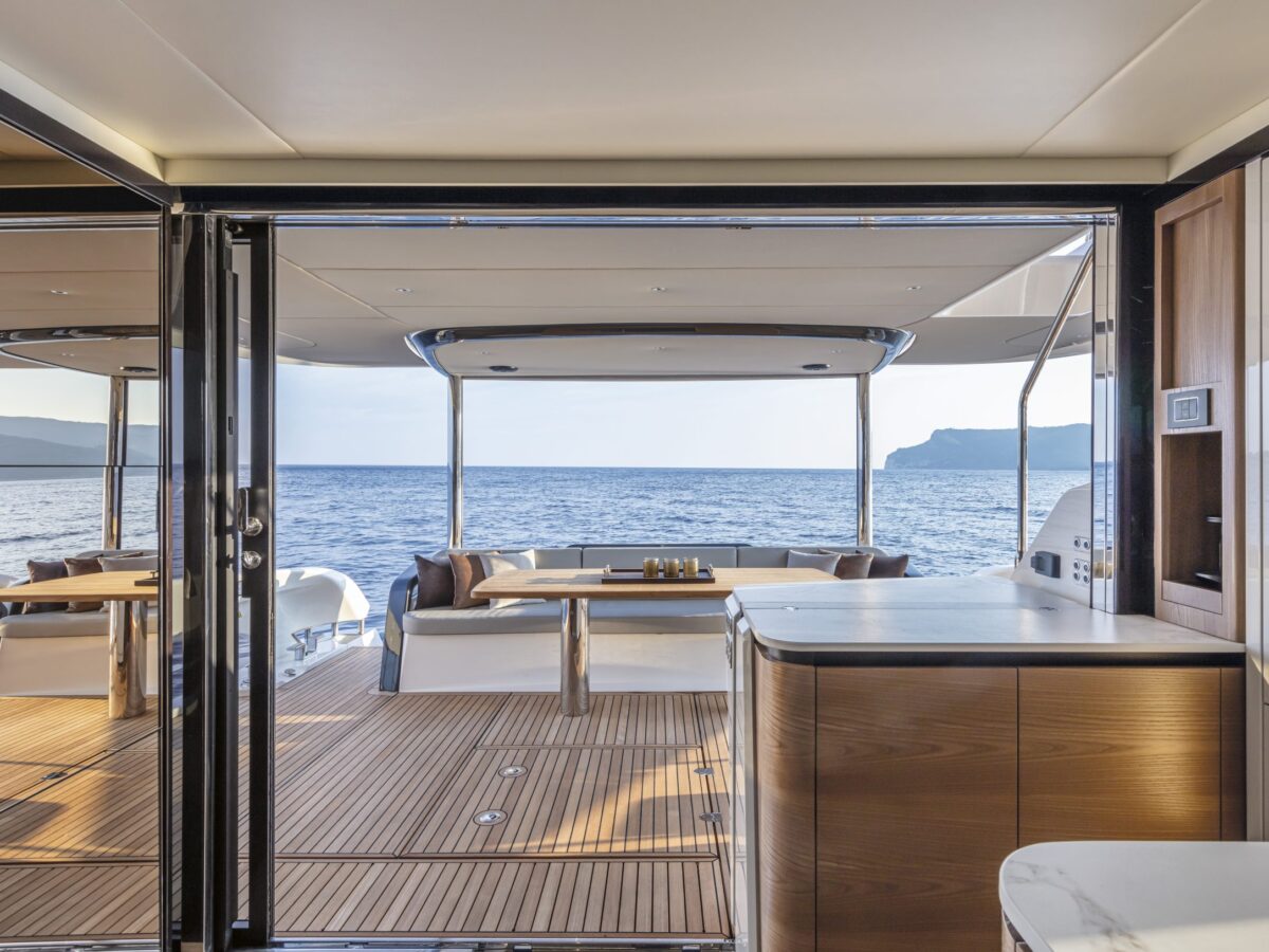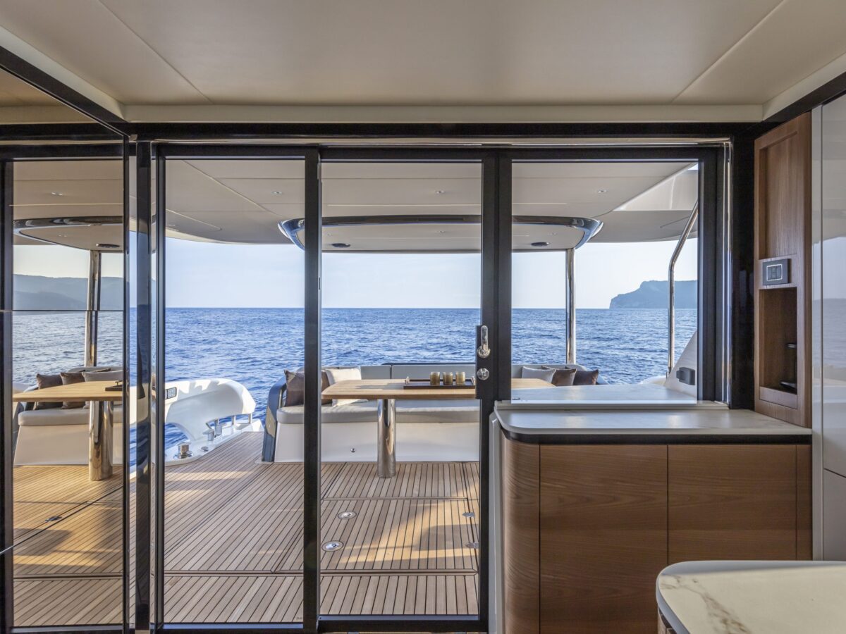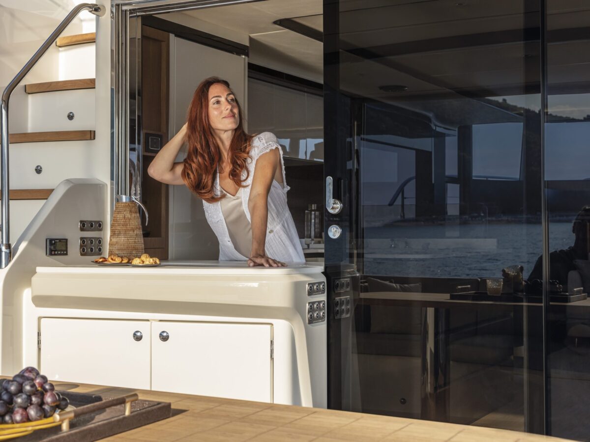 Perhaps the most intriguing addition to the Navetta 64 is what Absolute has done with the cockpit doors. For the last several years, the trend in yachting has been to place the galley aft near the cockpit doors with side windows open for serving. Absolute has improved upon this design by including fully opening cockpit doors to extend the outdoor living area inside the salon. Combined with the large picture windows in the salon, you’ll truly feel immersed in your environment.