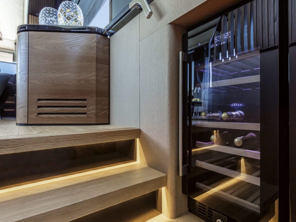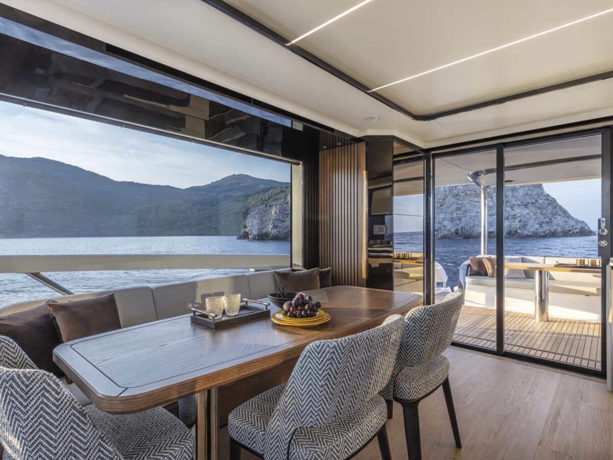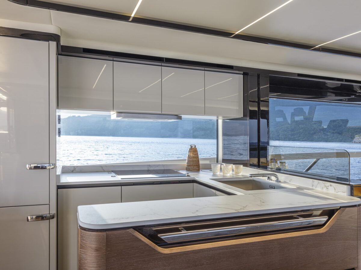 Perhaps the most intriguing addition to the Navetta 64 is what Absolute has done with the cockpit doors. For the last several years, the trend in yachting has been to place the galley aft near the cockpit doors with side windows open for serving. Absolute has improved upon this design by including fully opening cockpit doors to extend the outdoor living area inside the salon. Combined with the large picture windows in the salon, you’ll truly feel immersed in your environment.