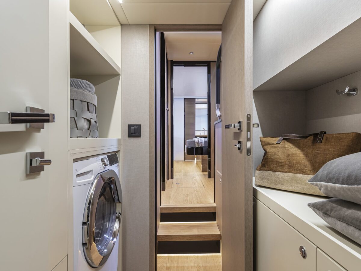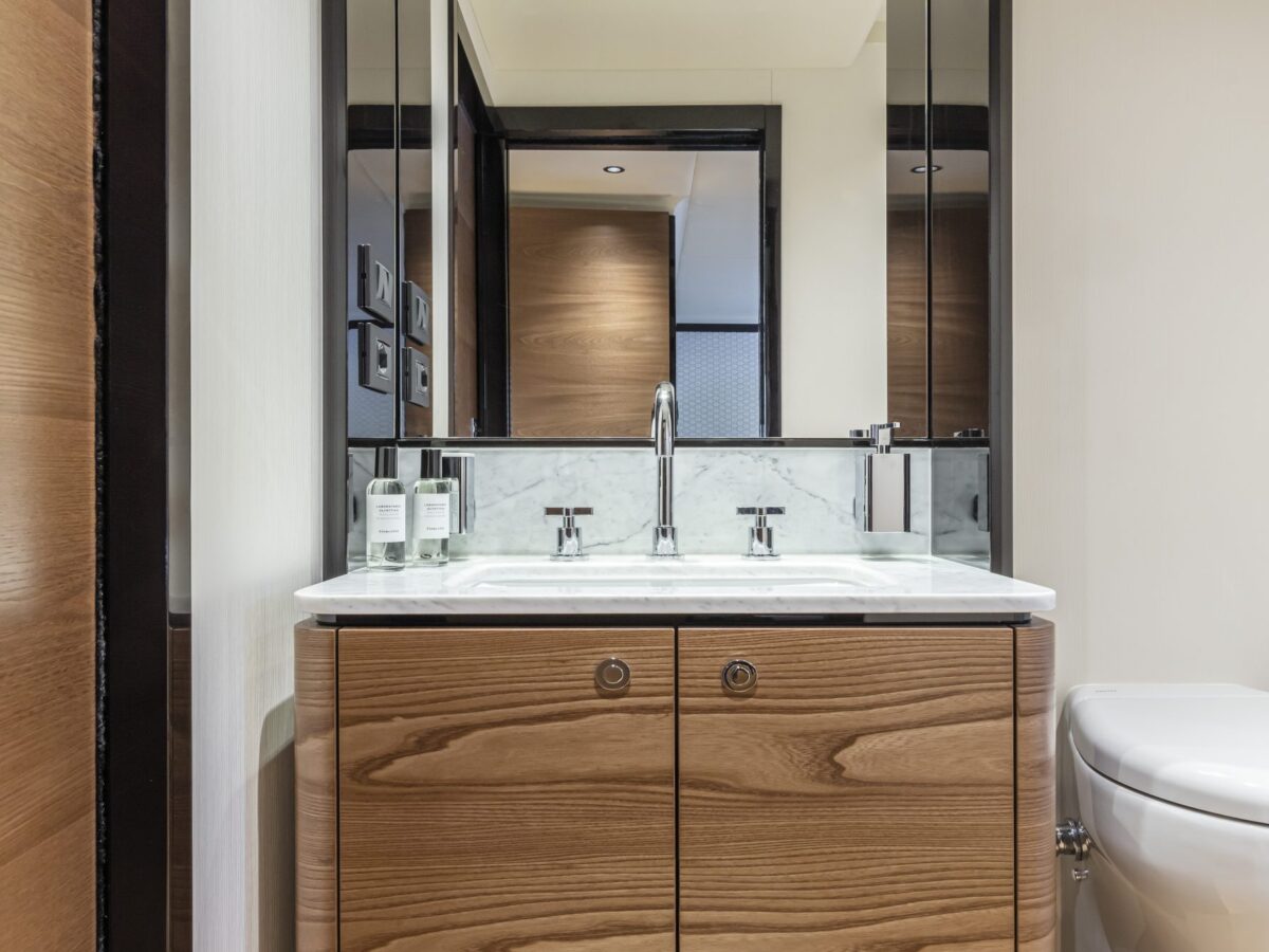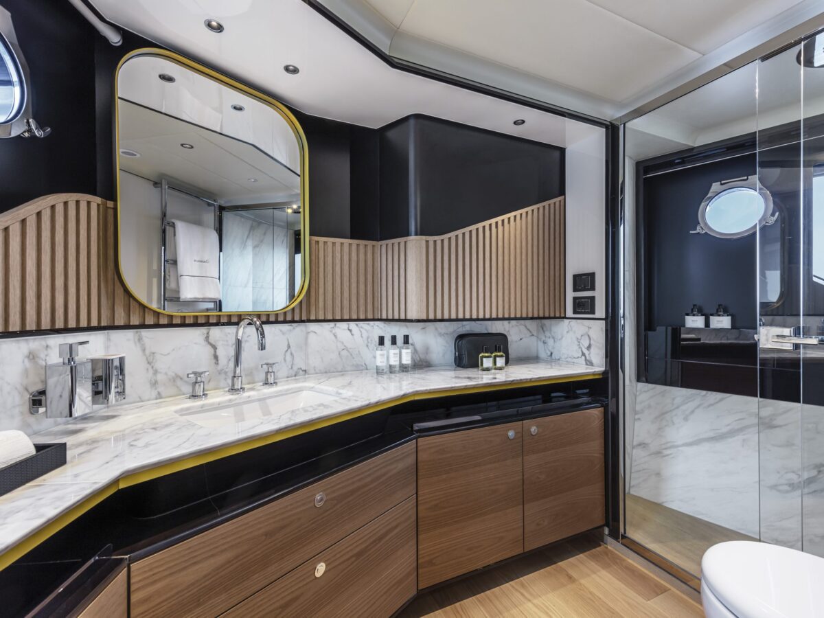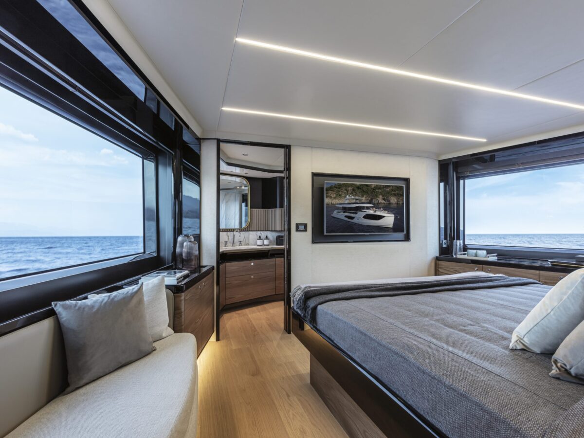 Cruising with guests for extended trips is a delight on the Absolute Navetta 64. The owner’s suite is placed in the bow for multiple reasons, including additional size, huge windows for great views, privacy, and quietness. The owner’s suite stretches the entire yacht beam and offers excellent storage opportunities. The en suite master bathroom is uniquely placed in the front of the bow area, resulting in more room, large windows with incomparable views, and, again, great storage.