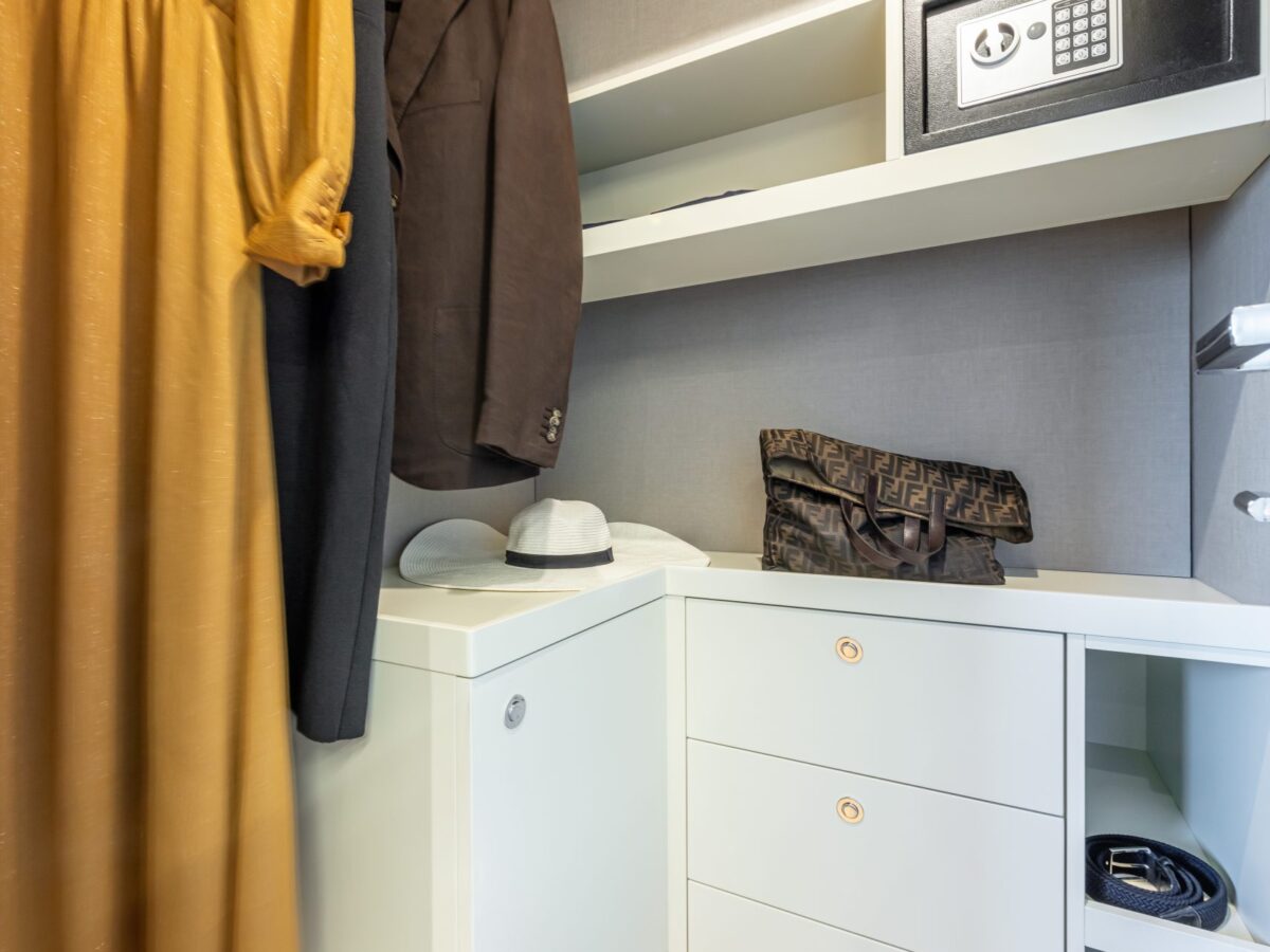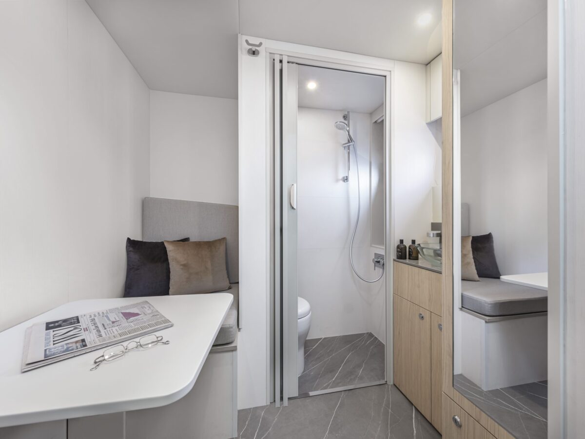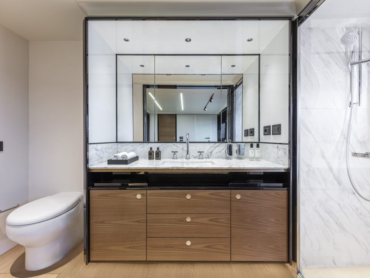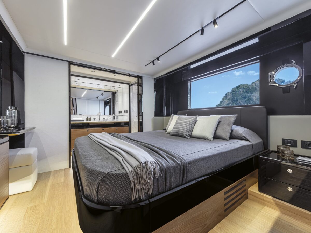 Cruising with guests for extended trips is a delight on the Absolute Navetta 64. The owner’s suite is placed in the bow for multiple reasons, including additional size, huge windows for great views, privacy, and quietness. The owner’s suite stretches the entire yacht beam and offers excellent storage opportunities. The en suite master bathroom is uniquely placed in the front of the bow area, resulting in more room, large windows with incomparable views, and, again, great storage.