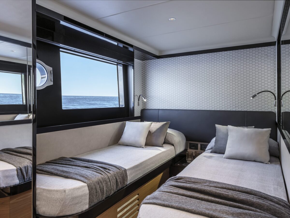 The VIP cabin is placed midship and offers a large double bed. This is, of course, in addition to the optional VIP cabin that can be placed in the transom area. The main VIP stateroom has a massive portside window and an en suite bathroom. The third guest cabin on the lower deck offers two twin beds and a bathroom that doubles as the day head on the boat via a separate entry.