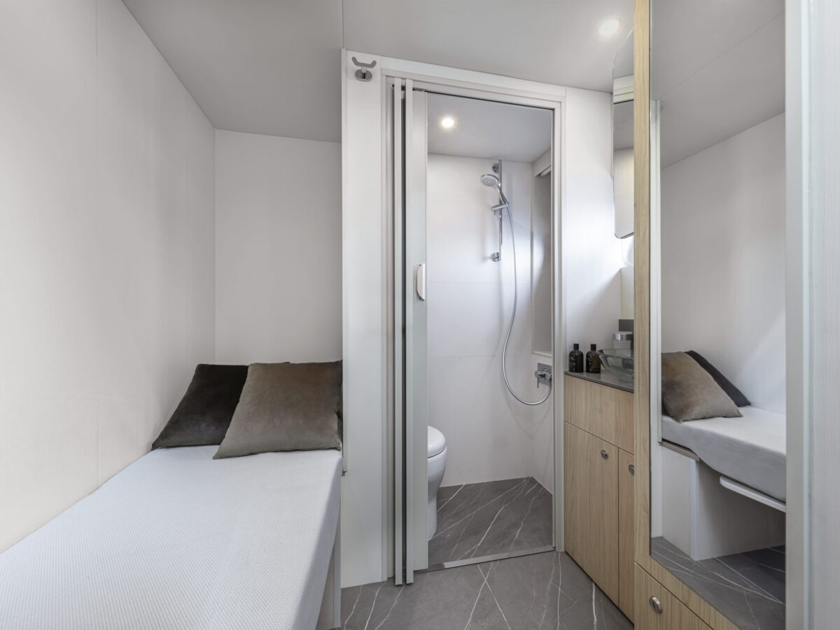 There is also a crew cabin on the Navetta 64, accessed via a door on the starboard side walkway. This allows the crew to move from the engine room to the aft platform without entering the salon. The crew space is adequate for a much larger boat, not an afterthought. Extra sound-absorbing material was also added surrounding the engine room and crew cabin so there is maximum privacy between the crew and the guests onboard.