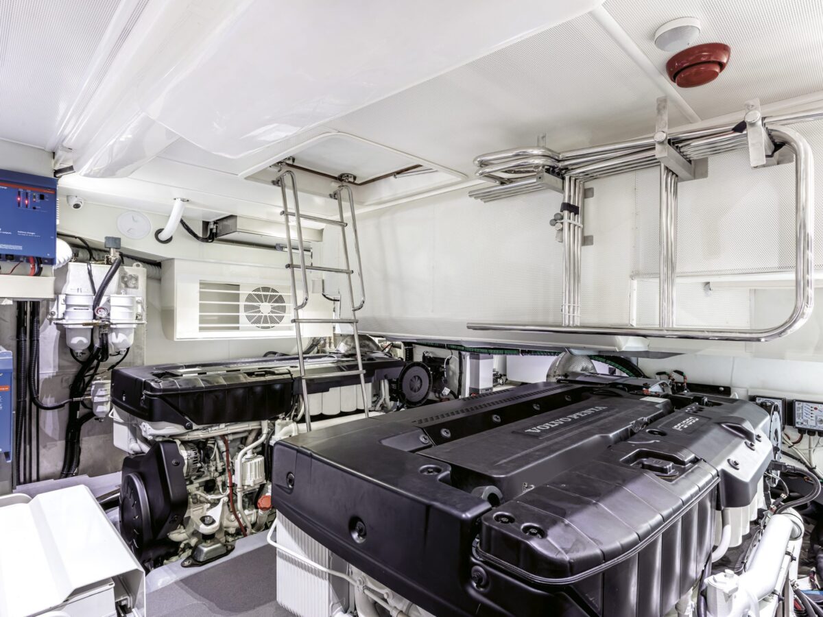 Thanks to the Volvo Penta D13 engines, you can expect an incredible ride with excellent fuel efficiency. Owners have the option of selecting either 1200HP or 1350HP engines, both within the IPS 30 range. Absolute recommends the 1200HP engines for regular boating. However, the 1350HP may be necessary should the owner choose to add a Gyro Stabilizer, heavy tenders, water toys, or have the maximum number of guests onboard frequently. For more details, click here.