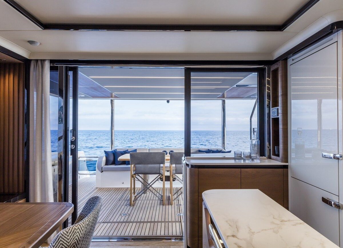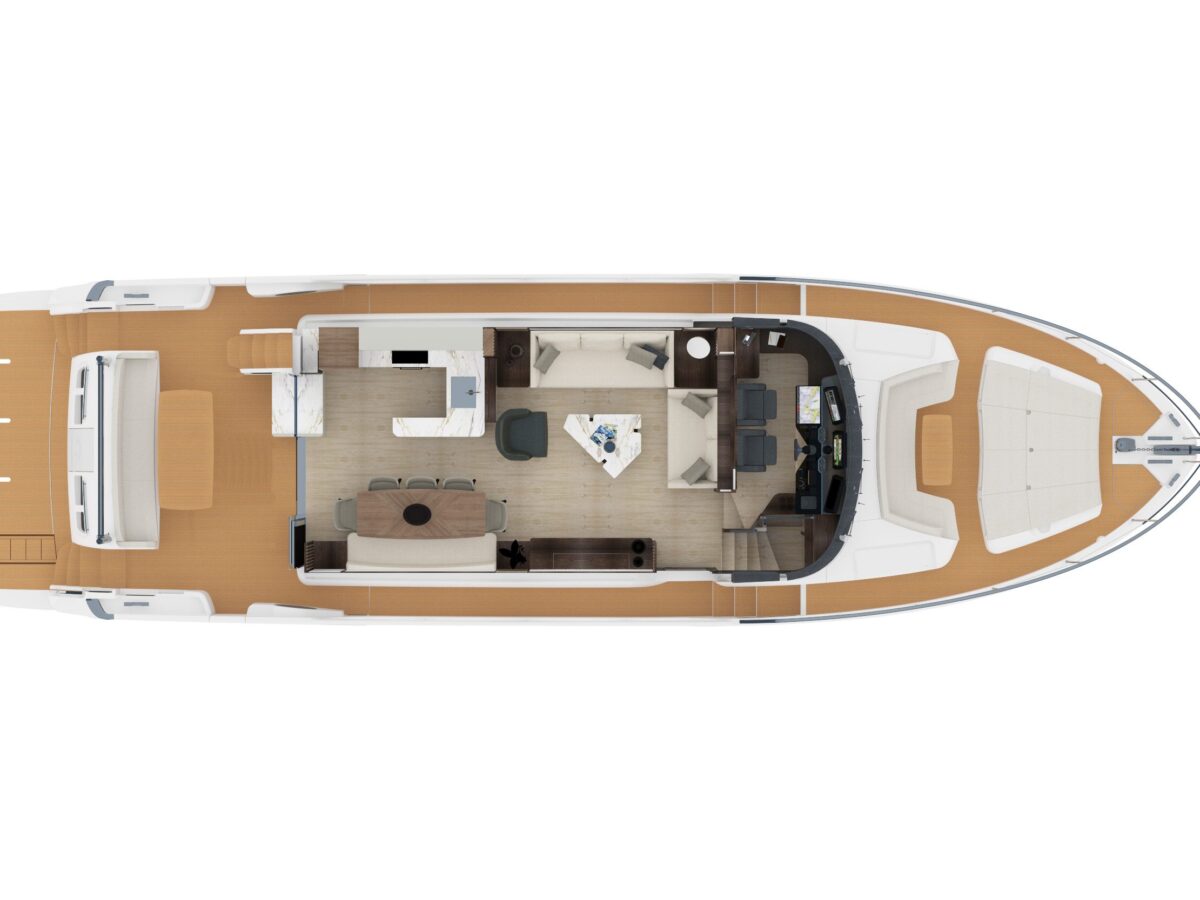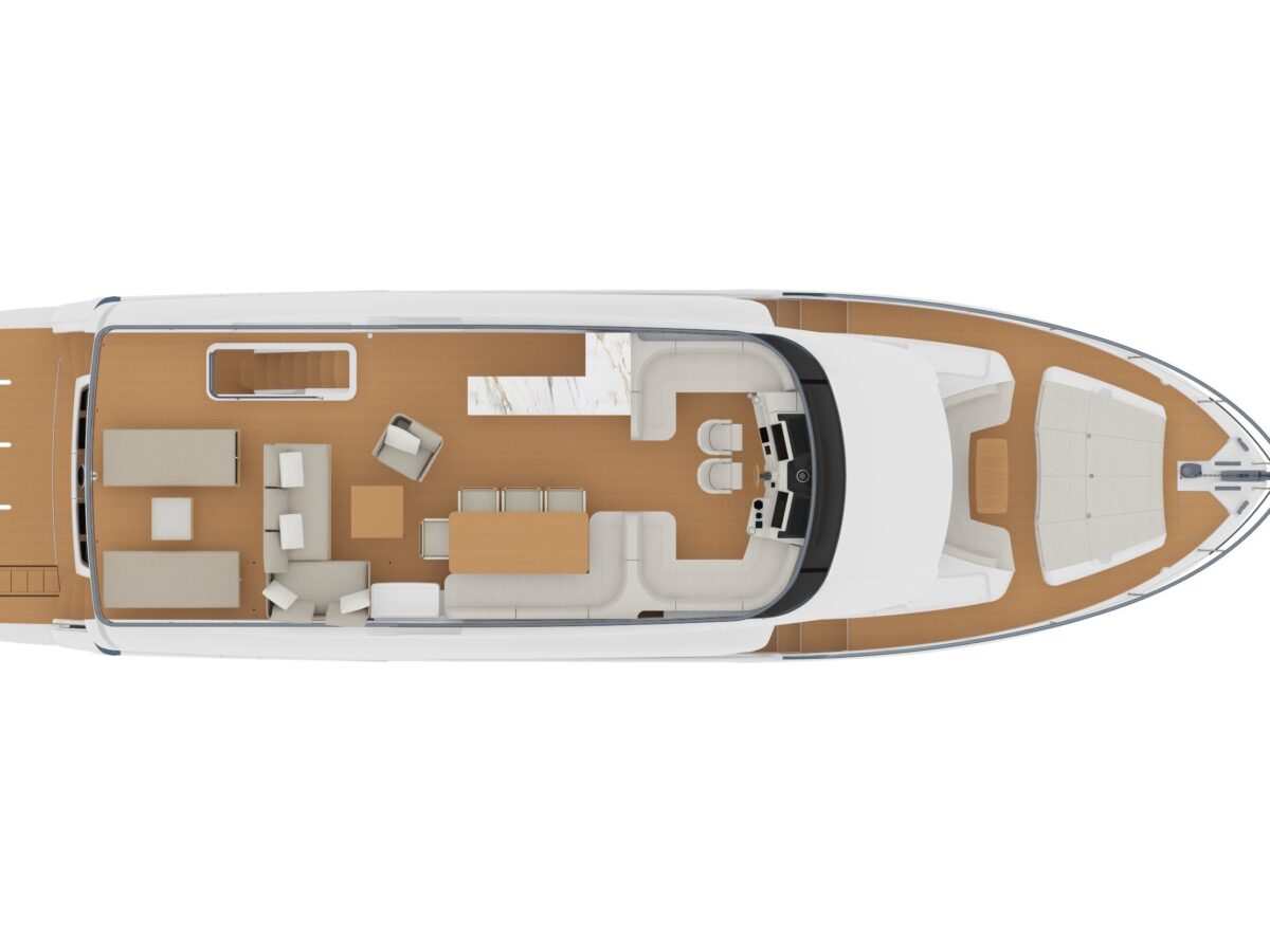outdoor galley, a dining table, and a helm station with adjoining sofas so the owner can navigate with guests nearby. Throughout, spaces are optimised by means of sliding doors, vertically sliding glazed panels, ample headroom, and lots of storage space so that everyone on the yacht can enjoy the very best of the marine