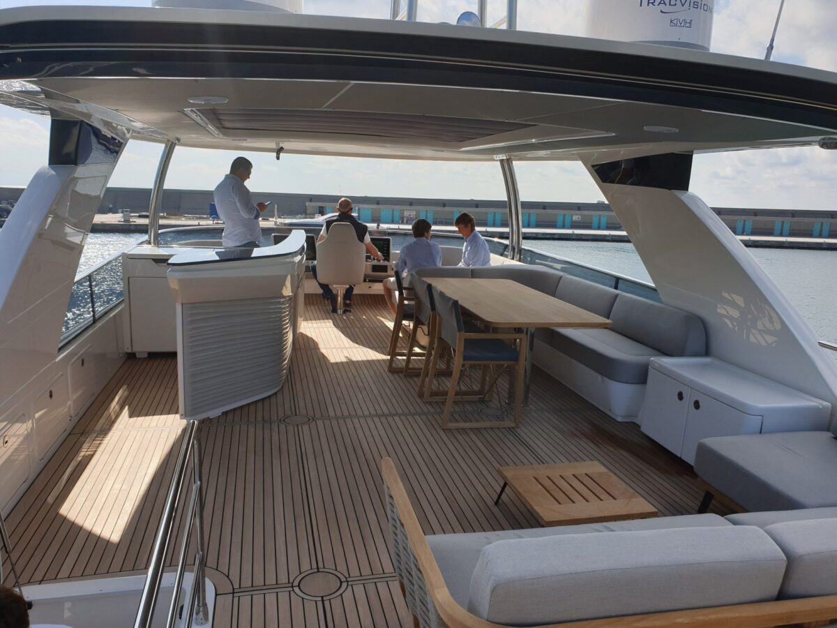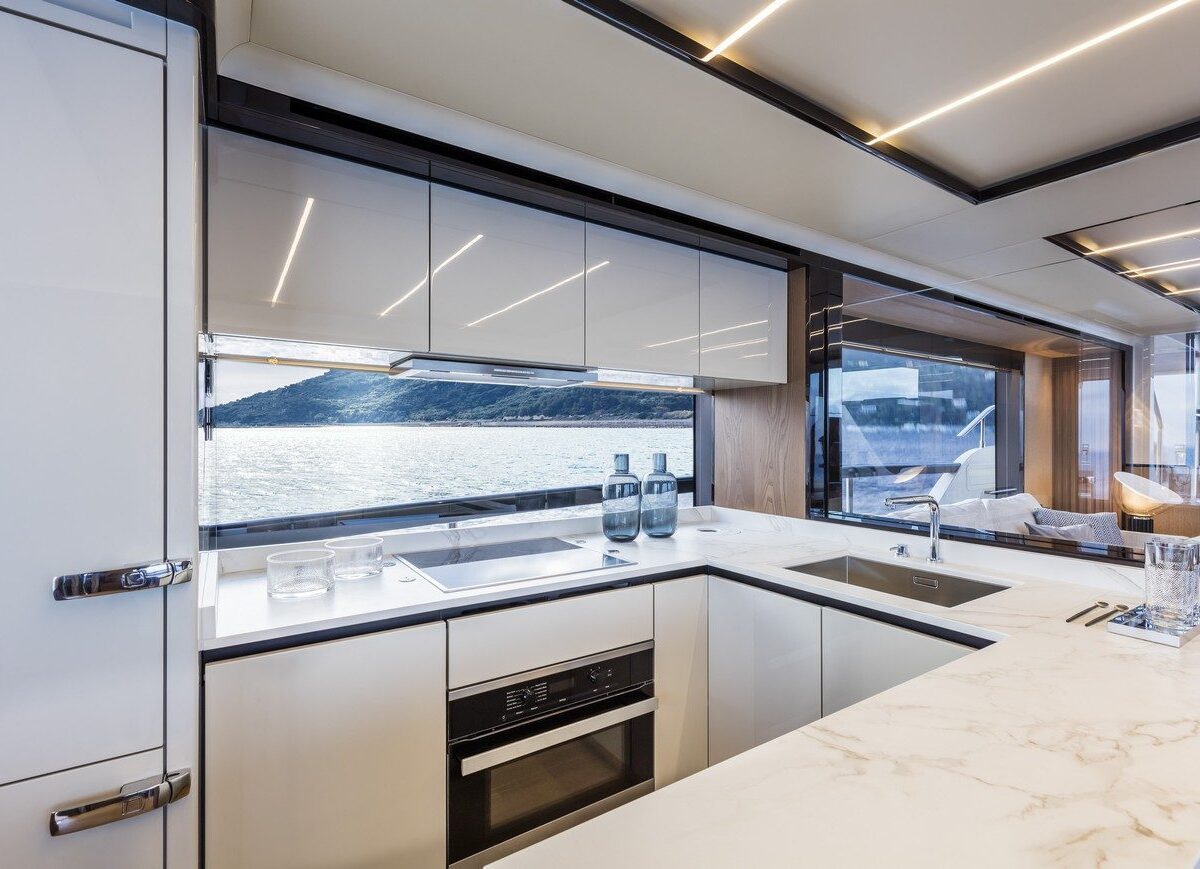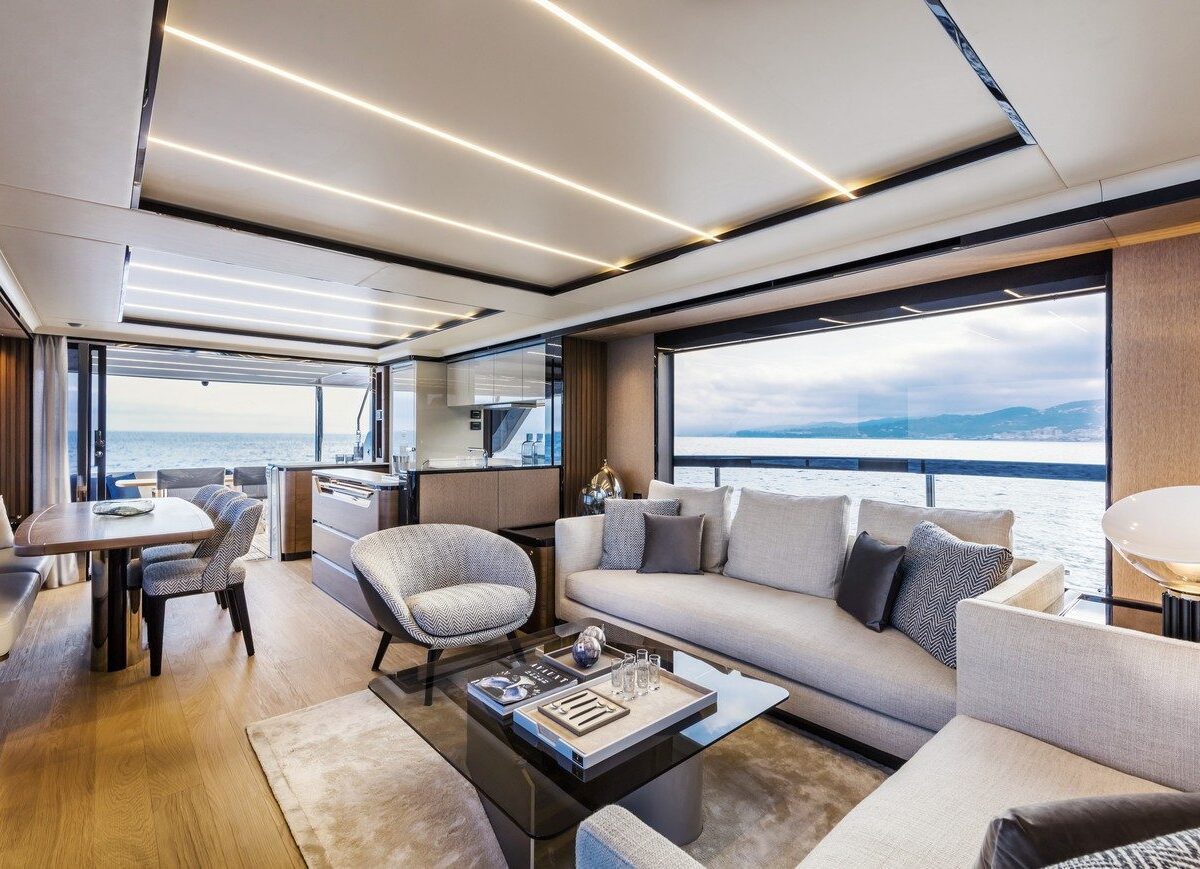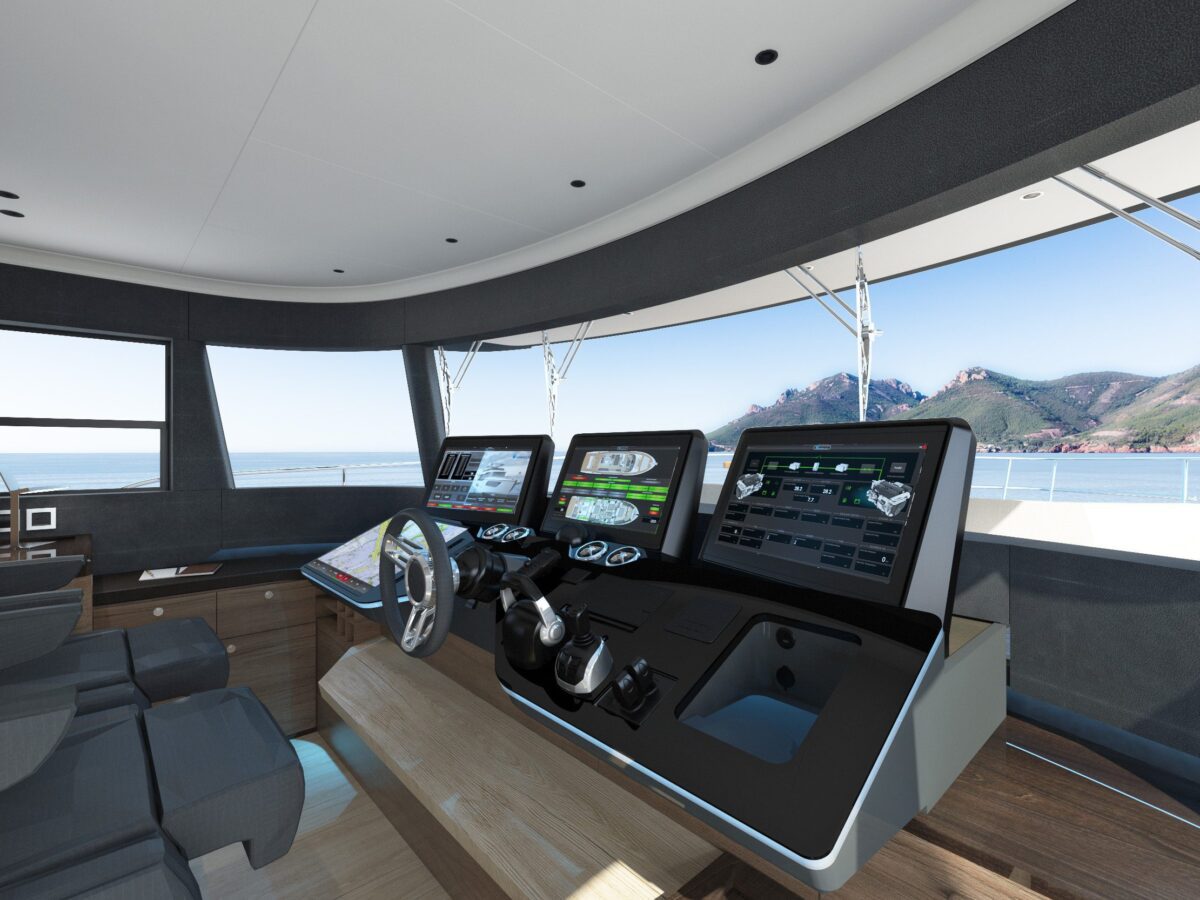 outdoor galley, a dining table, and a helm station with adjoining sofas so the owner can navigate with guests nearby. Throughout, spaces are optimised by means of sliding doors, vertically sliding glazed panels, ample headroom, and lots of storage space so that everyone on the yacht can enjoy the very best of the marine