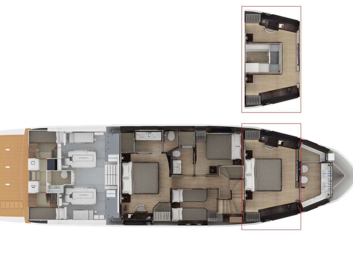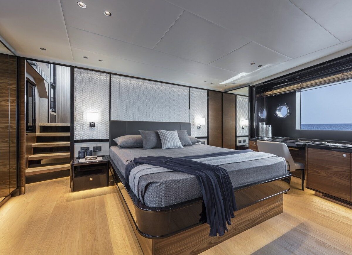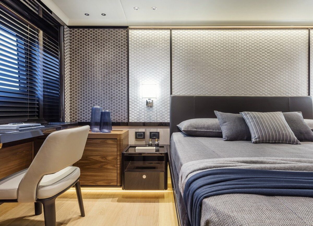 Navetta 68 – the Absolute Vision – transforms space into emotion, an effect that can be seen particularly below deck, where spaces are far larger than you would expect from a 68-foot yacht. The four staterooms include the master suite in the bows with two panoramic hull side windows, an en-suite bathroom with a double basin and a large, luxuriously fitted shower. All areas onboard, both interior and exterior, are designed for enjoying the sea in company. A settee and extendable table accompany the bow sun lounger; the flybridge has an