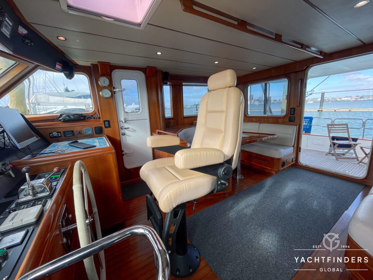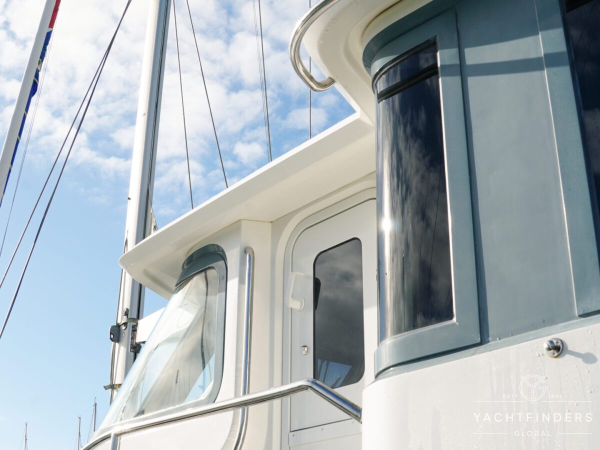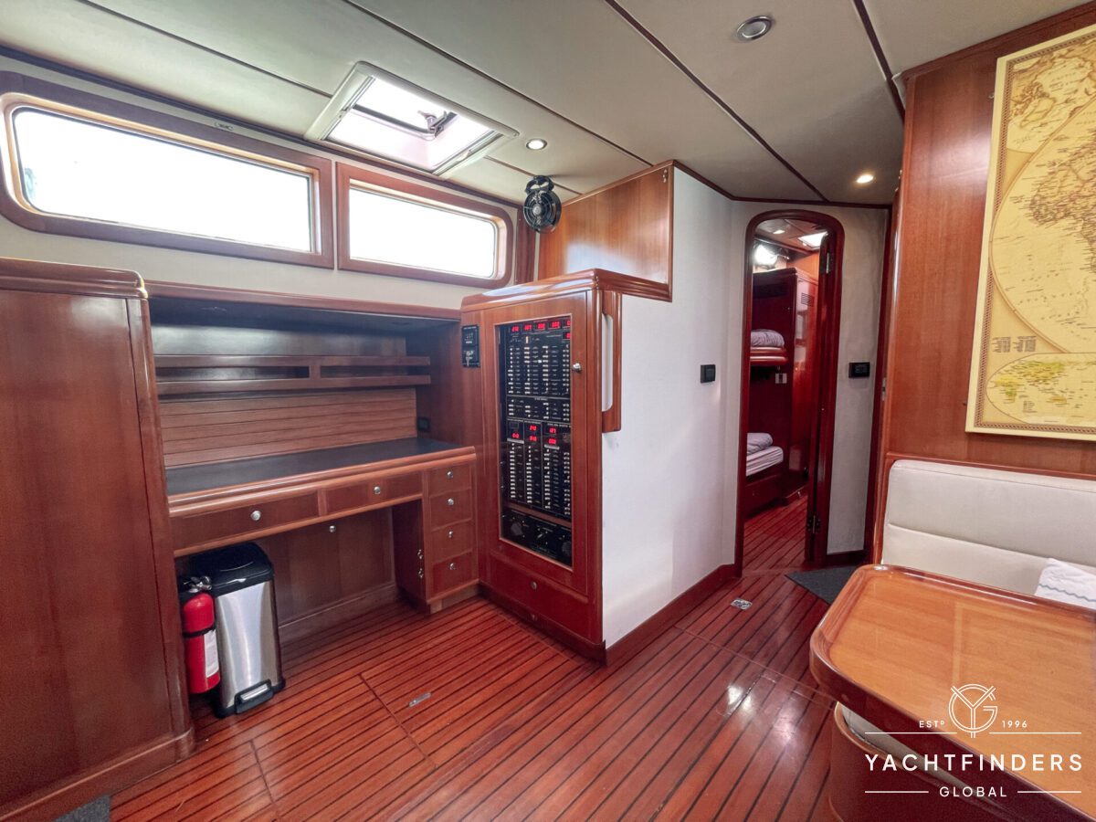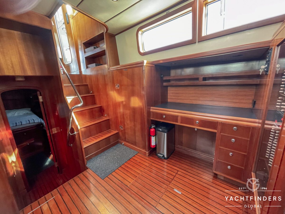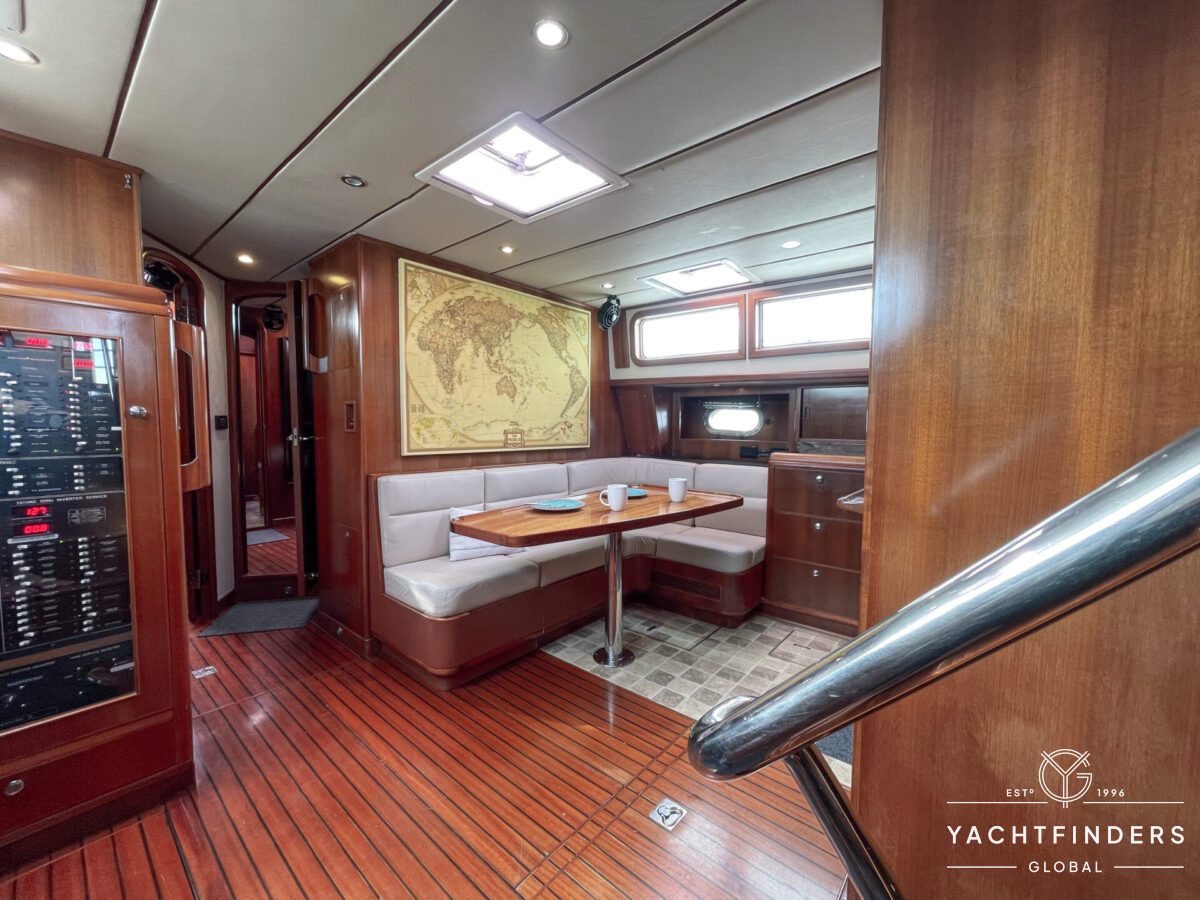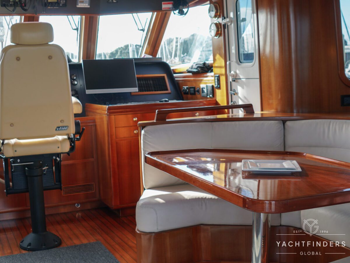 Embracing its hybrid nature, the vessel features a forward sailing cockpit, complete with a helm station and controls for powered winches and roller-furling sails. This sailing cockpit is seamlessly integrated alongside a trawler-style saloon and wheelhouse, creating a harmonious space for relaxation and navigation—a spacious aft deck rounds out the vessel’s trawler-inspired touches.