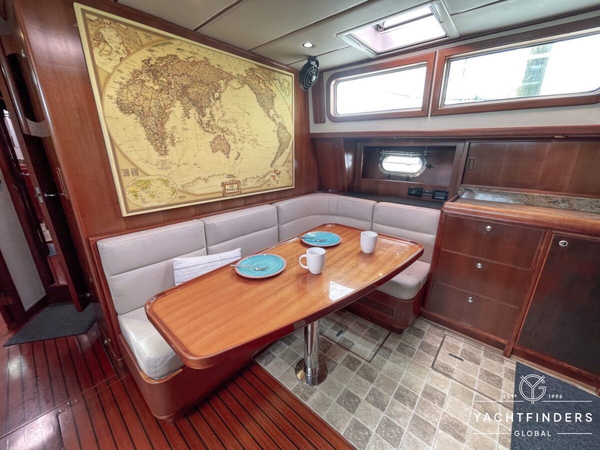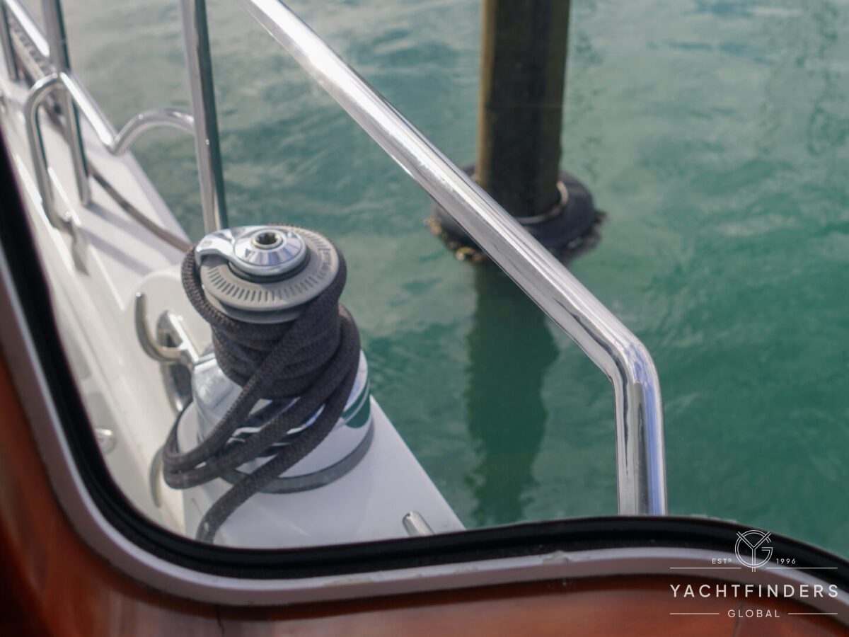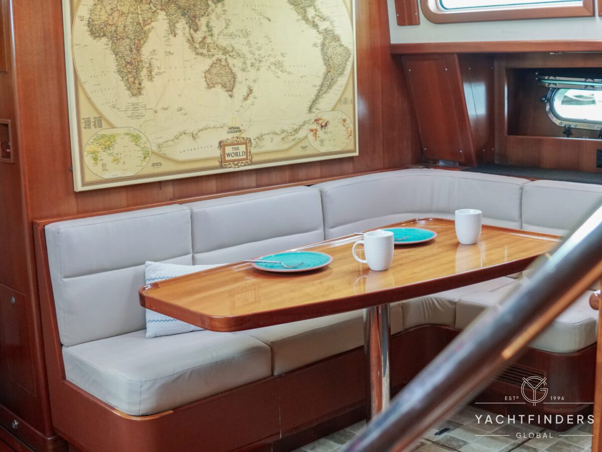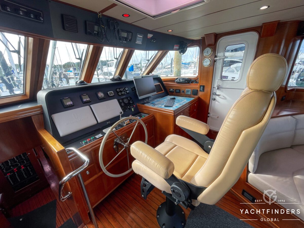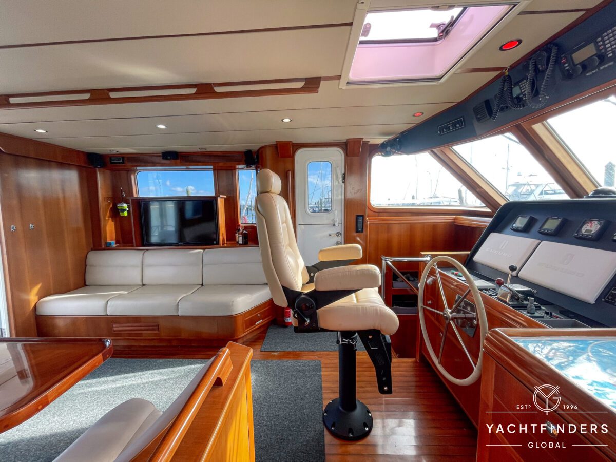 Embracing its hybrid nature, the vessel features a forward sailing cockpit, complete with a helm station and controls for powered winches and roller-furling sails. This sailing cockpit is seamlessly integrated alongside a trawler-style saloon and wheelhouse, creating a harmonious space for relaxation and navigation—a spacious aft deck rounds out the vessel’s trawler-inspired touches.