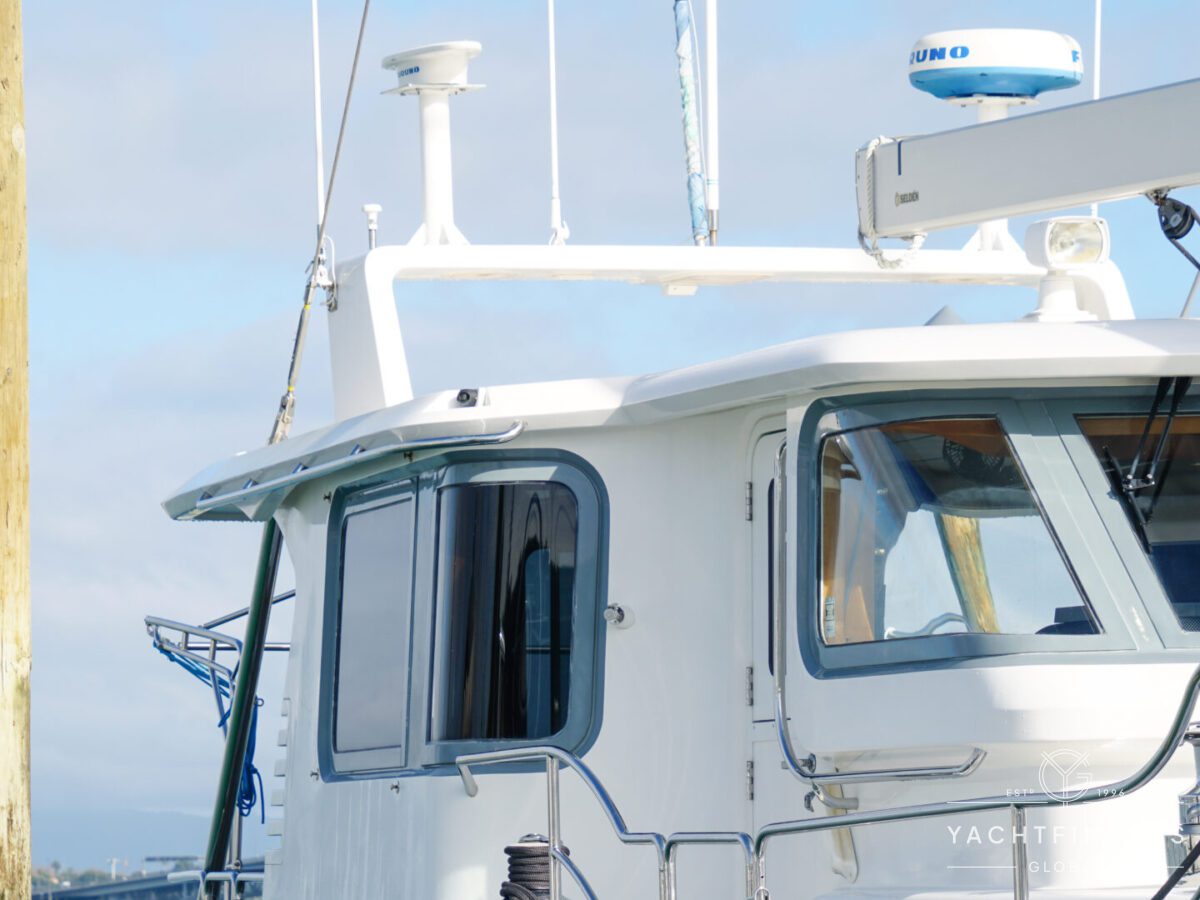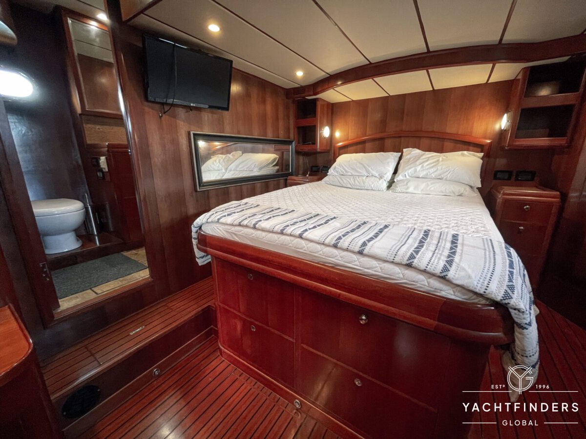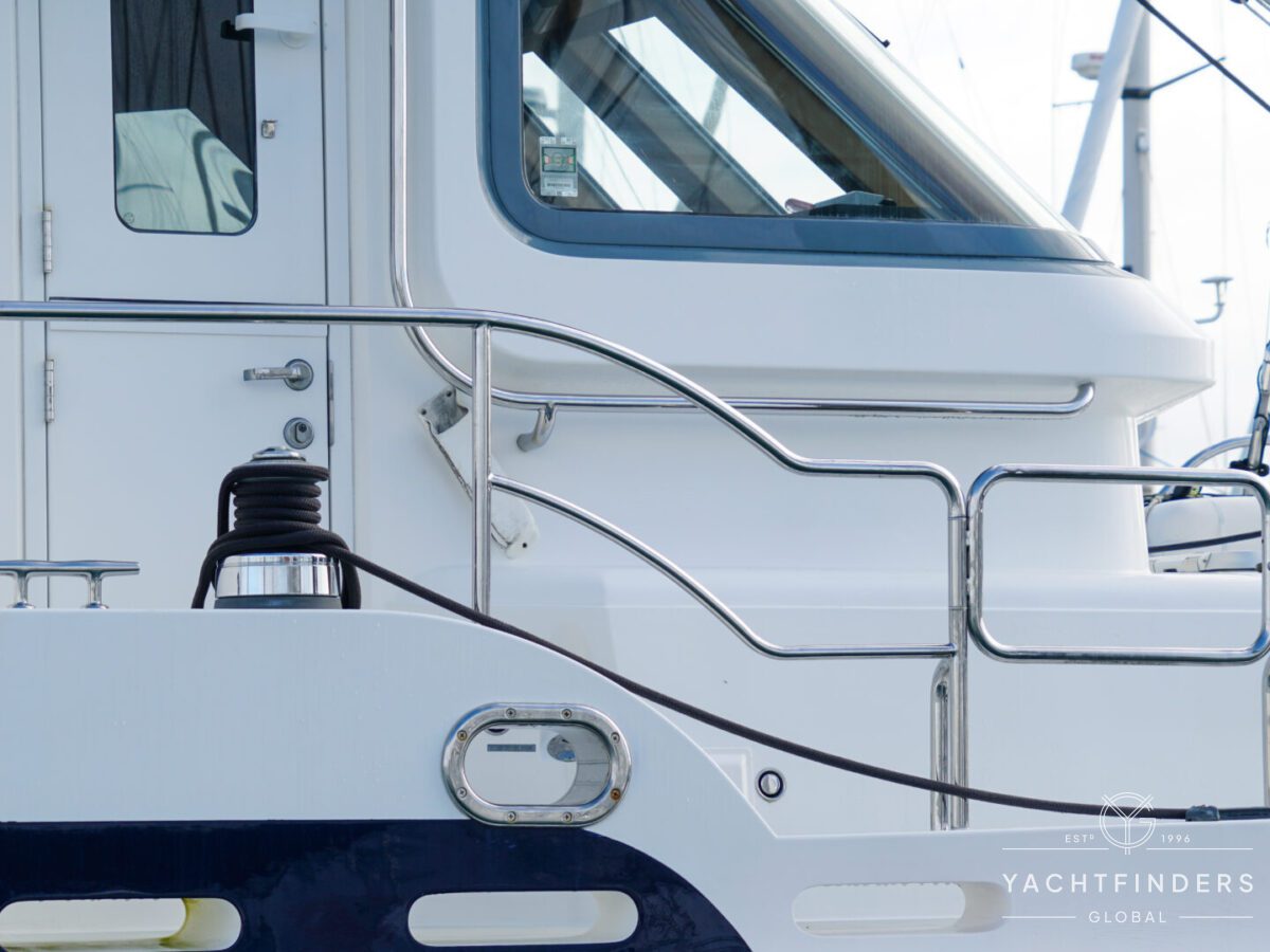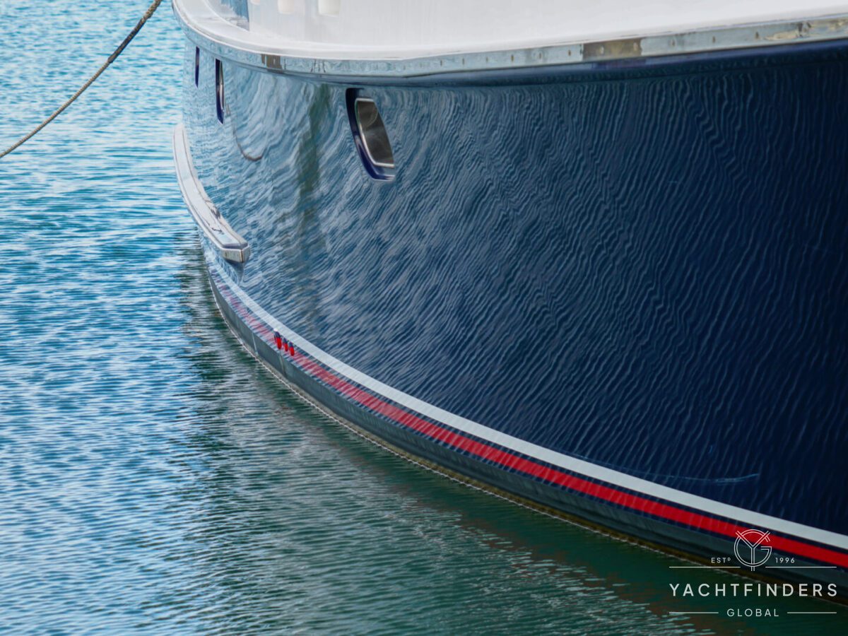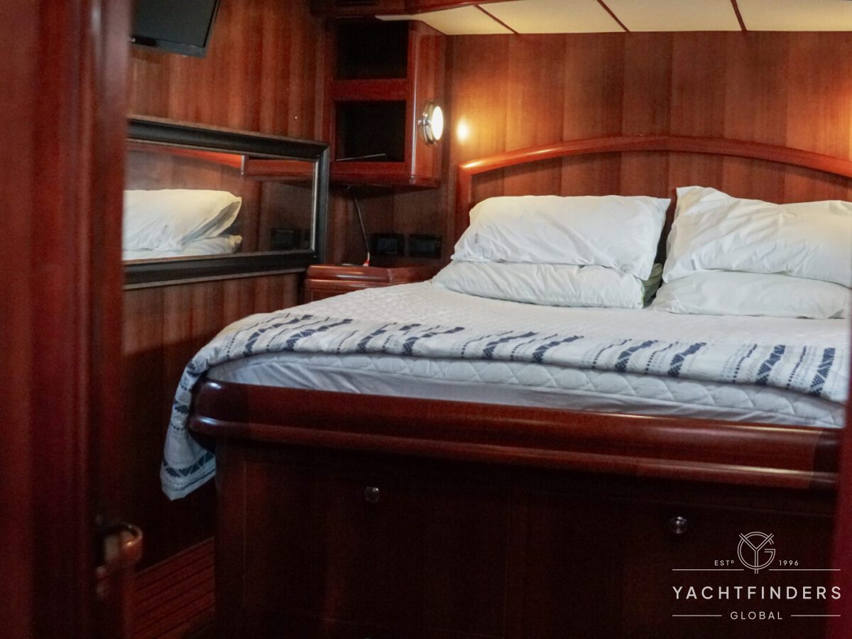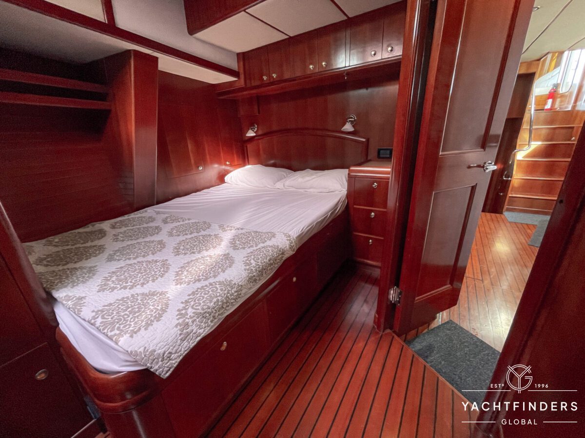 Embracing its hybrid nature, the vessel features a forward sailing cockpit, complete with a helm station and controls for powered winches and roller-furling sails. This sailing cockpit is seamlessly integrated alongside a trawler-style saloon and wheelhouse, creating a harmonious space for relaxation and navigation—a spacious aft deck rounds out the vessel’s trawler-inspired touches.