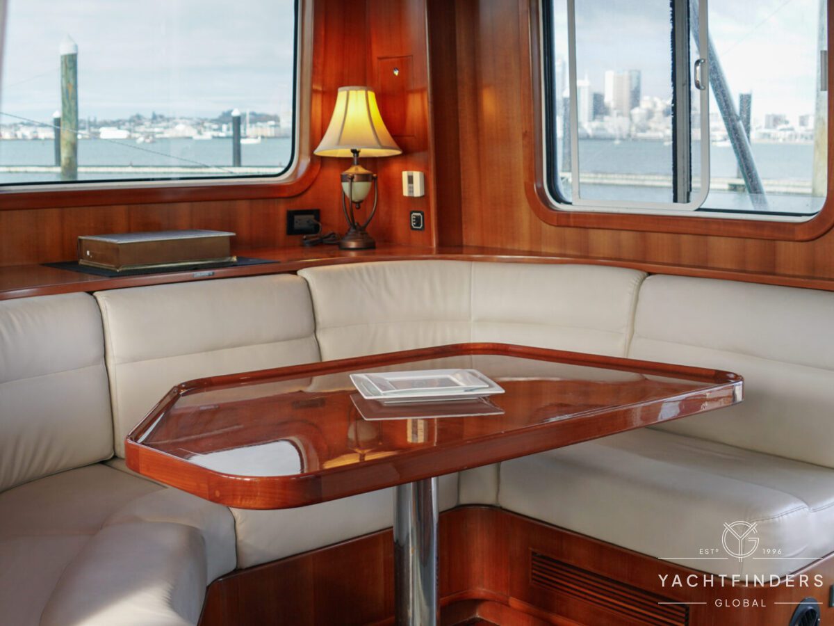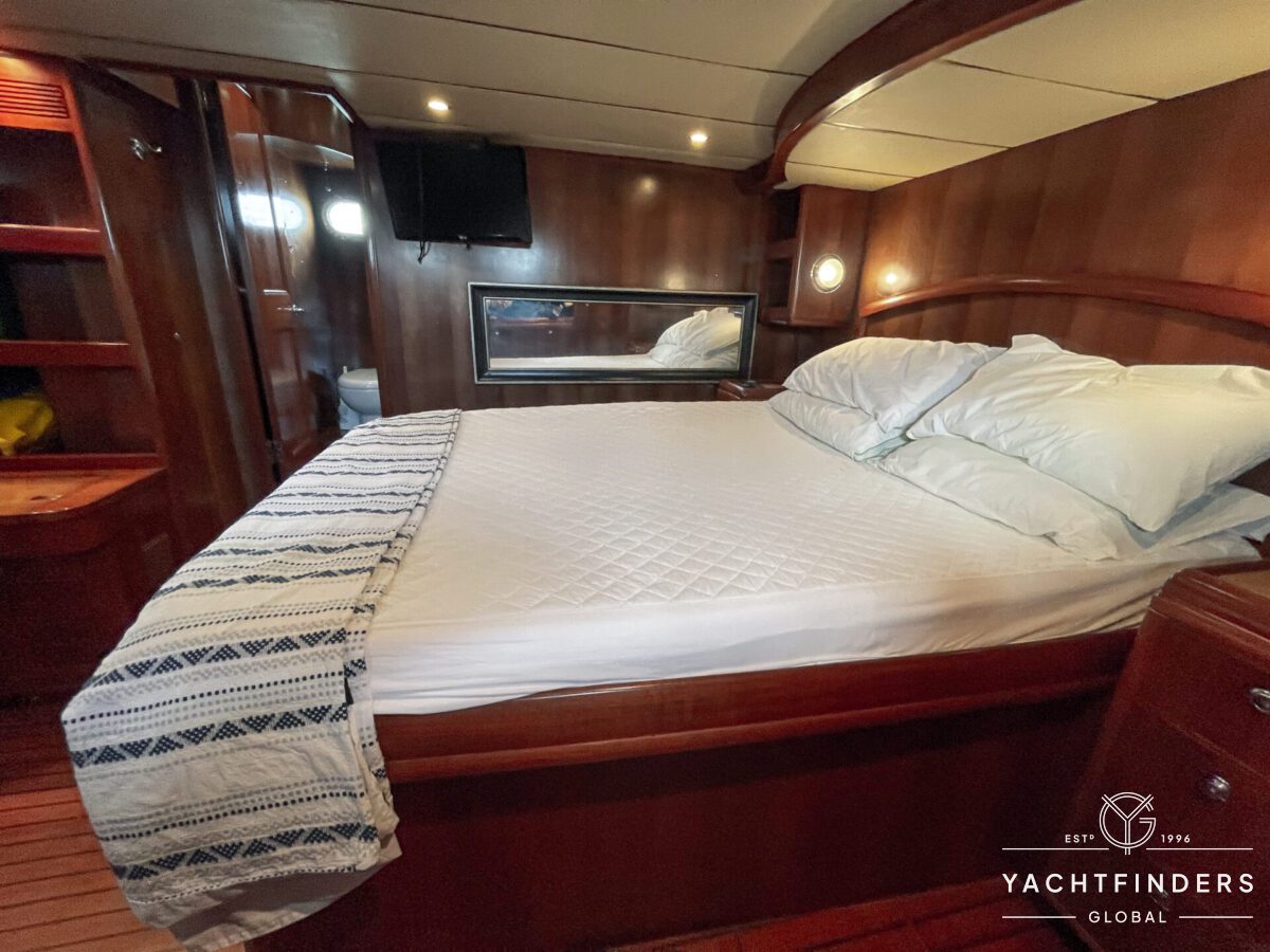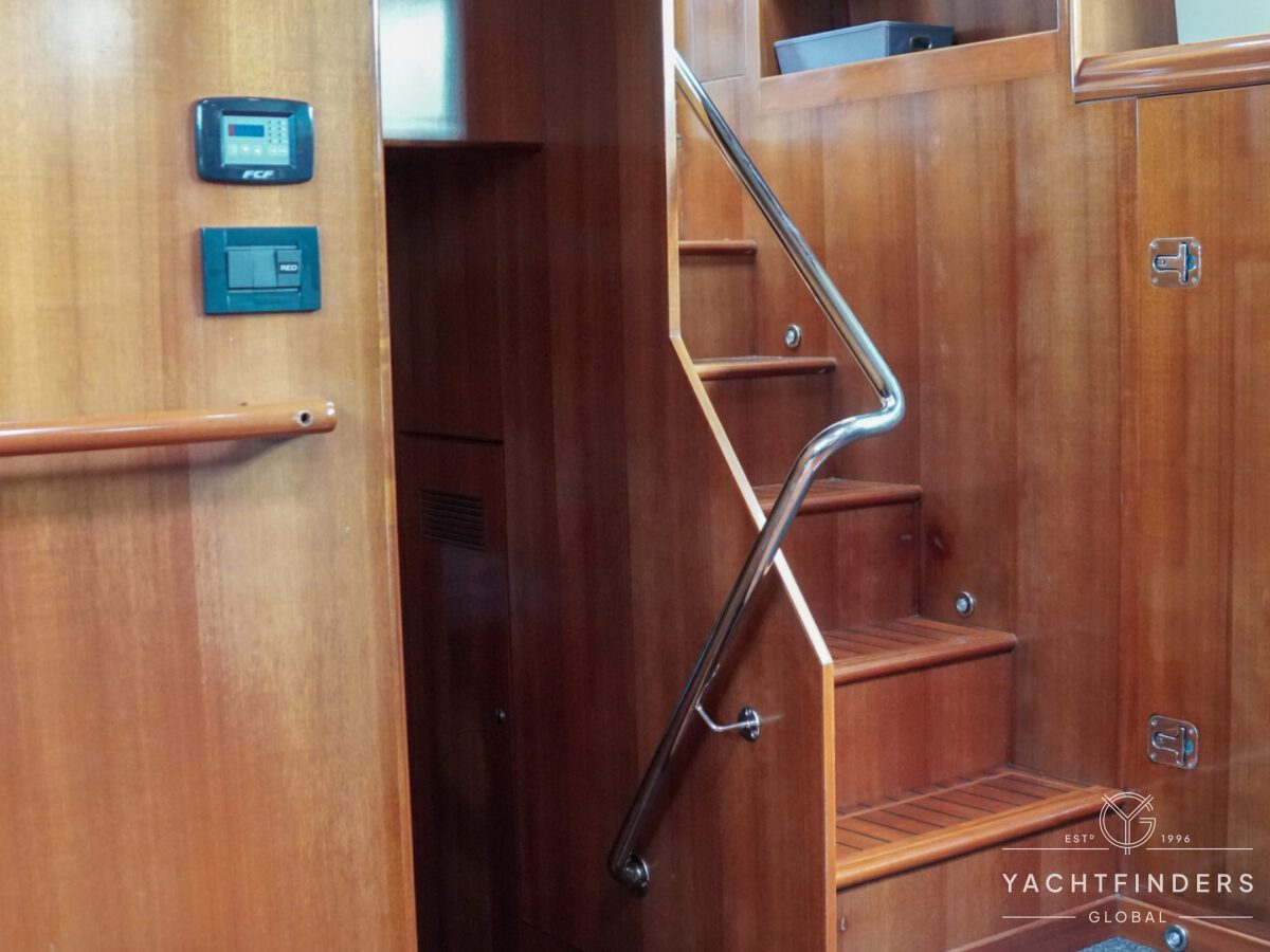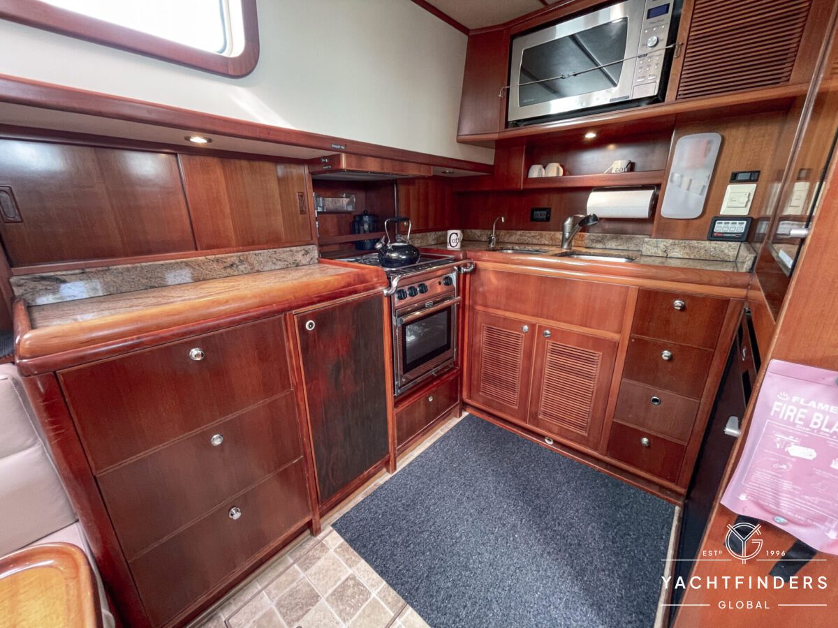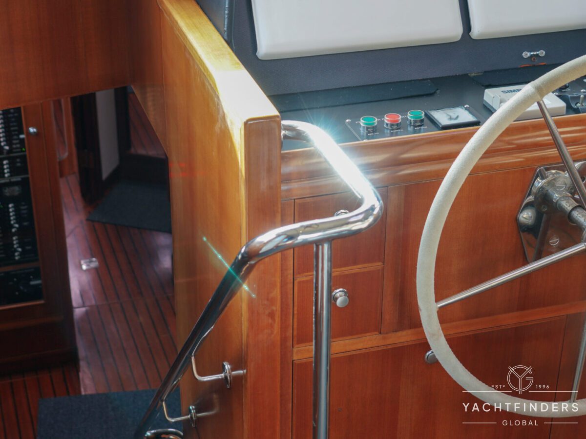 Embracing its hybrid nature, the vessel features a forward sailing cockpit, complete with a helm station and controls for powered winches and roller-furling sails. This sailing cockpit is seamlessly integrated alongside a trawler-style saloon and wheelhouse, creating a harmonious space for relaxation and navigation—a spacious aft deck rounds out the vessel’s trawler-inspired touches.