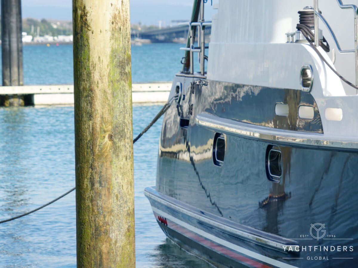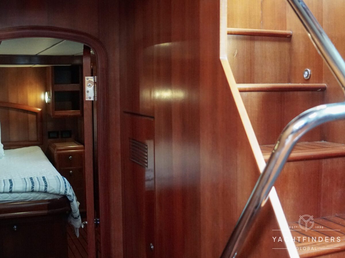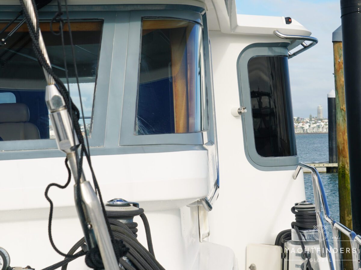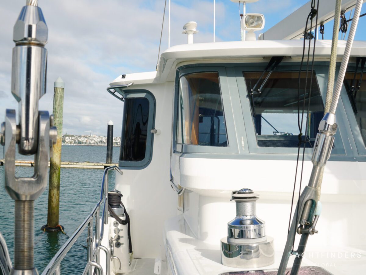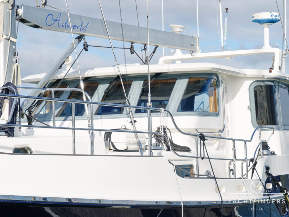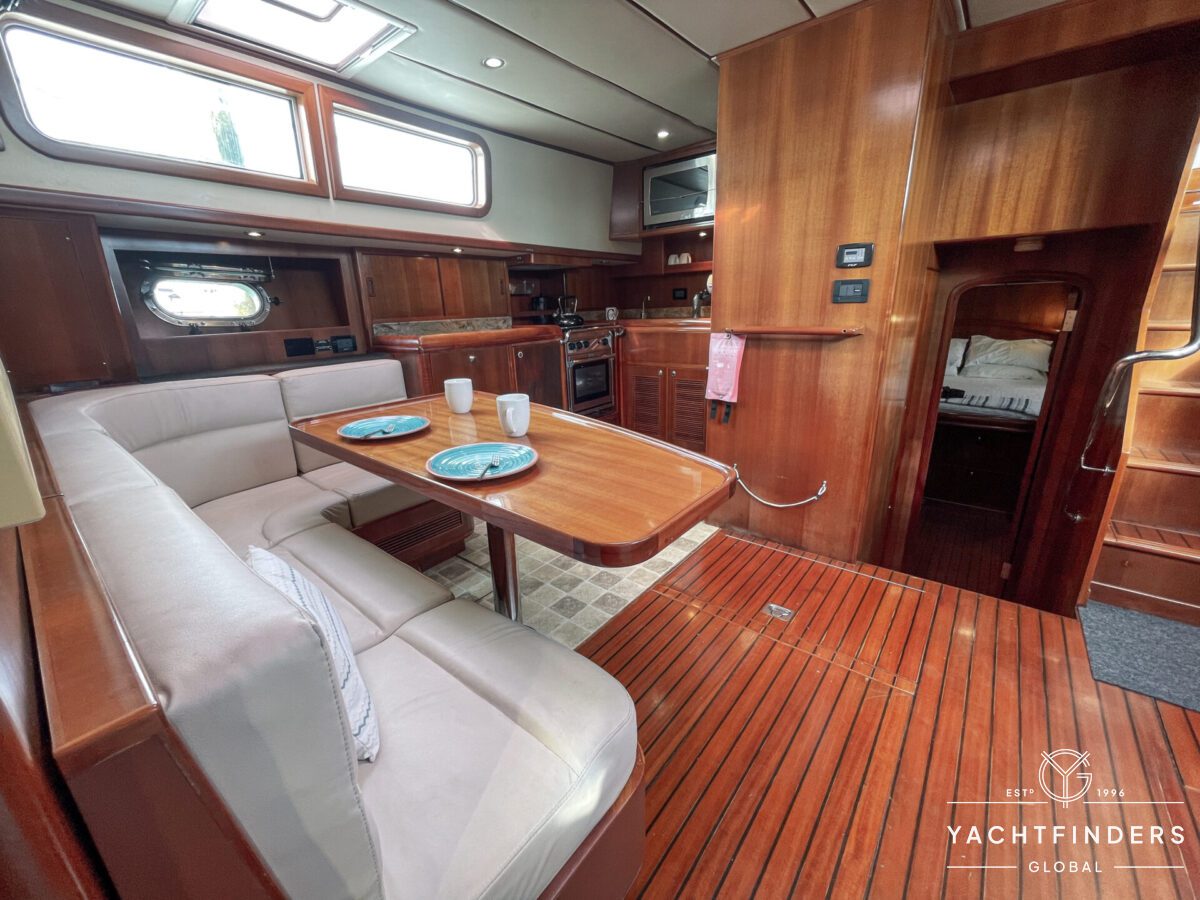 Embracing its hybrid nature, the vessel features a forward sailing cockpit, complete with a helm station and controls for powered winches and roller-furling sails. This sailing cockpit is seamlessly integrated alongside a trawler-style saloon and wheelhouse, creating a harmonious space for relaxation and navigation—a spacious aft deck rounds out the vessel’s trawler-inspired touches.