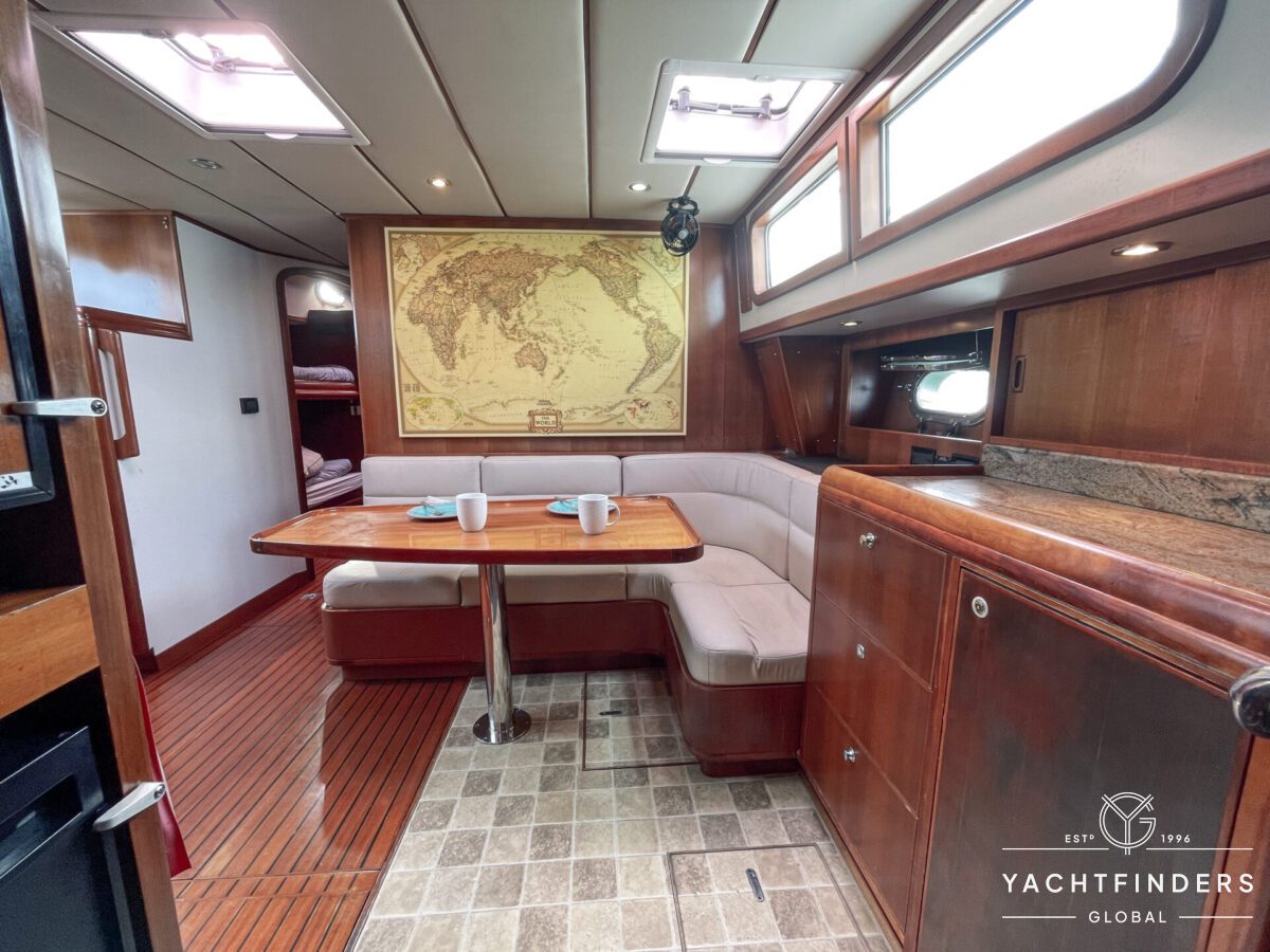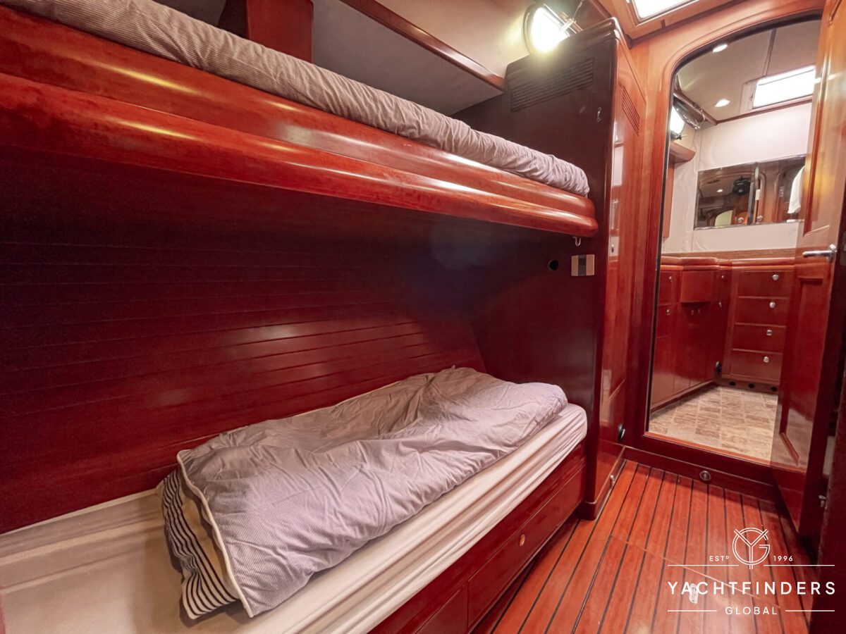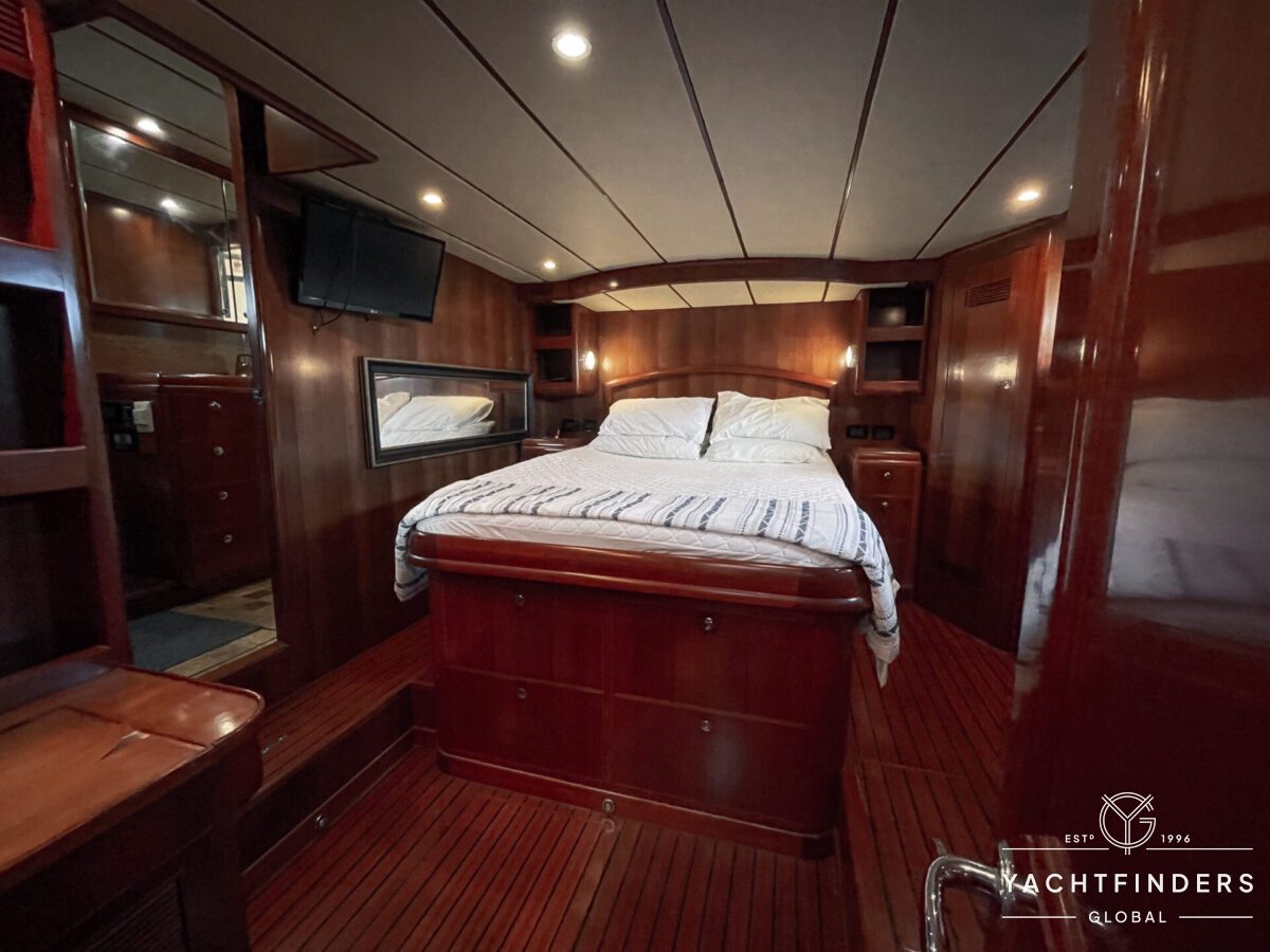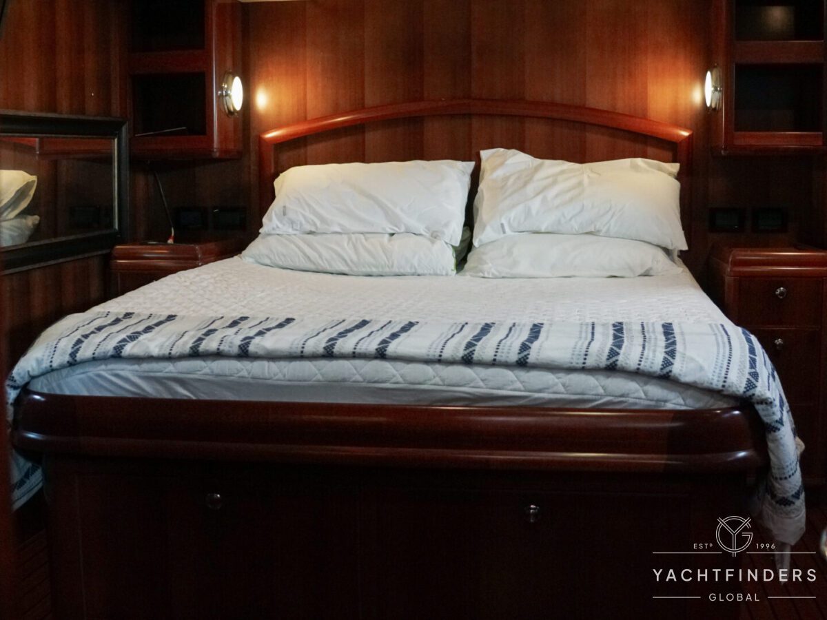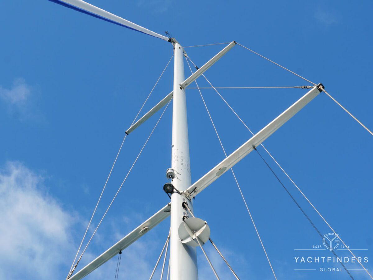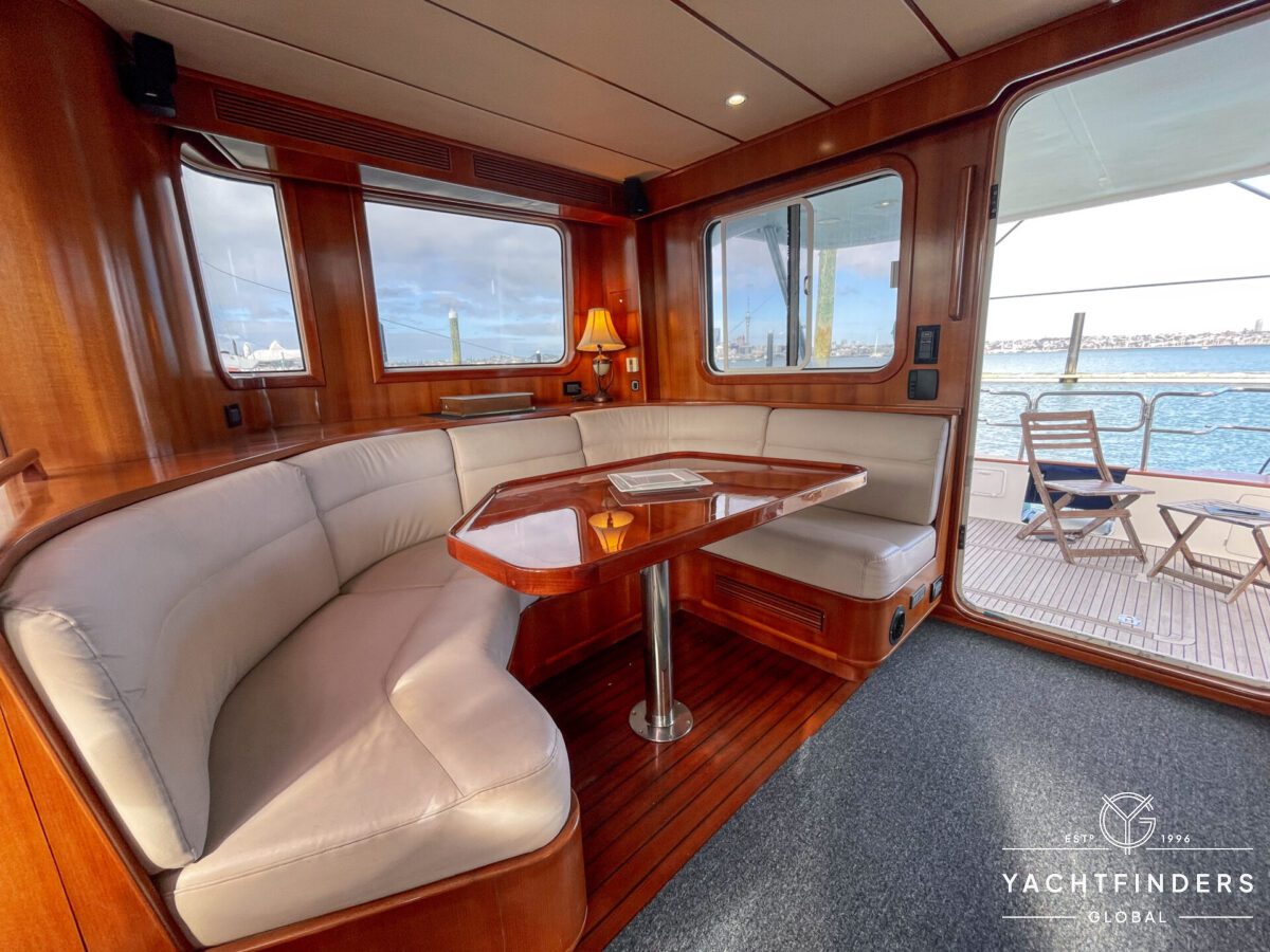Embracing its hybrid nature, the vessel features a forward sailing cockpit, complete with a helm station and controls for powered winches and roller-furling sails. This sailing cockpit is seamlessly integrated alongside a trawler-style saloon and wheelhouse, creating a harmonious space for relaxation and navigation—a spacious aft deck rounds out the vessel’s trawler-inspired touches.