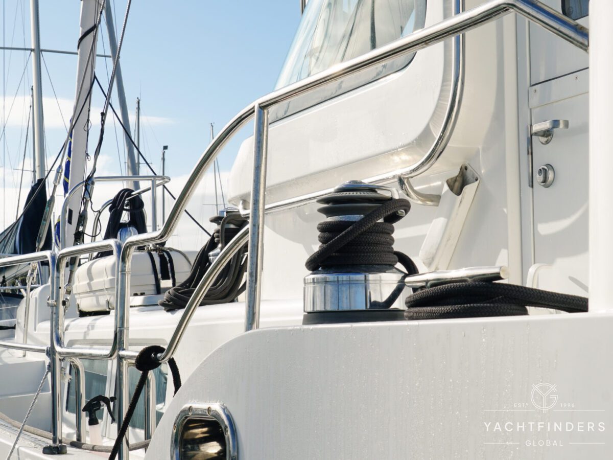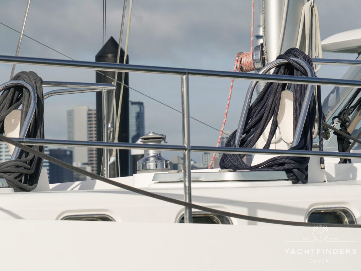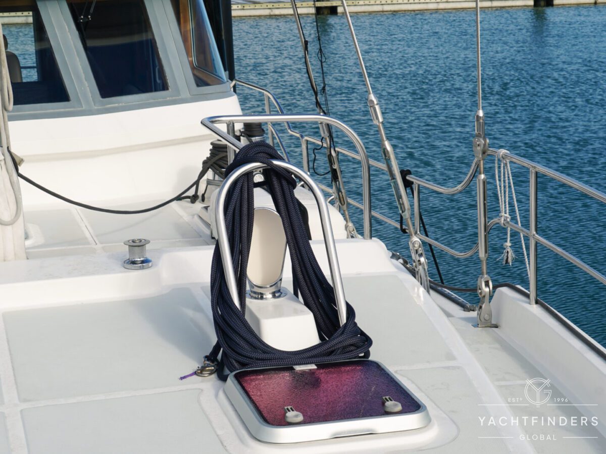 The forward deck is easily navigable on either side of the mast and leads to the bow, where functional elements, such as the chain locker and sail locker, can be accessed via a forward hatch. Behind the mast lies the elegant sailing cockpit, complete with seating that surrounds the steering binnacle—a space designed for both practicality and leisure.