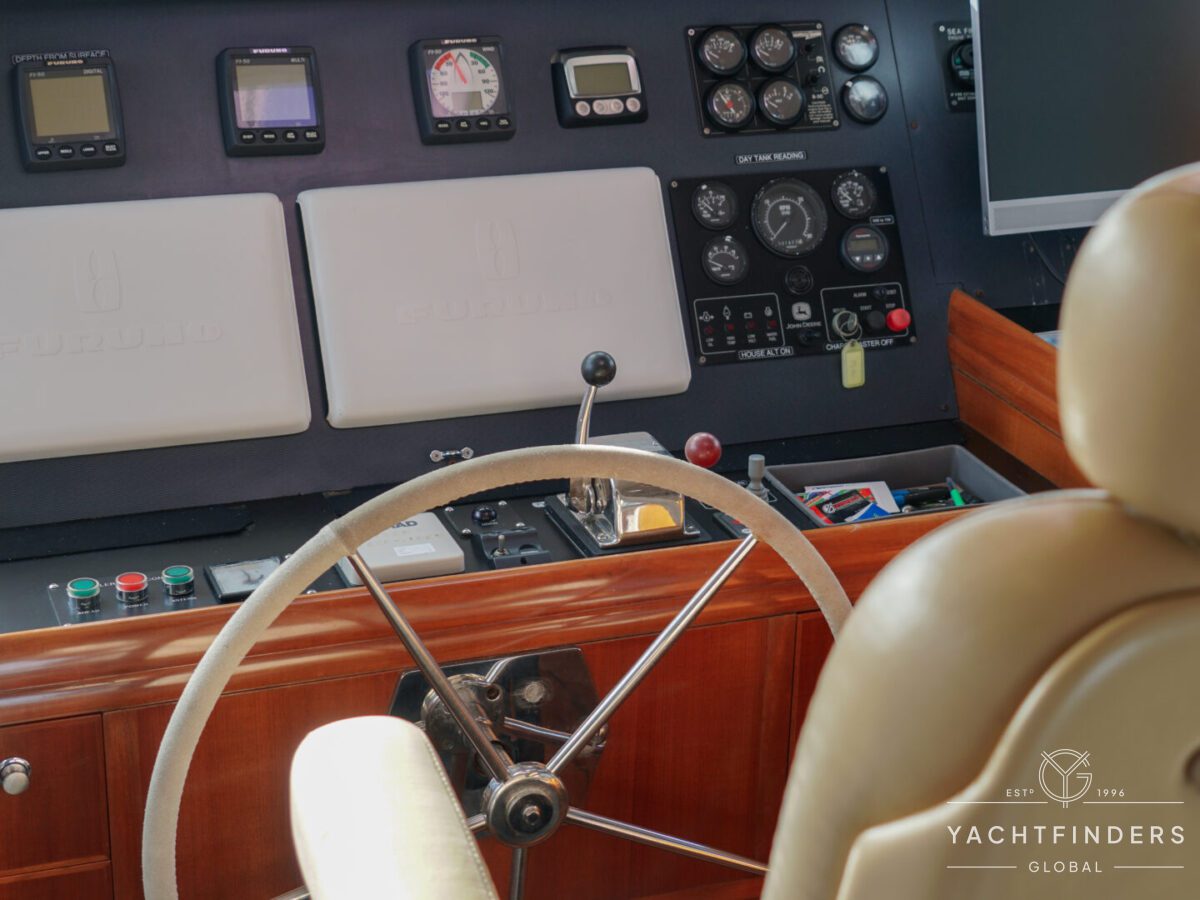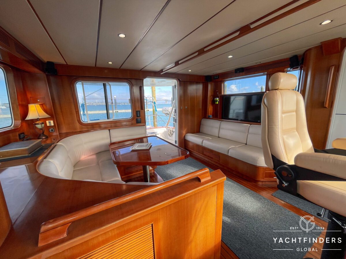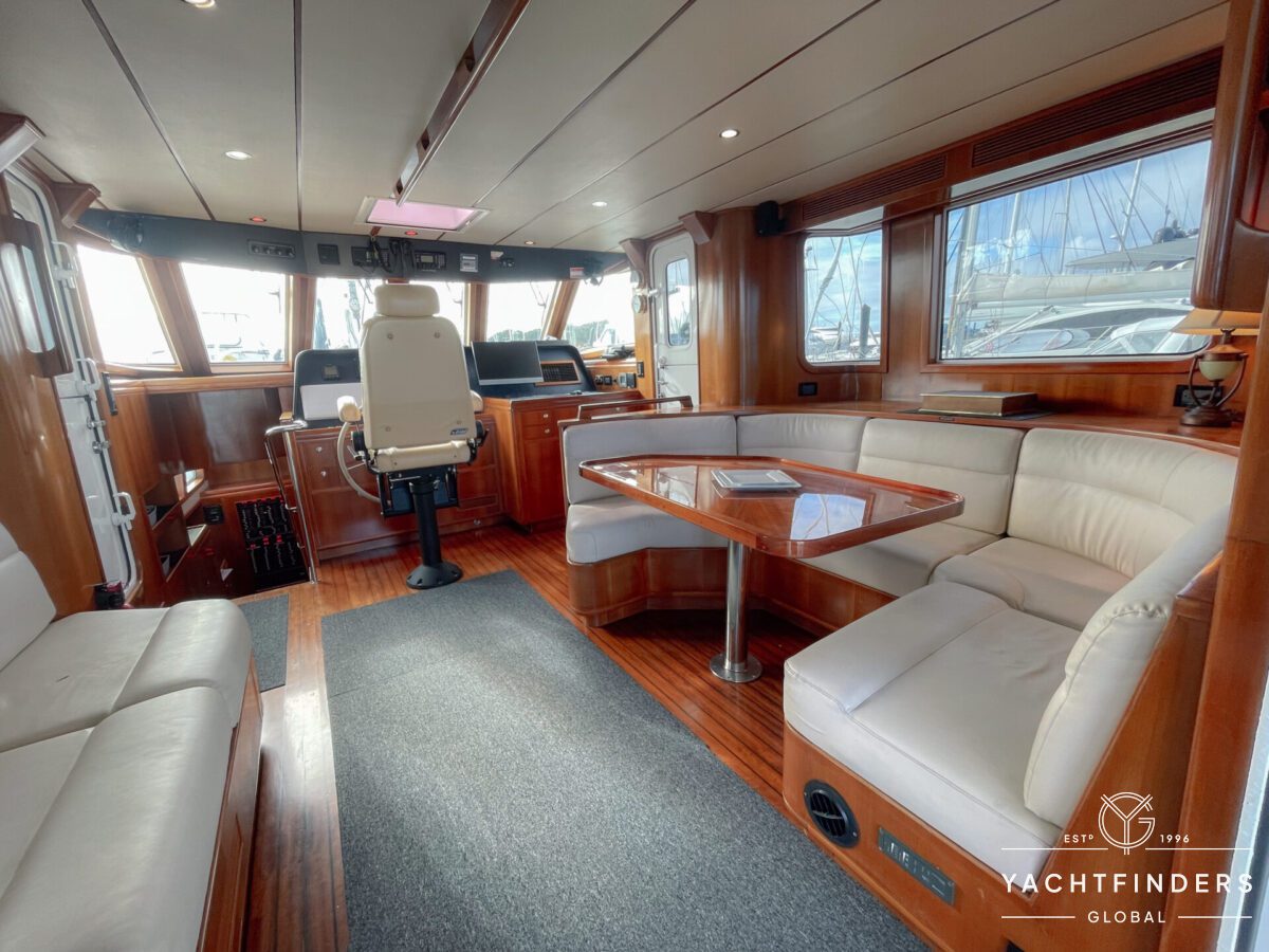 The saloon transitions seamlessly into the pilothouse, which features a single helm chair and a large chart table for navigation purposes. Smartly equipped panels display navigation and instrumentation controls, and port and starboard pilothouse doors provide direct access to the foredeck and forward sailing cockpit.